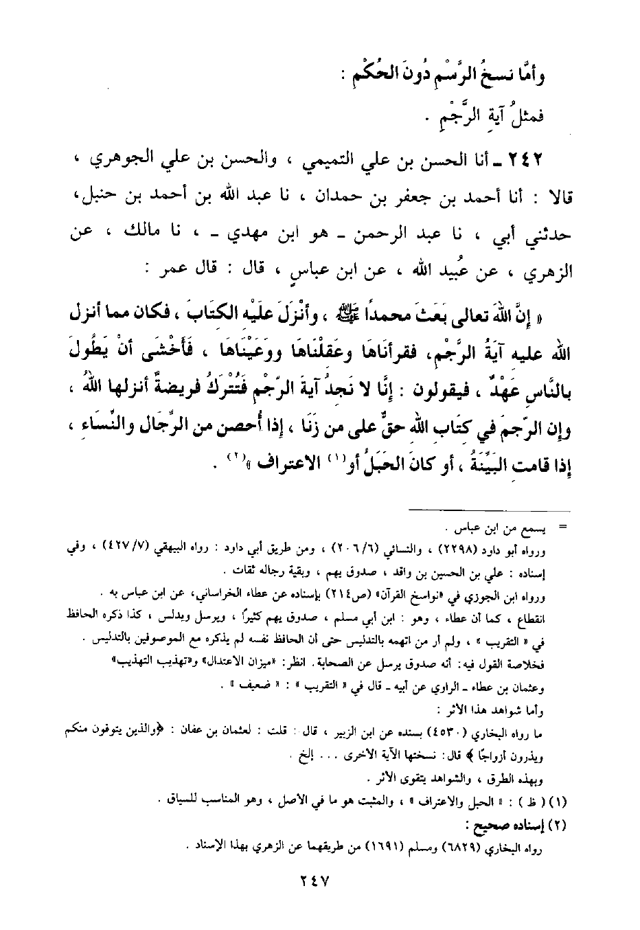 أنا الْحَسَنُ بْنُ عَلِيٍّ التَّمِيمِيُّ , وَالْحَسَنُ بْنُ عَلِيٍّ الْجَوْهَرِيُّ , قَالَا: أنا أَحْمَدُ بْنُ جَعْفَرِ بْنِ حَمْدَانَ , نا عَبْدُ اللَّهِ بْنُ أَحْمَدَ بْنِ حَنْبَلٍ , حَدَّثَنِي أَبِي , نا عَبْدُ الرَّحْمَنِ هُوَ ابْنُ مَهْدِيٍّ , نا مَالِكٌ , عَنِ الزُّهْرِيِّ , عَنْ عُبَيْدِ اللَّهِ , عَنِ ابْنِ عَبَّاسٍ , قَالَ: قَالَ عُمَرُ: " إِنَّ اللَّهَ تَعَالَى بَعَثَ مُحَمَّدًا صَلَّى اللهُ عَلَيْهِ وَسَلَّمَ , وَأَنْزَلَ عَلَيْهِ الْكِتَابَ , فَكَانَ مِمَّا أَنْزَلَ اللَّهُ عَلَيْهِ آيَةُ الرَّجْمِ , فَقَرَأْنَاهَا وَعَقَلْنَاهَا وَوَعَيْنَاهَا , فَأَخْشَى أَنْ يَطُولَ بِالنَّاسِ عَهْدٌ , فَيَقُولُونَ: إِنَّا لَا نَجِدُ آيَةَ الرَّجْمِ فَتُتْرَكُ فَرِيضَةٌ أَنْزَلَهَا اللَّهُ , وَإِنَّ الرَّجْمَ فِي كِتَابِ اللَّهِ حَقٌّ عَلَى مَنْ زَنَا , إِذَا أُحْصِنَ مِنَ الرِّجَالِ وَالنِّسَاءِ إِذَا قَامَتِ الْبَيِّنَةُ , أَوْ كَانَ الْحَبَلُ أَوِ الِاعْتِرَافُ "