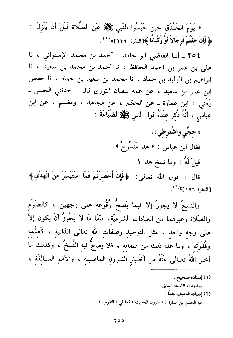 أنا الْقَاضِي أَبُو حَامِدٍ , أَحْمَدُ بْنُ مُحَمَّدٍ الْإِسْتِوَائِيُّ , نا عَلِيُّ بْنُ عُمَرَ بْنِ أَحْمَدَ الْحَافِظُ , نا أَحْمَدُ بْنُ مُحَمَّدِ بْنِ سَعِيدٍ , نا إِبْرَاهِيمُ بْنُ الْوَلِيدِ بْنِ حَمَّادٍ , نا مُحَمَّدُ بْنُ سَعِيدِ بْنِ حَمَّادٍ , نا حَفْصُ بْنُ عُمَرَ بْنِ سَعِيدٍ , عَنْ عَمِّهِ سُفْيَانَ الثَّوْرِيِّ قَالَ: حَدَّثَنِي الْحَسَنُ يَعْنِي ابْنَ عُمَارَةَ - عَنِ الْحَكَمِ , عَنْ مُجَاهِدٍ , ومِقَسِّمٍ , عَنِ ابْنِ عَبَّاسٍ , أَنَّهُ ذَكَرَ عِنْدَهُ قَوْلَ النَّبِيِّ صَلَّى اللهُ عَلَيْهِ وَسَلَّمَ لِضُبَاعَةَ: «حُجِّي وَاشْتَرِطِي» فَقَالَ ابْنُ عَبَّاسٍ: هَذَا مَنْسُوخٌ قِيلَ لَهُ: وَمَا نَسَخَ هَذَا؟ قَالَ: قَوْلُ اللَّهِ تَعَالَى: {فَإِنْ أُحْصِرْتُمْ فَمَا اسْتَيْسَرَ مِنَ الْهَدْيِ} [البقرة: ١٩٦] وَالنَّسْخُ لَا يَجُوزُ إِلَّا فِيمَا يَصِحُّ وقُوعُهُ عَلَى وَجْهَيْنِ , كَالصَّوْمِ وَالصَّلَاةِ وَغَيْرِهِمَا مِنَ الْعِبَادَاتِ الشَّرْعِيَّةِ , فَأَمَّا مَا لَا يَجُوزُ أَنْ يَكُونَ إِلَّا عَلَى وَجْهٍ وَاحِدٍ , مِثْلُ التَّوْحِيدِ وَصِفَاتِ اللَّهِ تَعَالَى الذَّاتِيَّةِ , كَعِلْمِهِ وَقُدْرَتِهِ , وَمَا عَدَا ذَلِكَ مِنْ صِفَاتِهِ , فَلَا يَصِحُّ فِيهِ النَّسْخُ , وَكَذَلِكَ مَا أَخْبَرَ اللَّهُ تَعَالَى عَنْهُ مِنْ أَخْبَارِ الْقُرُونِ الْمَاضِيَةِ , وَالْأُمَمِ السَّالِفَةِ ,