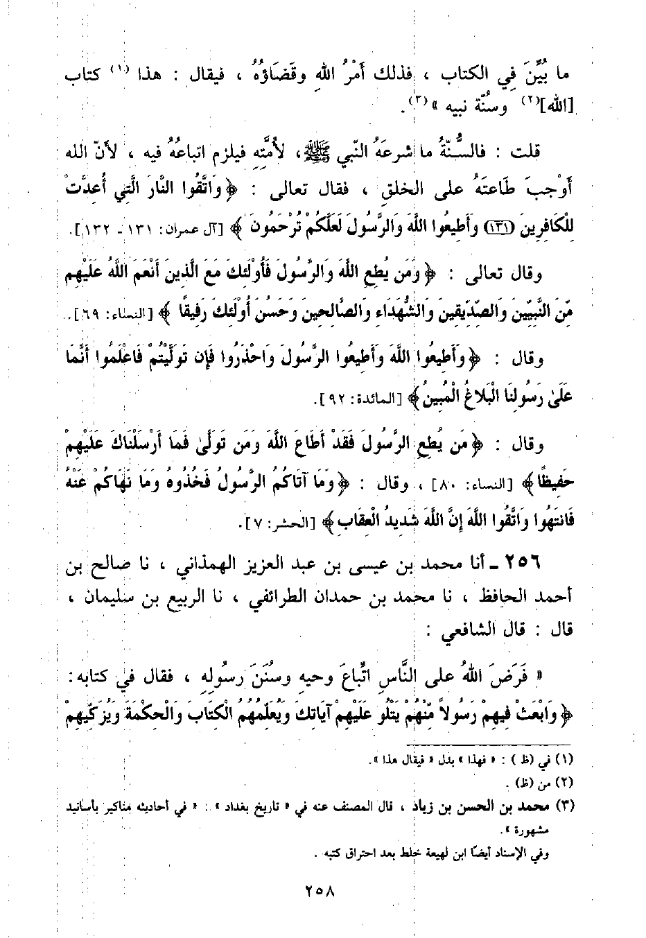أنا مُحَمَّدُ بْنُ عِيسَى بْنِ عَبْدِ الْعَزِيزِ الْهَمَذَانِيُّ , نا صَالِحُ بْنُ أَحْمَدَ الْحَافِظُ , نا مُحَمَّدُ بْنُ حَمْدَانَ الطَّرَائِفِيُّ , نا الرَّبِيعُ بْنُ سُلَيْمَانَ , قَالَ: قَالَ الشَّافِعِيُّ: " فَرَضَ اللَّهُ عَلَى النَّاسِ اتِّبَاعَ وَحْيِهِ وَسُنَنَ رَسُولِهِ , فَقَالَ فِي كِتَابِهِ: {وَابْعَثْ فِيهِمْ رَسُولًا مِنْهُمْ يَتْلُو عَلَيْهِمْ آيَاتِكَ وَيُعَلِّمُهُمُ الْكِتَابَ وَالْحِكْمَةَ وَيُزَكِّيهِمْ