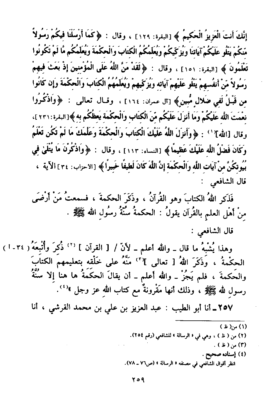 إِنَّكَ أَنْتَ الْعَزِيزُ الْحَكِيمُ} [البقرة: ١٢٩] , وَقَالَ: {كَمَا أَرْسَلْنَا فِيكُمْ رَسُولًا مِنْكُمْ يَتْلُو عَلَيْكُمْ آيَاتِنَا وَيُزَكِّيكُمْ وَيُعَلِّمُكُمُ الْكِتَابَ وَالْحِكْمَةَ وَيُعَلِّمُكُمْ مَا لَمْ تَكُونُوا تَعْلَمُونَ} [البقرة: ١٥١] , وَقَالَ: {لَقَدْ مَنَّ اللَّهُ عَلَى الْمُؤْمِنِينَ إِذْ بَعَثَ فِيهِمْ رَسُولًا مِنْ أَنْفُسِهِمْ يَتْلُو عَلَيْهِمْ آيَاتِهِ وَيُزَكِّيهِمْ وَيُعَلِّمُهُمُ الْكِتَابَ وَالْحِكْمَةَ وَإِنْ كَانُوا مِنْ قَبْلُ لَفِي ضَلَالٍ مُبِينٍ} [آل عمران: ١٦٤] , وَقَالَ: {وَاذْكُرُوا نِعْمَةَ اللَّهِ عَلَيْكُمْ وَمَا أَنْزَلَ عَلَيْكُمْ مِنَ الْكِتَابِ وَالْحِكْمَةِ يَعِظُكُمْ بِهِ} وَقَالَ اللَّهُ: {أَنْزَلَ اللَّهُ عَلَيْكَ الْكِتَابَ وَالْحِكْمَةَ وَعَلَّمَكَ مَا لَمْ تَكُنْ تَعْلَمُ وَكَانَ فَضْلُ اللَّهِ عَلَيْكَ عَظِيمًا} [النساء: ١١٣] وَقَالَ: {وَاذْكُرْنَ مَا يُتْلَى فِي بُيُوتِكُنَّ مِنْ آيَاتِ اللَّهِ وَالْحِكْمَةِ إِنَّ اللَّهَ كَانَ لَطِيفًا خَبِيرًا} [الأحزاب: ٣٤] الْآيَةَ " قَالَ الشَّافِعِيُّ: " فَذَكَرَ اللَّهُ الْكِتَابَ وَهُوَ الْقُرْآنُ , وَذَكَرَ الْحِكْمَةَ , فَسَمِعْتُ مَنْ أَرْضَى مِنْ أَهْلِ الْعِلْمِ بِالْقُرْآنِ يَقُولُ: الْحِكْمَةُ سُنَّةُ رَسُولِ اللَّهِ صَلَّى اللهُ عَلَيْهِ وَسَلَّمَ " قَالَ الشَّافِعِيُّ: «وَهَذَا يُشْبِهُ مَا قَالَ - وَاللَّهُ أَعْلَمُ - لِأَنَّ الْقُرْآنَ ذُكِرَ وَأَتْبَعَهُ الْحِكْمَةَ , وَذَكَرَ اللَّهُ تَعَالَى مَنَّهُ عَلَى خَلْقِهِ بِتَعْلِيمِهِمُ الْكِتَابَ وَالْحِكْمَةَ , فَلَمْ يَجُزْ وَاللَّهُ أَعْلَمُ - أَنْ يُقَالَ الْحِكْمَةُ هَا هُنَا إِلَّا سُنَّةُ رَسُولِ اللَّهِ صَلَّى اللهُ عَلَيْهِ وَسَلَّمَ , وَذَلِكَ أَنَّهَا مَقْرُونَةٌ مَعَ كِتَابِ اللَّهِ عَزَّ وَجَلَّ»