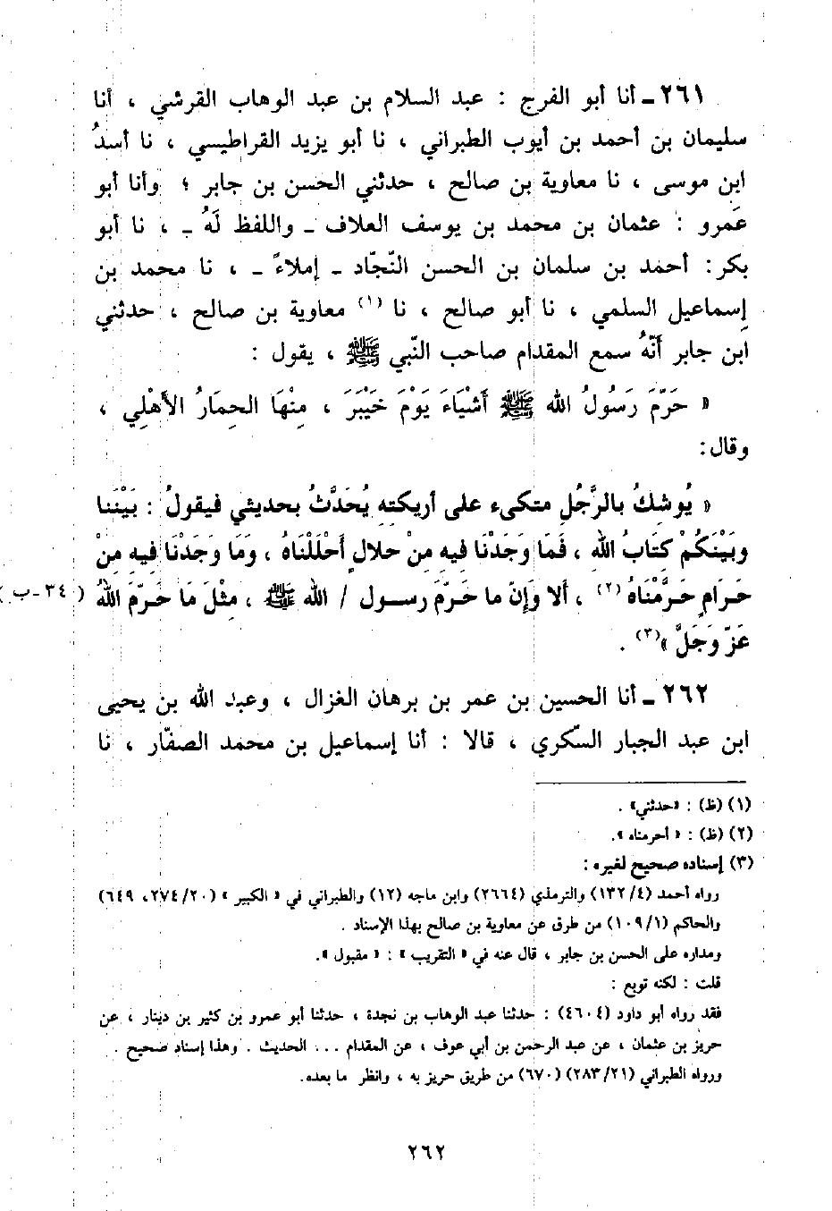 أنا أَبُو الْفَرَجِ عَبْدُ السَّلَامِ بْنُ عَبْدِ الْوَهَّابِ الْقُرَشِيُّ , أنا سُلَيْمَانُ بْنُ أَحْمَدَ بْنِ أَيُّوبَ الطَّبَرَانِيُّ , نا أَبُو يَزِيدَ الْقَرَاطِيسِيُّ , نا أَسَدُ بْنُ مُوسَى , نا مُعَاوِيَةُ بْنُ صَالِحٍ , حَدَّثَنِي الْحَسَنُ بْنُ جَابِرٍ , وَأَنَا أَبُو عَمْرٍو , عُثْمَانُ بْنُ مُحَمَّدِ بْنِ يُوسُفَ الْعَلَّافُ - وَاللَّفْظُ لَهُ - , نا أَبُو بَكْرٍ , أَحْمَدُ بْنُ سَلْمَانَ بْنِ الْحَسَنِ النِّجَادُ - إِمْلَاءً - , نا مُحَمَّدُ بْنُ إِسْمَاعِيلَ السُّلَمِيُّ , نا أَبُو صَالِحٍ , نا مُعَاوِيَةُ بْنُ صَالِحٍ , حَدَّثَنِي ابْنُ جَابِرٍ , أَنَّهُ سَمِعَ الْمِقْدَامَ , صَاحِبَ النَّبِيِّ صَلَّى اللهُ عَلَيْهِ وَسَلَّمَ يَقُولُ: حَرَّمَ رَسُولُ اللَّهِ صَلَّى اللهُ عَلَيْهِ وَسَلَّمَ أَشْيَاءَ يَوْمَ خَيْبَرَ , مِنْهَا الْحِمَارُ الْأَهْلِيُّ , وَقَالَ: " يُوشِكُ بِالرَّجُلِ مُتَّكِئٌ عَلَى أَرِيكَتِهِ يُحَدَّثُ بِحَدِيثِي فَيَقُولُ: بَيْنَنَا وَبَيْنَكُمْ كِتَابُ اللَّهِ , فَمَا وَجَدْنَا فِيهِ مِنْ حَلَالٍ أَحْلَلْنَاهُ , وَمَا وَجَدْنَا فِيهِ مِنْ حَرَامٍ حَرَّمْنَاهُ , أَلَا وَإِنَّ مَا حَرَّمَ رَسُولُ اللَّهِ صَلَّى اللهُ عَلَيْهِ وَسَلَّمَ , مِثْلُ مَا حَرَّمَ اللَّهُ عَزَّ وَجَلَّ "