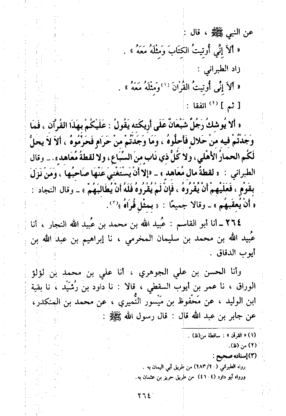 أنا أَبُو الْقَاسِمِ عُبَيْدُ اللَّهِ بْنُ مُحَمَّدِ بْنِ عُبَيْدِ اللَّهِ النَّجَّارُ , أنا عُبَيْدُ اللَّهِ بْنُ مُحَمَّدِ بْنِ سُلَيْمَانَ الْمُخَرِّمِيُّ , نا إِبْرَاهِيمُ بْنُ عَبْدِ اللَّهِ بْنِ أَيُّوبَ الدَّقَّاقُ , وَأَنَا الْحَسَنُ بْنُ عَلِيِّ الْجَوْهَرِيُّ , أنا عَلِيُّ بْنُ مُحَمَّدِ بْنِ لُؤْلُؤٍ الْوَرَّاقُ , نا عُمَرُ بْنُ أَيُّوبَ السَّقَطِيُّ , قَالَا: نا دَاوُدُ بْنُ رُشَيْدٍ , نا بَقِيَّةُ بْنُ الْوَلِيدِ , عَنْ مَحْفُوظِ بْنِ مَيْسُورٍ النُّمَيْرِيِّ , عَنْ مُحَمَّدِ بْنِ الْمُنْكَدِرِ , عَنْ جَابِرِ بْنِ عَبْدِ اللَّهِ , قَالَ: قَالَ رَسُولُ اللَّهِ صَلَّى اللهُ عَلَيْهِ وَسَلَّمَ ⦗٢٦٥⦘: " يُوشِكُ أَحَدُكُمْ أَنْ يَقُولَ: هَذَا كِتَابُ اللَّهِ مَا كَانَ فِيهِ حَلَالًا أَحْلَلْنَاهُ , وَمَا كَانَ فِيهِ مِنْ حَرَامًا حَرَّمْنَاهُ , أَلَا مَنْ بَلَغَهُ عَنِّي حَدِيثٌ , فَكَذَّبَ بِهِ فَقَدْ كَذَّبَ ثَلَاثَةً: كَذَّبَ اللَّهَ , وَرَسُولَهُ وَكَذَّبَ الَّذِي جَاءَ بِهِ " لَفْظُ حَدِيثِ النِّجَادِ