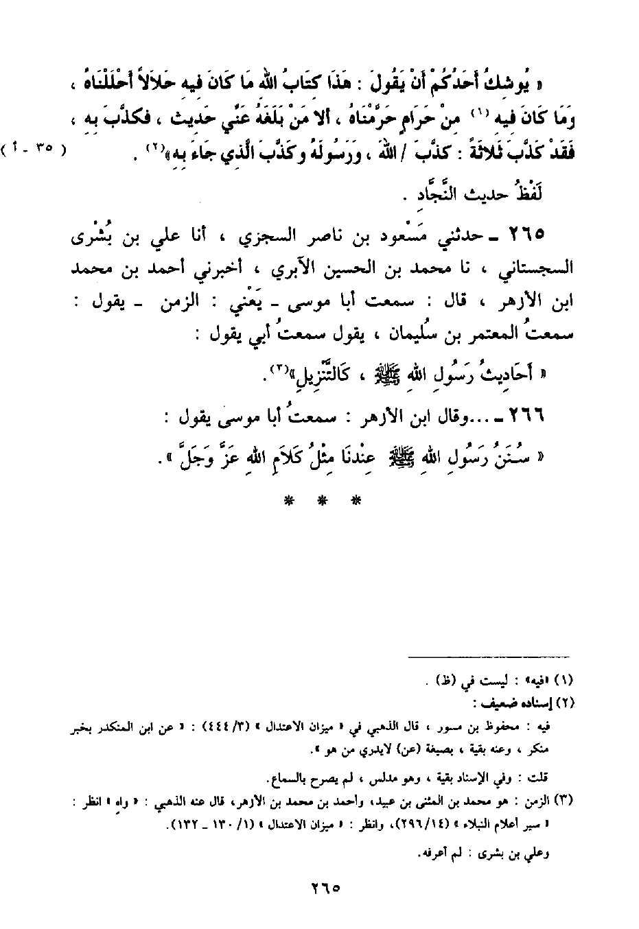 حَدَّثَنِي مَسْعُودُ بْنُ ناصرٍ السَّجَرِيُّ , أنا عَلِيُّ بْنُ بُشْرَى السِّجِسْتَانِيُّ , نا مُحَمَّدُ بْنُ الْحُسَيْنِ الْآبِرِيُّ , أَخْبَرَنِي أَحْمَدُ بْنُ مُحَمَّدِ بْنِ الْأَزْهَرِ , قَالَ: سَمِعْتُ ابْنَ مُوسَى يَعْنِي الزَّمَنَ - يَقُولُ: سَمِعْتُ الْمُعْتَمِرَ بْنَ سُلَيْمَانَ , يَقُولُ سَمِعْتُ أَبِي يَقُولُ: «أَحَادِيثُ رَسُولِ اللَّهِ صَلَّى اللهُ عَلَيْهِ وَسَلَّمَ كَالتَّنْزِيلِ»