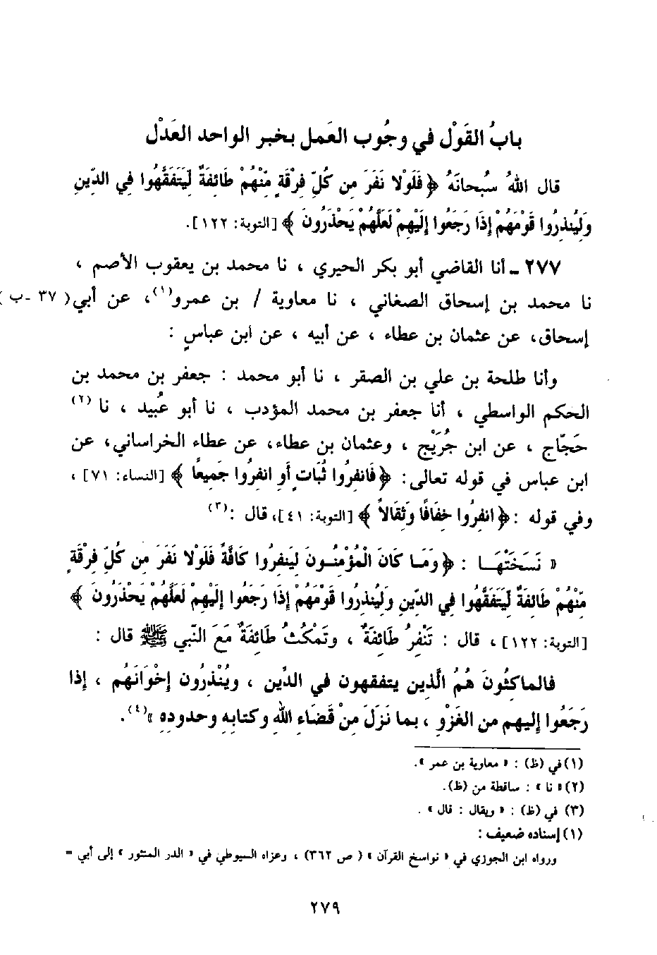 أنا الْقَاضِي أَبُو بَكْرٍ الْحِيرِيُّ , نا مُحَمَّدُ بْنُ يَعْقُوبَ الْأَصَمُّ , نا مُحَمَّدُ بْنُ إِسْحَاقَ الصَّغَانِيُّ , نا مُعَاوِيَةُ بْنُ عَمْرٍو , عَنْ أَبِي إِسْحَاقَ , عَنْ عُثْمَانَ بْنِ عَطَاءٍ , عَنْ أَبِيهِ , عَنِ ابْنِ عَبَّاسٍ , وَأَنَا طَلْحَةُ بْنُ عَلِيِّ بْنِ الصَّقْرِ , نا أَبُو مُحَمَّدٍ , جَعْفَرُ بْنُ مُحَمَّدِ بْنِ الْحَكَمِ الْوَاسِطِيُّ , أنا جَعْفَرُ بْنُ مُحَمَّدٍ الْمُؤَدِّبُ , نا أَبُو عُبَيْدٍ , نا حَجَّاجٌ , عَنِ ابْنِ جُرَيْجٍ , وَعُثْمَانُ بْنُ عَطَاءٍ , عَنْ عَطَاءٍ الْخُرَاسَانِيِّ , عَنِ ابْنِ عَبَّاسٍ , فِي قَوْلِهِ تَعَالَى: {فَانْفِرُوا ثُبَاتٍ أَوِ انْفِرُوا جَمِيعًا} [النساء: ٧١] , وَفِي قَوْلِهِ: {انْفِرُوا خِفَافًا وَثِقَالًا} [التوبة: ٤١] قَالَ: " نَسَخَتْهَا: {وَمَا كَانَ الْمُؤْمِنُونَ لِيَنْفِرُوا كَافَّةً فَلَوْلَا نَفَرَ مِنْ كُلِّ فِرْقَةٍ مِنْهُمْ طَائِفَةٌ لِيَتَفَقَّهُوا فِي الدِّينِ وَلِيُنْذِرُوا قَوْمَهُمْ إِذَا رَجَعُوا إِلَيْهِمْ لَعَلَّهُمْ يَحْذَرُونَ} [التوبة: ١٢٢] قَالَ: تَنْفِرُ طَائِفَةٌ , وَتَمْكُثُ طَائِفَةٌ مَعَ النَّبِيِّ صَلَّى اللهُ عَلَيْهِ وَسَلَّمَ قَالَ: فَالْمَاكِثُونَ هُمُ الَّذِينَ يَتَفَقَّهُونَ فِي الدِّينِ , وَيُنْذِرُونَ إِخْوَانَهُمْ , إِذَا رَجَعُوا إِلَيْهِمْ مِنَ الْغَزْوِ , بِمَا نَزَلَ مِنْ قَضَاءِ اللَّهِ وَكِتَابِهِ وَحُدُودِهِ " ⦗٢٨٠⦘ وَاللَّفْظُ لِحَدِيثِ أَبِي عُبَيْدٍ
