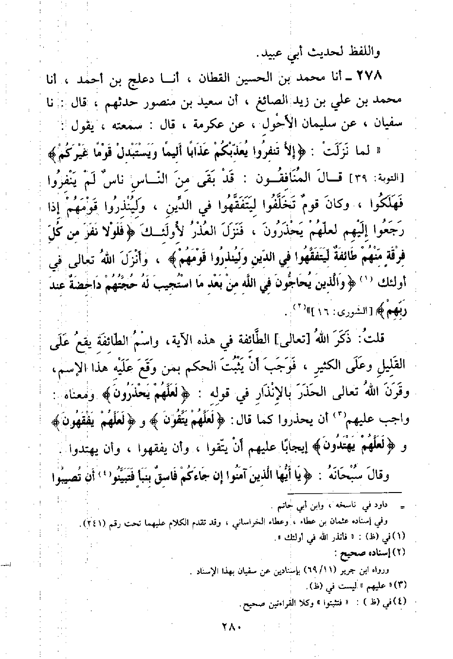 أنا مُحَمَّدُ بْنُ الْحُسَيْنِ الْقَطَّانُ , أَنا دَعْلَجُ بْنُ أَحْمَدَ , أنا مُحَمَّدُ بْنُ عَلِيِّ بْنِ زَيْدٍ الصَّائِغُ , أَنَّ سَعِيدَ بْنَ مَنْصُورٍ , حَدَّثَهُمْ قَالَ: نا سُفْيَانُ , عَنْ سُلَيْمَانَ الْأَحْوَلِ , عَنْ عِكْرِمَةَ , قَالَ: سَمِعْتُهُ يَقُولُ: " لَمَّا نَزَلَتْ: {إِلَّا تُنَفِّرُوا يُعَذِّبْكُمْ عَذَابًا أَلِيمًا وَيَسْتَبْدِلْ قَوْمًا غَيْرَكُمْ} [التوبة: ٣٩] قَالَ الْمُنَافِقُونَ: قَدْ بَقِيَ مِنَ النَّاسِ نَاسٌ لَمْ يَنْفِرُوا فَهَلَكُوا , وَكَانَ قَوْمٌ تَخَلَّفُوا لِيَتَفَقَّهُوا فِي الدِّينِ , وَلِيُنْذِرُوا قَوْمَهُمْ إِذَا رَجَعُوا إِلَيْهِمْ لَعَلَّهُمْ يَحْذَرُونَ , فَنَزَلَ الْعُذْرُ لِأُولَئِكَ {فَلَوْلَا نَفَرَ مِنْ كُلِّ فِرْقَةٍ مِنْهُمْ طَائِفَةٌ لِيَتَفَقَّهُوا فِي الدِّينِ وَلِيُنْذِرُوا قَوْمَهُمْ} [التوبة: ١٢٢] , وَأَنْزَلَ اللَّهُ تَعَالَى فِي أُولَئِكَ {وَالَّذِينَ يُحَاجُّونَ فِي اللَّهِ مِنْ بَعْدِ مَا اسْتُجِيبَ لَهُ حَجَّتُهُمْ دَاحِضَةٌ عِنْدَ رَبِّهِمْ} [الشورى: ١٦] " قُلْتُ: ذَكَرَ اللَّهُ تَعَالَى الطَّائِفَةَ فِي هَذِهِ الْآيَةِ , وَاسْمُ الطَّائِفَةِ يَقَعُ عَلَى الْقَلِيلِ وَعَلَى الْكَثِيرِ , فَوَجَبَ أَنْ يَثْبُتَ الْحُكْمُ بِمَنْ وَقَعَ عَلَيْهِ هَذَا الِاسْمُ , وَقَرَنَ اللَّهُ تَعَالَى الْحَذَرَ بِالْإِنْذَارِ فِي قَوْلِهِ: {لَعَلَّهُمْ يَحْذَرُونَ} [التوبة: ١٢٢] وَمَعْنَاهُ: وَاجِبٌ عَلَيْهِمْ أَنْ يَحْذَرُوا كَمَا قَالَ: {لَعَلَّهُمْ يَتَّقُونَ} [البقرة: ١٨٧] وَ {لَعَلَّهُمْ يَفْقَهُونَ} [الأنعام: ٦٥] وَ {لَعَلَّهُمْ يَهْتَدُونَ} [الأنبياء: ٣١] إِيجَابًا عَلَيْهِمْ أَنْ يَتَّقُوا , وَأَنْ يَفْقَهُوا , وَأَنْ يَهْتَدُوا وَقَالَ سُبْحَانَهُ: {يَا أَيُّهَا الَّذِينَ آمَنُوا إِنْ جَاءَكُمْ فَاسِقٌ بِنَبَأٍ فَتَبَيَّنُوا أَنْ تُصِيبُوا ⦗٢٨١⦘ قَوْمًا بِجَهَالَةٍ فَتُصْبِحُوا عَلَى مَا فَعَلْتُمْ نَادِمِينَ} [الحجرات: ٦] فَأَمَرَ اللَّهُ بِالتَّثَبُّتِ فِي خَبَرِ الْفَاسِقِ وَبَيَّنَ أَنَّ ذَلِكَ لِئَلَّا يُصَابَ قَوْمٌ بِجَهَالَةٍ فَيُصْبِحُ مَنْ قَضَى بِخَبَرِ الْفَاسِقِ نَادِمًا , وَفِي ذَلِكَ دَلَالَةٌ وَاضِحَةٌ عَلَى إِمْضَاءِ خَبَرِ الْعَدْلِ , وَالْفَرَقُ بَيْنَهُ وَبَيْنَ خَبَرِ الْفَاسِقِ , وَلَوْ كَانَا سِيَّيْنِ فِي التَّثَبُّتِ لَبَيَّنَهُ عَزَّ وَجَلَّ