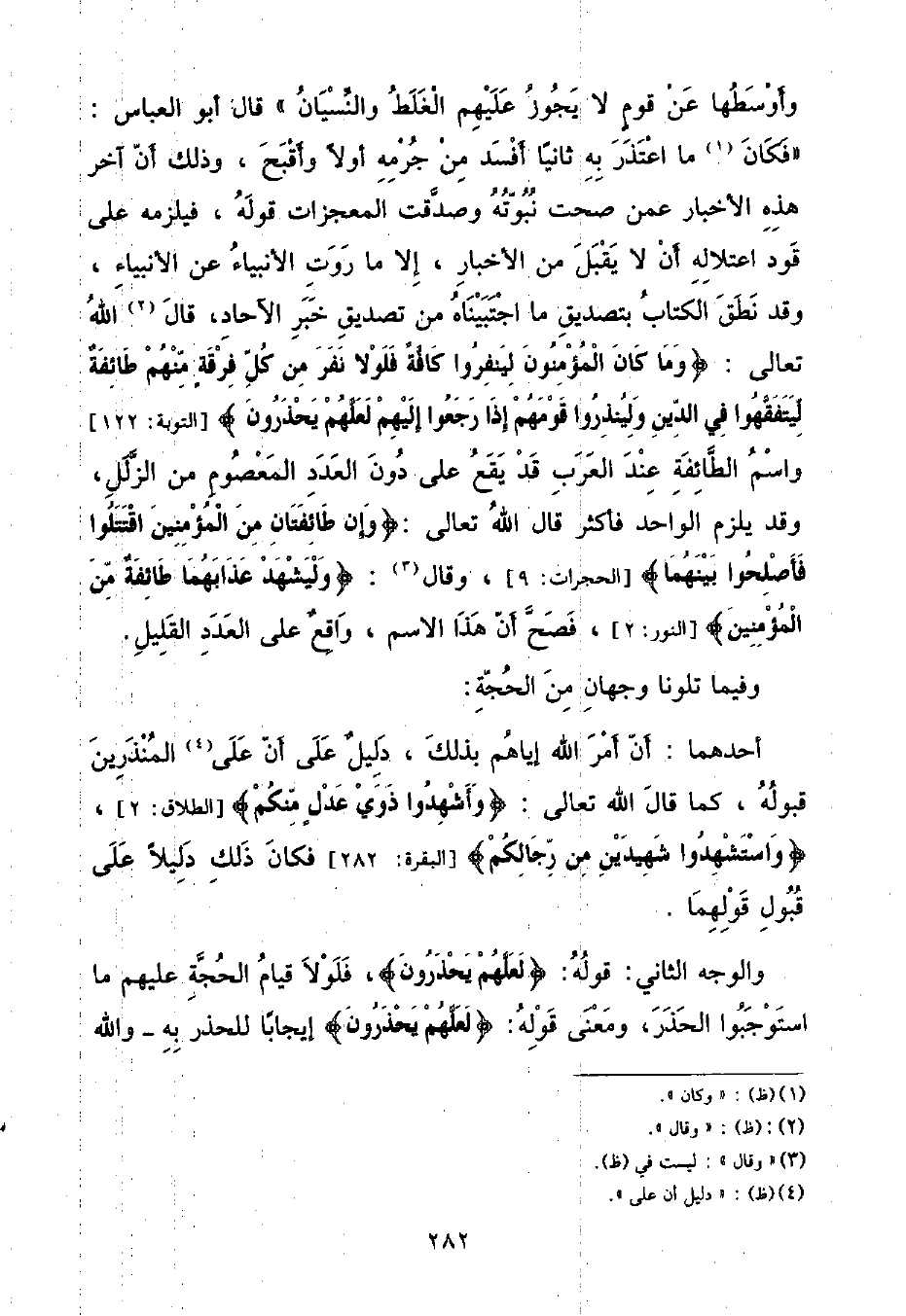 وَأَوْسَطُهَا عَنْ قَوْمٍ لَا يَجُوزُ عَلَيْهِمُ الْغَلَطُ وَالنِّسْيَانُ " قَالَ أَبُو الْعَبَّاسِ: " فَكَانَ مَا اعْتَذَرَ بِهِ ثَانِيًا أَفْسَدَ مِنْ جُرْمِهِ أَوَّلًا وَأَقْبَحَ , وَذَلِكَ أَنَّ آخِرَ هَذِهِ الْأَخْبَارِ عَمَّنْ صَحَّتْ نُبُوَّتُهُ وَصَدَّقَتِ الْمُعْجِزَاتُ قَوْلَهُ , فَيَلْزَمُهُ عَلَى قَوَدِ اعْتِلَالِهِ أَنْ لَا يَقْبَلَ مِنَ الْأَخْبَارِ إِلَّا مَا رَوَتِ الْأَنْبِيَاءُ عَنِ الْأَنْبِيَاءِ , وَقَدْ نَطَقَ الْكِتَابُ بِتَصْدِيقِ مَا اجْتَبَيْنَاهُ مِنْ تَصْدِيقِ خَبَرِ الْآحَادِ قَالَ اللَّهُ تَعَالَى: {وَمَا كَانَ الْمُؤْمِنُونَ لِيَنْفِرُوا كَافَّةً فَلَوْلَا نَفَرَ مِنْ كُلِّ فِرْقَةٍ مِنْهُمْ طَائِفَةٌ لِيَتَفَقَّهُوا فِي الدِّينِ وَلِيُنْذِرُوا قَوْمَهُمْ إِذَا رَجَعُوا إِلَيْهِمْ لَعَلَّهُمْ يَحْذَرُونَ} [التوبة: ١٢٢] وَاسْمُ الطَّائِفَةِ عِنْدَ الْعَرَبِ قَدْ يَقَعُ عَلَى دُونِ الْعَدَدِ الْمَعْصُومِ مِنَ الزَّلَلِ , وَقَدْ يَلْزَمُ الْوَاحِدَ فَأَكْثَرَ قَالَ اللَّهُ تَعَالَى: {وَإِنْ طَائِفَتَانِ مِنَ الْمُؤْمِنِينَ اقْتَتَلُوا فَأَصْلِحُوا بَيْنَهُمَا} [الحجرات: ٩] , وَقَالَ: {وَلْيَشْهَدْ عَذَابَهُمَا طَائِفَةٌ مِنَ الْمُؤْمِنِينَ} [النور: ٢] , فَصَحَّ أَنَّ هَذَا الِاسْمَ , وَاقِعٌ عَلَى الْعَدَدِ الْقَلِيلِ وَفِيمَا تَلَوْنَا وَجْهَانِ مِنَ الْحُجَّةِ: أَحَدُهُمَا: أَنَّ أَمْرَ اللَّهِ إِيَّاهُمْ بِذَلِكَ دَلِيلٌ عَلَى أَنَّ عَلَى الْمُنْذَرِينَ قَبُولَهُ , كَمَا قَالَ اللَّهُ تَعَالَى: {وَأَشْهِدُوا ذَوَيْ عَدْلٍ مِنْكُمْ} [الطلاق: ٢] , {وَاسْتَشْهِدُوا شَهِيدَيْنِ مِنْ رِجَالِكُمْ} [البقرة: ٢٨٢] فَكَانَ ذَلِكَ دَلِيلًا عَلَى قَبُولِ قَوْلِهِمَا وَالْوَجْهُ الثَّانِي: قَوْلُهُ: {لَعَلَّهُمْ يَحْذَرُونَ} [التوبة: ١٢٢] , فَلَوْلَا قِيَامُ الْحِجَّةِ عَلَيْهِمْ مَا اسْتَوْجَبُوا الْحَذَرَ , وَمَعْنَى قَوْلِهِ: {لَعَلَّهُمْ يَحْذَرُونَ} [التوبة: ١٢٢] إِيجَابًا لِلْحَذَرِ بِهِ - وَاللَّهُ