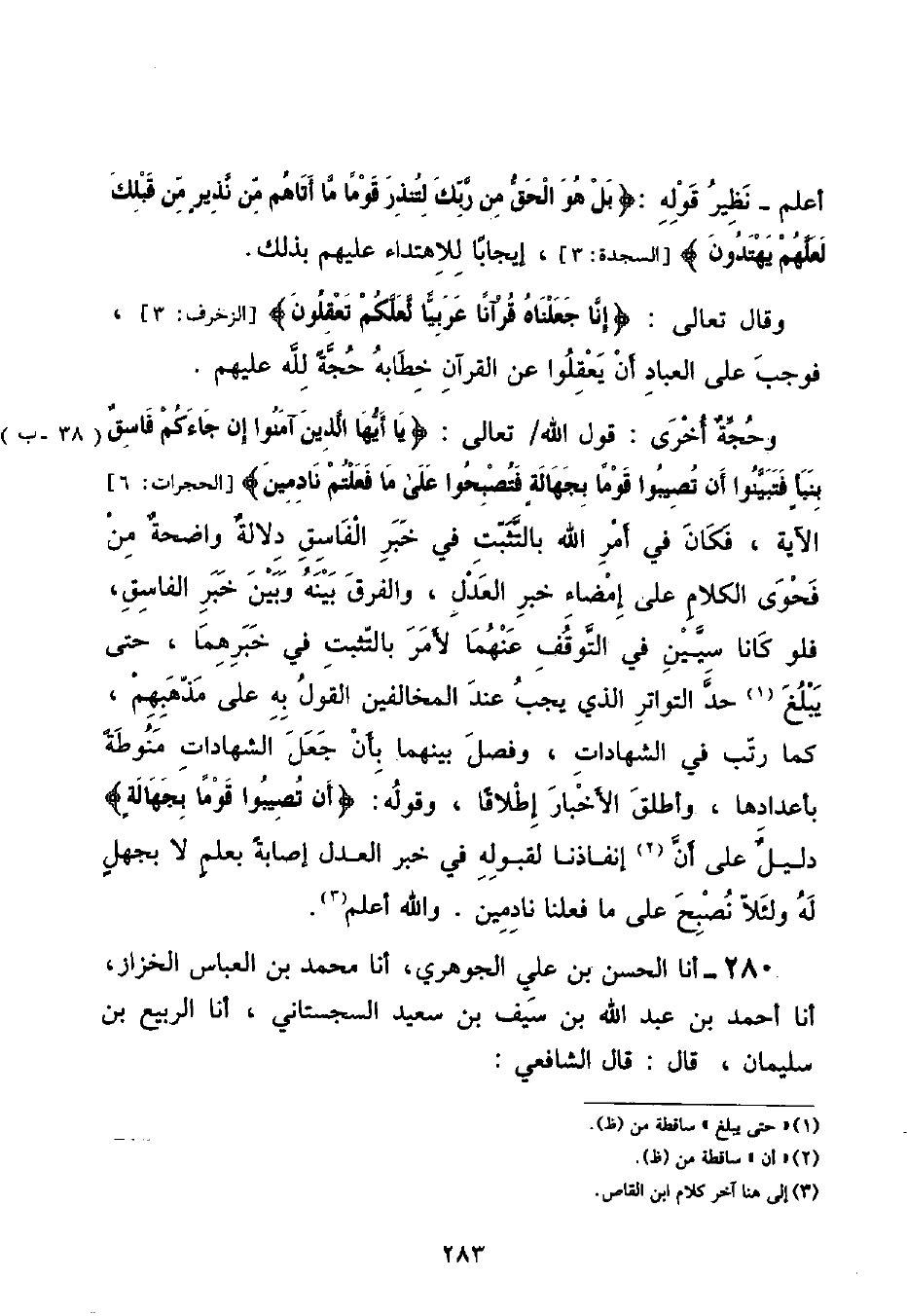 أَعْلَمُ - نَظِيرَ قَوْلِهِ: {بَلْ هُوَ الْحَقُّ مِنْ رَبِّكِ لِتُنْذِرَ قَوْمًا مَا أَتَاهُمْ مِنْ نَذِيرٍ مِنْ قَبْلِكَ لَعَلَّهُمْ يَهْتَدُونَ} [السجدة: ٣] إِيجَابًا لِلِاهْتِدَاءِ عَلَيْهِمْ بِذَلِكَ وَقَالَ تَعَالَى: {إِنَّا جَعَلْنَاهُ قُرْآنًا عَرَبِيًّا لَعَلَّكُمْ تَعْقِلُونَ} [الزخرف: ٣] فَوَجَبَ عَلَى الْعِبَادِ أَنْ يَعْقِلُوا عَنِ الْقُرْآنِ خِطَابَهُ حُجَّةً لِلَّهِ عَلَيْهِمْ وَحُجَّةً أُخْرَى: قَوْلُ اللَّهِ تَعَالَى: {يَا أَيُّهَا الَّذِينَ آمَنُوا إِنْ جَاءَكُمْ فَاسِقٌ بِنَبَأٍ فَتَبَيَّنُوا أَنْ تُصِيبُوا قَوْمًا بِجَهَالَةٍ فَتُصْبِحُوا عَلَى مَا فَعَلْتُمْ نَادِمِينَ} [الحجرات: ٦] الْآيَةُ , فَكَانَ فِي أَمْرِ اللَّهِ بِالتَّثَبُّتِ فِي خَبَرِ الْفَاسِقِ دَلَالَةٌ وَاضِحَةٌ مِنْ فَحْوَى الْكَلَامِ عَلَى إِمْضَاءِ خَبَرِ الْعَدْلِ , وَالْفَرَقُ بَيْنَهُ وَبَيْنَ خَبَرِ الْفَاسِقِ , فَلَوْ كَانَا سِيَّيْنِ فِي التَّوَقُّفِ عَنْهُمَا لَأَمَرَ بِالتَّثَبُّتِ فِي خَبَرِهِمَا , حَتَّى يَبْلُغَ حَدَّ التَّوَاتُرِ الَّذِي يَجِبُ عِنْدَ الْمُخَالِفِينَ الْقَوْلَ بِهِ عَلَى مَذْهَبِهِمْ , كَمَا رَتَّبَ فِي الشَّهَادَاتِ , وَفَصَلَ بَيْنَهُمَا بِأَنْ جَعَلَ الشَّهَادَاتِ مَنُوطَةً بِأَعْدَادِهَا , وَأَطْلَقَ الْأَخْبَارَ إِطْلَاقًا , وَقَوْلُهُ: {أَنْ تُصِيبُوا قَوْمًا بِجَهَالَةٍ} [الحجرات: ٦] دَلِيلٌ عَلَى أَنَّ إِنْفَاذَنَا لِقَبُولِهِ فِي خَبَرِ الْعَدْلِ إِصَابَةٌ بِعِلْمٍ لَا بِجَهْلٍ لَهُ وَلِئَلَّا نُصْبِحَ عَلَى مَا فَعَلْنَا نَادِمِينَ وَاللَّهُ أَعْلَمُ "