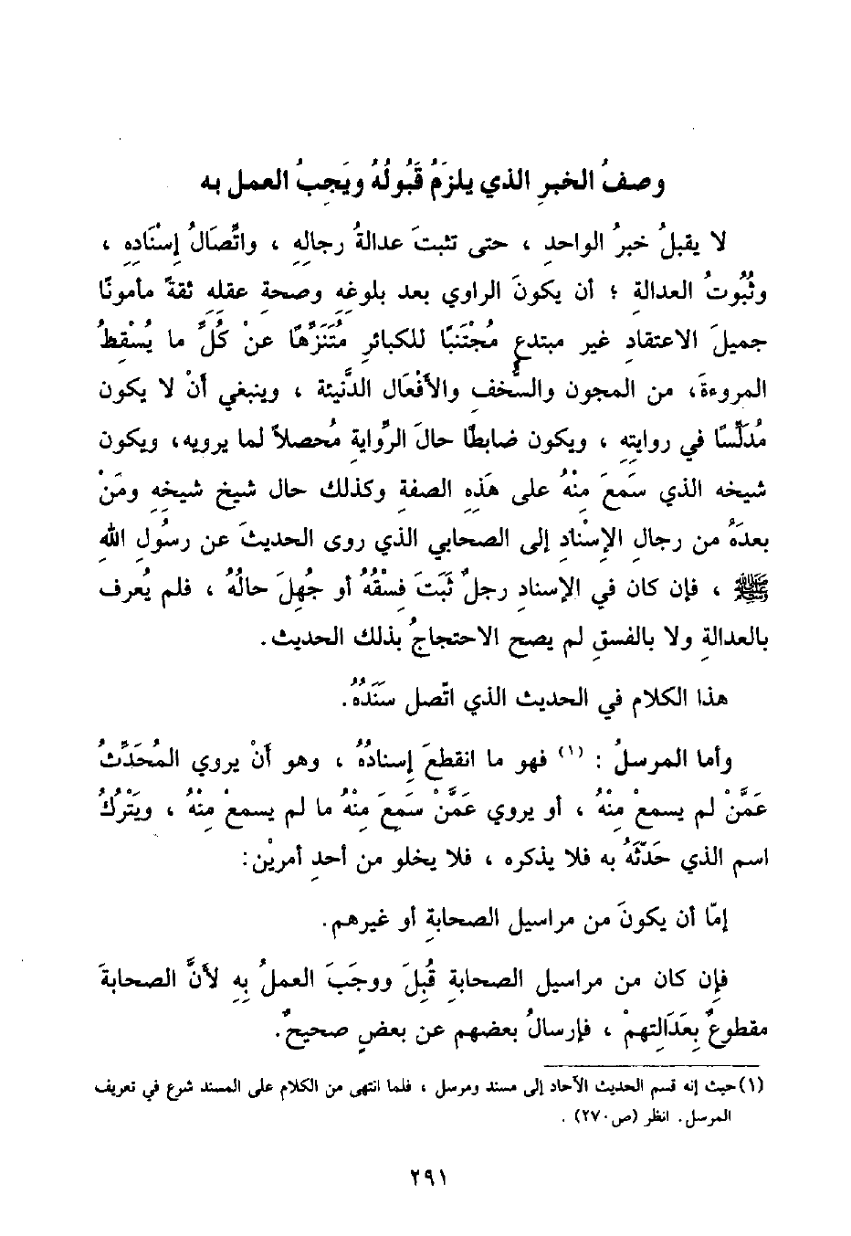وَصْفُ الْخَبَرِ الَّذِي يَلْزَمُ قَبُولُهُ وَيَجِبُ الْعَمَلُ بِهِ لَا يُقْبَلُ خَبَرُ الْوَاحِدِ , حَتَّى تَثْبُتَ عَدَالَةُ رِجَالِهِ , وَاتِّصَالُ إِسْنَادِهِ وَثُبُوتُ الْعَدَالَةِ , أَنْ يَكُونَ الرَّاوِي بَعْدَ بُلُوغِهِ وَصِحَّةِ عَقْلِهِ ثِقَةً مَأْمُونًا جَمِيلَ الِاعْتِقَادِ غَيْرَ مُبْتَدَعٍ مُجْتَنِبًا لِلْكَبَائِرِ مُتَنَزِّهًا عَنْ كُلِّ مَا يُسْقِطُ الْمُرُوءَةَ مِنَ الْمُجُونِ وَالسُّخْفِ وَالْأَفْعَالِ الدَّنِيئَةِ , وَيَنْبَغِي أَنْ لَا يَكُونَ مُدَلِّسًا فِي رِوَايَتِهِ , وَيَكُونَ ضَابِطًا حَالَ الرِّوَايَةِ مُحَصِّلًا لِمَا يَرْوِيهِ , وَيَكُونَ شَيْخُهُ الَّذِي سَمِعَ مِنْهُ عَلَى هَذِهِ الصُّفَّةِ وَكَذَلِكَ حَالُ شَيْخِ شَيْخِهِ وَمَنْ بَعْدَهُ مِنْ رِجَالِ الْإِسْنَادِ إِلَى الصَّحَابِيِّ الَّذِي رَوَى الْحَدِيثَ عَنْ رَسُولِ اللَّهِ صَلَّى اللهُ عَلَيْهِ وَسَلَّمَ , فَإِنْ كَانَ فِي الْإِسْنَادِ رَجُلٌ ثَبَتَ فِسْقُهُ أَوْ جُهِلَ حَالُهُ , فَلَمْ يُعْرَفْ بِالْعَدَالَةِ وَلَا بِالْفِسْقِ لَمْ يَصِحَّ الِاحْتِجَاجُ بِذَلِكَ الْحَدِيثِ هَذَا الْكَلَامُ فِي الْحَدِيثِ الَّذِي اتَّصَلَ سَنَدُهُ وَأَمَّا الْمُرْسَلُ: فَهُوَ مَا انْقَطَعَ إِسْنَادُهُ , وَهُوَ أَنْ يَرْوِيَ الْمُحَدِّثُ عَمَّنْ لَمْ يَسْمَعْ مِنْهُ , أَوْ يَرْوِيَ عَمَّنْ سَمِعَ مِنْهُ مَا لَمْ يَسْمَعْ مِنْهُ , وَيَتْرُكَ اسْمَ الَّذِي حَدَّثَهُ بِهِ فَلَا يَذْكُرُهُ , فَلَا يَخْلُو مِنْ أَحَدِ أَمْرَيْنِ: إِمَّا أَنْ يَكُونَ مِنْ مَرَاسِيلِ الصَّحَابَةِ أَوْ غَيْرِهِمْ فَإِنْ كَانَ مِنْ مَرَاسِيلِ الصَّحَابَةِ قُبِلَ وَوَجَبَ الْعَمَلُ بِهِ لِأَنَّ الصَّحَابَةَ مَقْطُوعٌ بِعَدَالَتِهِمْ , فَإِرْسَالُ بَعْضِهِمْ عَنْ بَعْضٍ صَحِيحٌ
