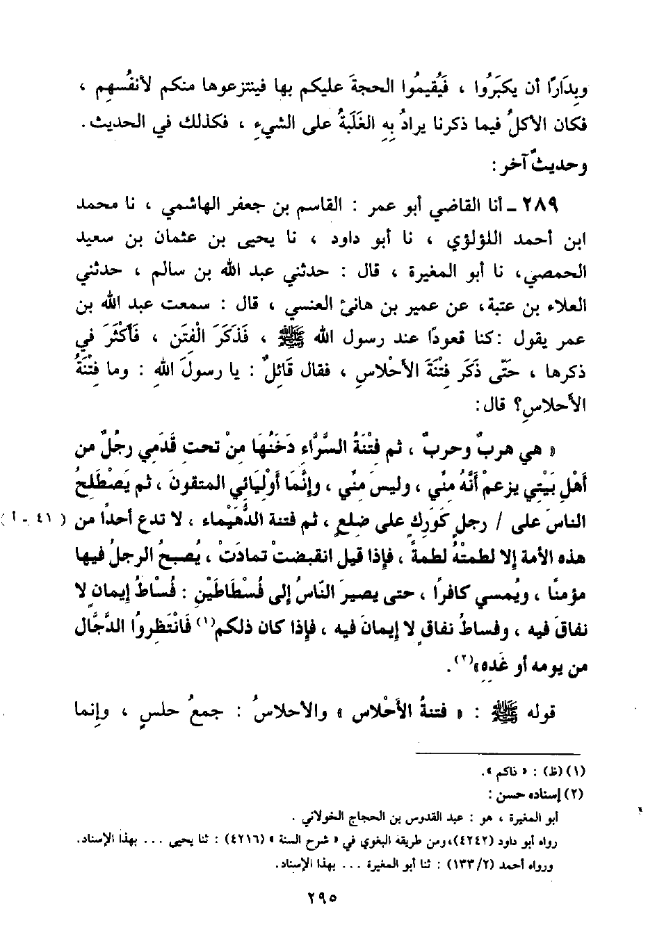 أنا الْقَاضِي أَبُو عُمَرَ الْقَاسِمُ بْنُ جَعْفَرٍ الْهَاشِمِيُّ , نا مُحَمَّدُ بْنُ أَحْمَدَ اللُّؤْلُؤِيُّ , نا أَبُو دَاوُدَ , نا يَحْيَى بْنُ عُثْمَانَ بْنِ سَعِيدٍ الْحِمْصِيُّ , نا أَبُو الْمُغِيرَةِ , قَالَ: حَدَّثَنِي عَبْدُ اللَّهِ بْنُ سَالِمٍ , حَدَّثَنِي الْعَلَاءُ بْنُ عُتْبَةَ , عَنْ عُمَيْرِ بْنِ هَانِئٍ الْعَنْسِيِّ , قَالَ: سَمِعْتُ عَبْدَ اللَّهِ بْنَ عُمَرَ , يَقُولُ: كُنَّا قُعُودًا عِنْدَ رَسُولِ اللَّهِ صَلَّى اللهُ عَلَيْهِ وَسَلَّمَ , فَذَكَرَ الْفِتَنَ , فَأَكْثَرَ فِي ذِكْرِهَا , حَتَّى ذَكَرَ فِتْنَةَ الْأَحْلَاسِ , فَقَالَ قَائِلٌ: يَا رَسُولَ اللَّهِ: وَمَا فِتْنَةُ الْأَحْلَاسِ؟ قَالَ: " هِيَ هَرَبٌ وَحَرْبٌ , ثُمَّ فِتْنَةُ السَّرَّاءِ دَخَنُهَا مِنْ تَحْتِ قَدَمَيْ رَجُلٍ مِنْ أَهْلِ بَيْتِي يَزْعُمُ أَنَّهُ مِنِّي , وَلَيْسَ مِنِّي , وَإِنَّمَا أَوْلِيَائِي الْمُتَّقُونِ , ثُمَّ يَصْطَلِحُ النَّاسُ عَلَى رَجُلٍ كَوَرِكٍ عَلَى ضِلْعٍ , ثُمَّ فِتْنَةُ الدُّهَيْمَاءِ , لَا تَدَعُ أَحَدًا مِنْ هَذِهِ الْأُمَّةِ إِلَّا لَطَمَتْهُ لَطْمَةً , فَإِذَا قِيلَ انْقَبَضَتْ تَمَادَتْ , يُصْبِحُ الرَّجُلُ فِيهَا مُؤْمِنًا , وَيُمْسِي كَافِرًا , حَتَّى يَصِيرَ النَّاسُ إِلَى فُسْطَاطَيْنِ: فُسْطَاطِ إِيمَانٍ لَا نِفَاقَ فِيهِ , وَفُسْطَاطِ نِفَاقٍ لَا إِيمَانَ فِيهِ , فَإِذَا كَانَ ذَلِكُمْ فَانْتَظِرُوا الدَّجَّالَ مِنْ يَوْمِهِ أَوْ غَدِهِ قَوْلُهُ صَلَّى اللهُ عَلَيْهِ وَسَلَّمَ: «فِتْنَةُ الْأَحْلَاسِ» وَالْأَحْلَاسُ: جَمْعُ حِلْسٍ , وَإِنَّمَا ⦗٢٩٦⦘ شَبَّهَهَا بِالْحِلْسِ لِظُلْمَتِهَا وَالْتِبَاسِهَا , أَوْ لِأَنَّهَا تَرْكُدُ وَتَدُومُ فَلَا تُقْلِعُ , يُقَالُ: فُلَانٌ حِلْسُ بَيْتِهِ إِذَا كَانَ يُلَازِمُ قَعْرَ بَيْتِهِ لَا يَبْرَحُ , وَيُقَالُ: هُمْ أَحْلَاسُ الْخَيْلِ: إِذَا كَانُوا يَلْزَمُونَ ظُهُورَهَا وَالدَّخَنُ: الدُّخَانُ , يُرِيدُ أَنَّهُ سَبَبُ إِثَارَتِهَا وَهَيْجِهَا وَقَوْلُهُ: كَوَرِكٍ عَلَى ضِلَعٍ يُرِيدُ - وَاللَّهُ أَعْلَمُ - أَنَّهُمْ يَجْتَمِعُونَ عَلَى رَجُلٍ غَيْرِ خَلِيقٍ لِلْمُلْكِ وَلَا مُسْتَقِلٍّ بِهِ , لِأَنَّ الْوَرِكَ لَا يَسْتَقِلَّ عَلَى الضِّلَعِ وَلَا يُلَائِمُهَا , وَإِنَّمَا يُقَالُ فِي بَابِ الْمُشَاكَلَةِ هُوَ كَرَأْسٍ عَلَى جَسَدٍ أَوْ كَفٍّ فِي ذِرَاعٍ وَنَحْوِهِمَا مِنَ الْكَلَامِ وَالدُّهَيْمَاءُ: تَصْغِيرُ الدَّهْمَاءِ , وَلَعَلَّهُ صَغَّرَهَا عَلَى طَرِيقِ الْمَذَمَّةِ , وَاللَّهُ أَعْلَمُ وَحَدِيثٌ آخَرُ