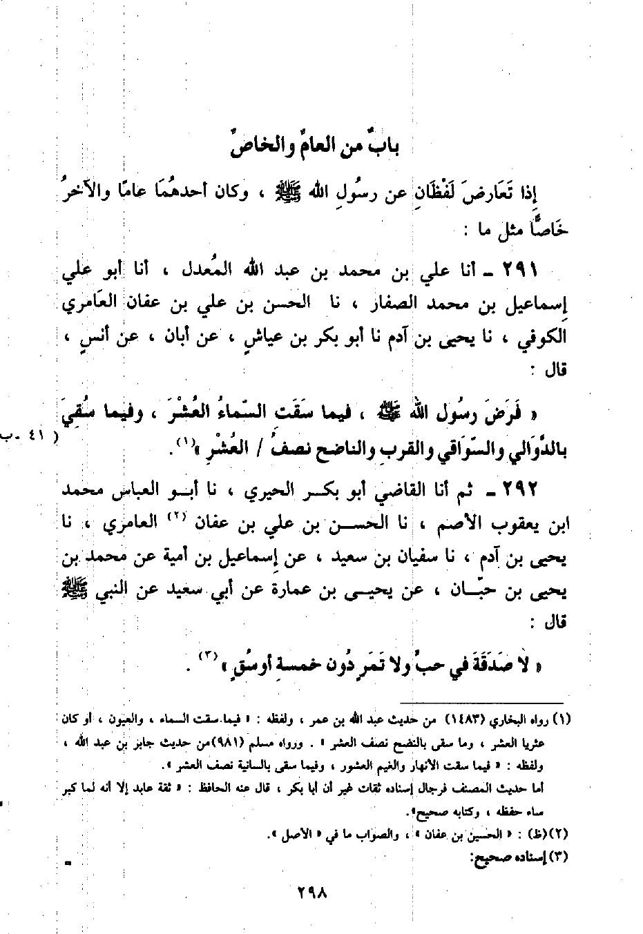 ثُمَّ أنا الْقَاضِي أَبُو بَكْرٍ الْحِيرِيُّ , نا أَبُو الْعَبَّاسِ , مُحَمَّدُ بْنُ يَعْقُوبَ الْأَصَمُّ , نا الْحَسَنُ بْنُ عَلِيِّ بْنِ عَفَّانَ الْعَامِرِيُّ , نا يَحْيَى بْنُ آدَمَ , نا سُفْيَانُ بْنُ سَعِيدٍ , عَنْ إِسْمَاعِيلَ بْنِ أُمَيَّةَ , عَنْ مُحَمَّدِ بْنِ يَحْيَى بْنِ حَبَّانَ , عَنْ يَحْيَى بْنِ عُمَارَةَ , عَنْ أَبِي سَعِيدٍ , عَنِ النَّبِيِّ صَلَّى اللهُ عَلَيْهِ وَسَلَّمَ قَالَ: «لَا صَدَقَةَ فِي حَبٍّ وَلَا تَمْرٍ دُونَ خَمْسَةِ أَوْسُقٍ» ⦗٢٩٩⦘ فَحَدِيثُ أَنَسٍ عَامٌ يُوجِبُ الصَّدَقَةَ فِي قَلِيلِ مَا تُنْبِتُ الْأَرْضُ مِنَ الزَّرْعِ وَالثَّمَرِ وَفِي كَثِيرِهِ , وَحَدِيثُ أَبِي سَعِيدٍ خَاصٌّ فِي أَنَّ الصَّدَقَةَ إِنَّمَا تَجِبُ فِيمَا بَلَغَ خَمْسَةَ أَوْسُقٍ فَصَاعِدًا , وَأَمَّا مَا قَصُرَ عَنْ ذَلِكَ فَلَا صَدَقَةَ فِيهِ وَالْوَاجِبُ فِي مِثْلِ هَذَا أَنْ يُقْضَى بِالْخَاصِّ عَلَى الْعَامِّ لِقُوَّتِهِ , فَإِنَّ الْخَاصَّ يَتَنَاوَلُ الْحُكْمَ بِلَفْظٍ لَا احْتِمَالَ فِيهِ , وَالْعَامُّ يَتَنَاوَلُهُ بِلَفْظٍ مُحْتَمَلٍ , فَوَجَبَ أَنْ يُقْضَى بِالْخَاصِّ عَلَيْهِ وَأَمَّا إِذَا كَانَ كُلُّ وَاحِدٍ مِنَ اللَّفْظَيْنِ عَامًّا مِنْ وَجْهٍ وَخَاصًّا مِنْ وَجْهٍ فَيُمْكِنُ أَنْ يُخَصَّ بِكُلِّ وَاحِدٍ مِنْهَا عُمُومُ الْآخَرِ , مِثْلُ: