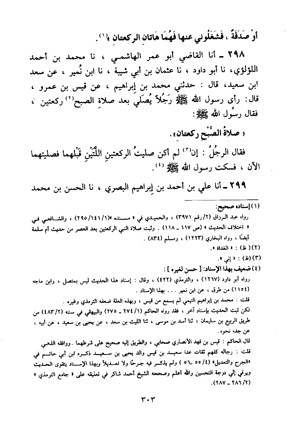 أنا الْقَاضِي أَبُو عُمَرَ الْهَاشِمِيُّ , نا مُحَمَّدُ بْنُ أَحْمَدَ اللُّؤْلُؤِيُّ , نا أَبُو دَاوُدَ , نا عُثْمَانُ بْنُ أَبِي شَيْبَةَ , نا ابْنُ نُمَيْرٍ , عَنْ سَعْدِ بْنِ سَعِيدٍ , قَالَ: حَدَّثَنِي مُحَمَّدُ بْنُ إِبْرَاهِيمَ , عَنْ قَيْسِ بْنِ عَمْرٍو , قَالَ: رَأَى رَسُولُ اللَّهِ صَلَّى اللهُ عَلَيْهِ وَسَلَّمَ رَجُلًا يُصَلِّي بَعْدَ صَلَاةِ الصُّبْحِ رَكْعَتَيْنِ , فَقَالَ رَسُولُ اللَّهِ صَلَّى اللهُ عَلَيْهِ وَسَلَّمَ: «صَلَاةُ الصُّبْحِ رَكْعَتَانِ» فَقَالَ الرَّجُلُ: إِنْ لَمْ أَكُنْ صَلَّيْتُ الرَّكْعَتَيْنِ اللَّتَيْنِ قَبْلَهُمَا فَصَلَّيْتُهُمَا الْآنَ , فَسَكَتَ رَسُولُ اللَّهِ صَلَّى اللهُ عَلَيْهِ وَسَلَّمَ
