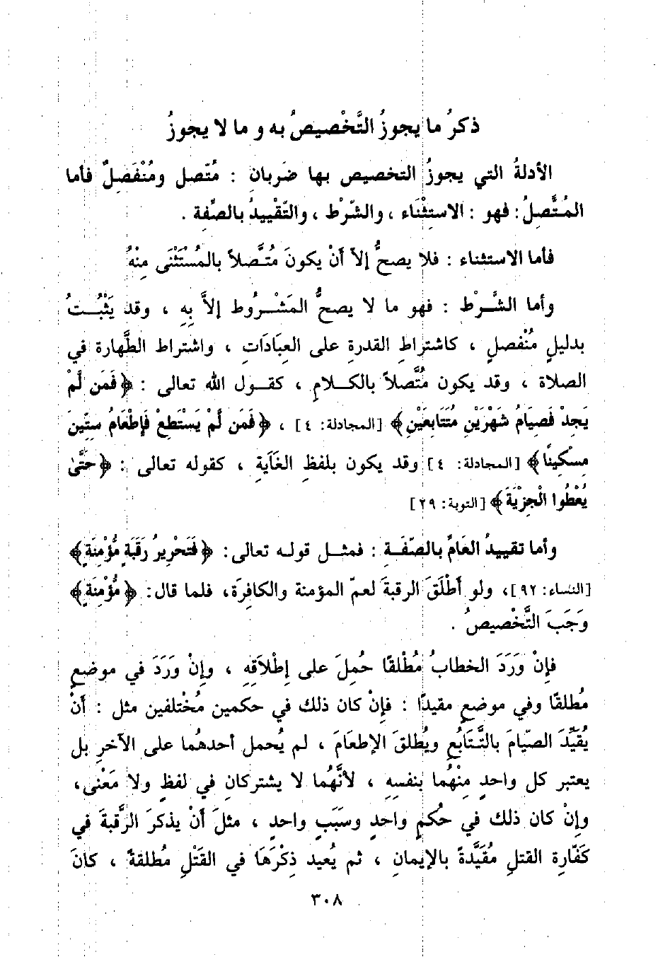 ذِكْرُ مَا يَجُوزُ التَّخْصِيصُ بِهِ وَمَا لَا يَجُوزُ الْأَدِلَّةُ الَّتِي يَجُوزُ التَّخْصِيصُ بِهَا ضِرْبَانِ: مُتَّصِلٌ وَمُنْفَصِلٌ فَأَمَّا الْمُتَّصِلُ: فَهُوَ: الِاسْتِثْنَاءُ , وَالشَّرْطُ , وَالتَّقْيِيدُ بِالصِّفَةِ فَأَمَّا الِاسْتِثْنَاءُ: فَلَا يَصِحُّ إِلَّا أَنْ يَكُونَ مُتَّصِلًا بِالْمُسْتَثْنَى مِنْهُ وَأَمَّا الشَّرْطُ: فَهُوَ مَا لَا يَصِحُّ الْمَشْرُوطُ إِلَّا بِهِ , وَقَدْ يَثْبُتُ بِدَلِيلٍ مُنْفَصِلٍ , كَاشْتِرَاطِ الْقُدْرَةِ عَلَى الْعِبَادَاتِ , وَاشْتِرَاطِ الطَّهَارَةِ فِي الصَّلَاةِ , وَقَدْ يَكُونُ مُتَّصِلًا بِالْكَلَامِ , كَقَوْلِ اللَّهِ تَعَالَى: {فَمَنْ لَمْ يَجِدْ فَصِيَامُ شَهْرَيْنِ مُتَتَابِعَيْنِ} [النساء: ٩٢] {فَمَنْ لَمْ يَسْتَطِعْ فَإِطْعَامُ سِتِّينَ مِسْكِينًا} [المجادلة: ٤] وَقَدْ يَكُونُ بِلَفْظِ الْغَايَةِ , كَقَوْلِهِ تَعَالَى: {حَتَّى يُعْطُوا الْجِزْيَةَ} [التوبة: ٢٩] وَأَمَّا تَقْيِيدُ الْعَامِّ بِالصِّفَةِ: فَمِثْلُ قَوْلِهِ تَعَالَى: {فَتَحْرِيرُ رَقَبَةٍ مُؤْمِنَةٍ} [النساء: ٩٢] وَلَوْ أَطْلَقَ الرَّقَبَةَ لَعَمَّ الْمُؤْمِنَةَ وَالْكَافِرَةَ , فَلَمَّا قَالَ: {مُؤْمِنَةٍ} [البقرة: ٢٢١] وَجَبَ التَّخْصِيصُ فَإِنْ وَرَدَ الْخِطَابُ مُطْلَقًا حُمِلَ عَلَى إِطْلَاقِهِ , وَإِنْ وَرَدَ فِي مَوْضِعٍ مُطْلَقًا وَفِي مَوْضِعٍ مُقَيَّدًا: فَإِنْ كَانَ ذَلِكَ فِي حُكْمَيْنِ مُخْتَلِفَيْنِ مِثْلُ: أَنْ يُقَيَّدَ الصِّيَامُ بِالتَّتَابُعِ وَيُطْلَقُ الْإِطْعَامُ , لَمْ يُحْمَلْ أَحَدُهُمَا عَلَى الْآخَرِ بَلْ يُعْتَبَرُ كُلُّ وَاحِدٍ مِنْهُمَا بِنَفْسِهِ , لِأَنَّهُمَا لَا يَشْتَرِكَانِ فِي لَفْظٍ وَلَا مَعْنًى , وَإِنْ كَانَ ذَلِكَ فِي حُكْمٍ وَاحِدٍ وَسَبَبٍ وَاحِدٍ , مِثْلُ أَنْ يَذْكُرَ الرَّقَبَةَ فِي كَفَّارَةِ الْقَتْلِ مُقَيَّدَةً بِالْإِيمَانِ , ثُمَّ يُعِيدُ ذِكْرَهَا فِي الْقَتْلِ مُطْلَقَةً , كَانَ