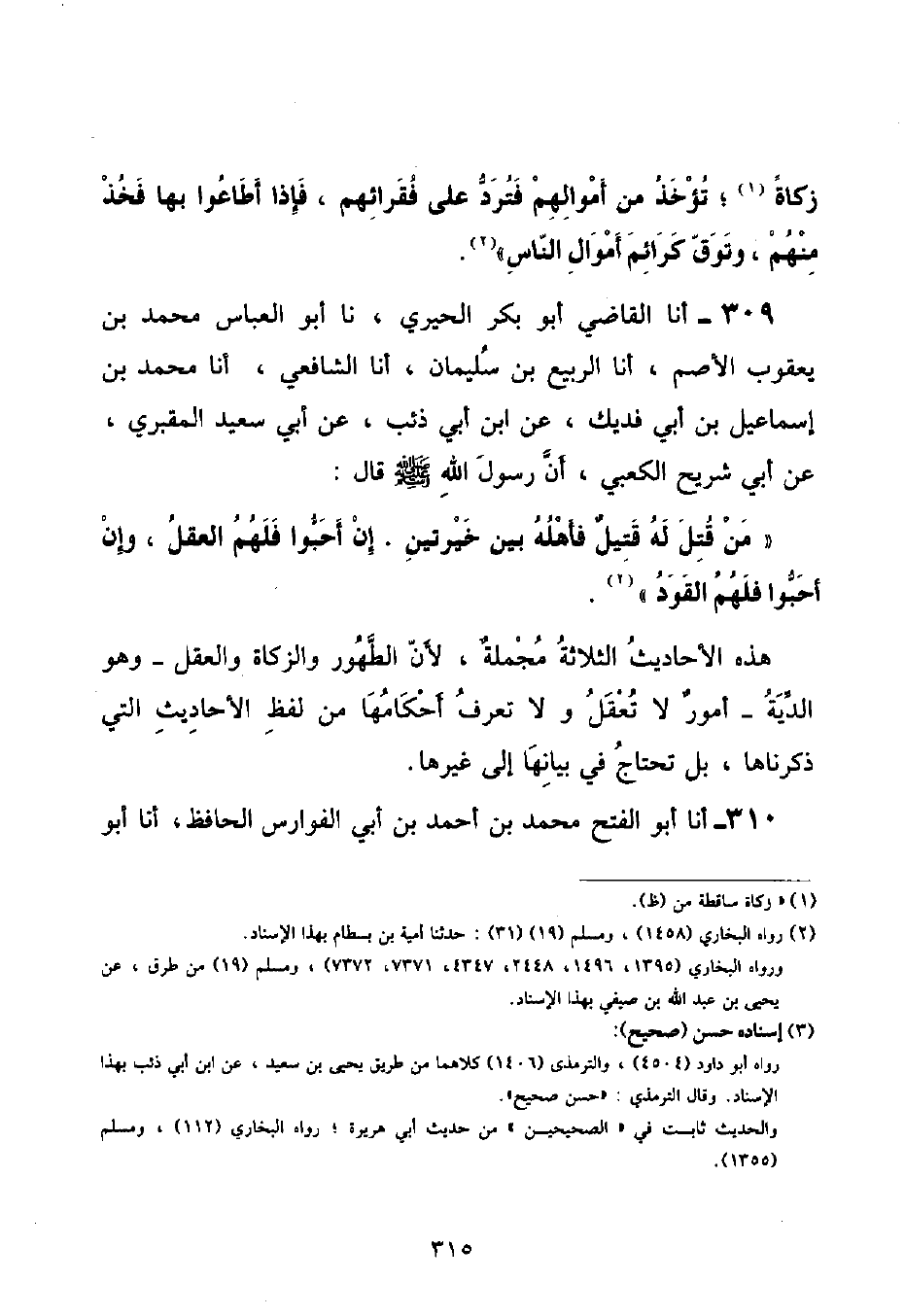 أنا الْقَاضِي أَبُو بَكْرٍ الْحِيرِيُّ , نا أَبُو الْعَبَّاسِ , مُحَمَّدُ بْنُ يَعْقُوبَ الْأَصَمُّ , أنا الرَّبِيعُ بْنُ سُلَيْمَانَ , أنا الشَّافِعِيُّ , أنا مُحَمَّدُ بْنُ إِسْمَاعِيلَ بْنِ أَبِي فُدَيْكٍ , عَنِ ابْنِ أَبِي ذِئْبٍ , عَنْ أَبِي سَعِيدٍ الْمَقْبُرِيِّ , عَنْ أَبِي شُرَيْحٍ الْكَعْبِيِّ , أَنَّ رَسُولَ اللَّهِ صَلَّى اللهُ عَلَيْهِ وَسَلَّمَ قَالَ: «مَنْ قُتِلَ لَهُ قَتِيلٌ فَأَهْلُهُ بَيْنَ خِيَرَتَيْنِ إِنْ أَحَبُّوا فَلَهُمُ الْعَقْلُ , وَإِنْ أَحَبُّوا فَلَهُمُ الْقَوَدُ» هَذِهِ الْأَحَادِيثُ الثَّلَاثَةُ مُجْمَلَةٌ , لِأَنَّ الطُّهُورَ وَالزَّكَاةَ وَالْعَقْلَ - وَهُوَ الدِّيَةُ - أُمُورٌ لَا تُعْقَلُ وَلَا تُعْرَفُ أَحْكَامُهَا مِنْ لَفْظِ الْأَحَادِيثِ الَّتِي ذَكَرْنَاهَا , بَلْ تَحْتَاجُ فِي بَيَانِهَا إِلَى غَيْرِهَا