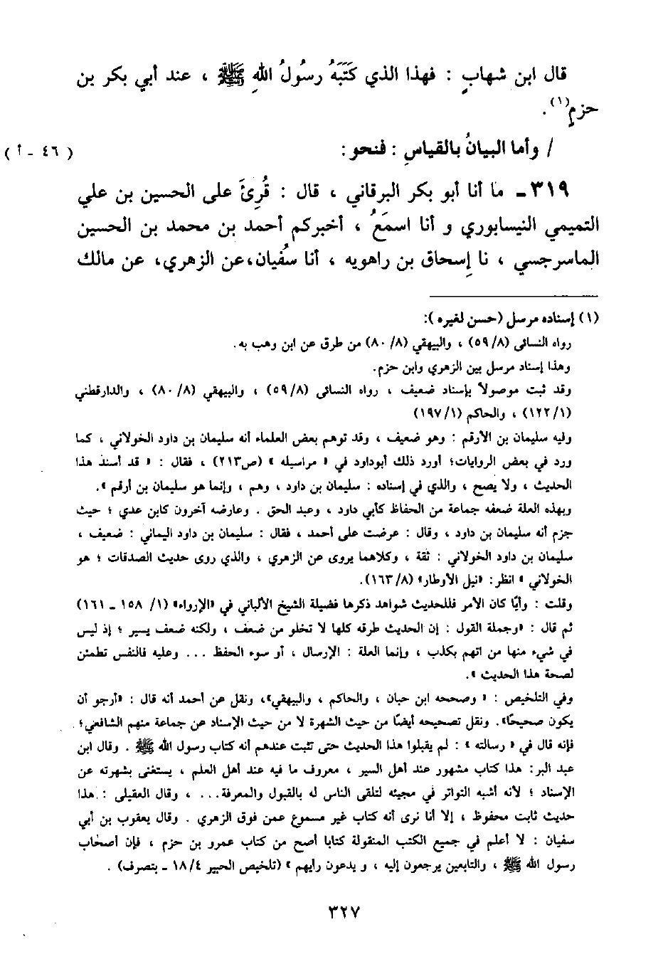 وَأَمَّا الْبَيَانُ بِالْقِيَاسِ فَنَحْوُ: مَا أنا أَبُو بَكْرٍ الْبُرْقَانِيُّ , قَالَ: قُرِئَ عَلَى الْحُسَيْنِ بْنِ عَلِيٍّ التَّمِيمِيِّ النَّيْسَابُورِيِّ وَأَنَا أَسْمَعُ , أَخْبَرَكُمْ أَحْمَدُ بْنُ مُحَمَّدِ بْنِ الْحُسَيْنِ الْمَاسَرْجَسِيُّ , نا إِسْحَاقُ بْنُ رَاهَوَيْهِ , أنا سُفْيَانُ , عَنِ الزُّهْرِيِّ , عَنْ مَالِكِ ⦗٣٢٨⦘ بْنِ أَوْسِ بْنِ الْحَدَثَانِ , سَمِعَ عُمَرَ بْنَ الْخَطَّابِ , يَقُولُ: قَالَ رَسُولُ اللَّهِ صَلَّى اللهُ عَلَيْهِ وَسَلَّمَ: «الْوَرِقُ بِالْوَرِقِ رِبًا إِلَّا هَاءَ وَهَاءَ , وَالذَّهَبُ بِالذَّهَبِ رِبًا إِلَّا هَاءَ هَاءَ , وَالْبُرُّ بِالْبُرِّ رِبًا إِلَّا هَاءَ هَاءَ , وَالشَّعِيرُ بِالشَّعِيرِ رِبًا إِلَّا هَاءَ وَهَاءَ , وَالتَّمْرُ بِالتَّمْرِ رِبًا إِلَّا هَاءَ وَهَاءَ»