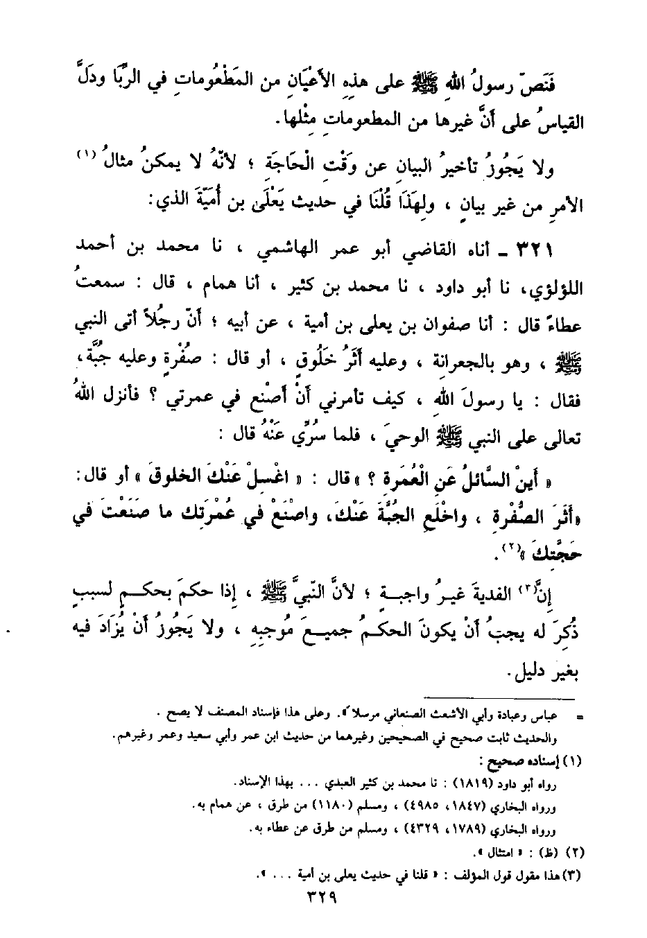 أَنَاهُ الْقَاضِي أَبُو عُمَرَ الْهَاشِمِيُّ , نا مُحَمَّدُ بْنُ أَحْمَدَ اللُّؤْلُؤِيُّ , نا أَبُو دَاوُدَ , نا مُحَمَّدُ بْنُ كَثِيرٍ , أنا هَمَّامٌ , قَالَ: سَمِعْتُ عَطَاءً , قَالَ: أنا صَفْوَانُ بْنُ يَعْلَى بْنِ أُمَيَّةَ , عَنْ أَبِيهِ , أَنَّ رَجُلًا , أَتَى النَّبِيَّ صَلَّى اللهُ عَلَيْهِ وَسَلَّمَ , وَهُوَ بِالْجِعْرَانَةِ , وَعَلَيْهِ أَثَرُ خَلُوقٍ , أَوْ قَالَ: صُفْرَةٌ وَعَلَيْهِ جُبَّةٌ , فَقَالَ: يَا رَسُولَ اللَّهِ , كَيْفَ تَأْمُرُنِي أَنْ أَصْنَعَ فِي عُمْرَتِي؟ فَأَنْزَلَ اللَّهُ تَعَالَى عَلَى النَّبِيِّ صَلَّى اللهُ عَلَيْهِ وَسَلَّمَ الْوَحْيَ , فَلَمَّا سُرِّيَ عَنْهُ قَالَ: «أَيْنَ السَّائِلُ عَنِ الْعُمْرَةِ؟» قَالَ: «اغْسِلْ عَنْكَ الْخَلُوقَ» أَوْ قَالَ: «أَثَرَ الصُّفْرَةِ , وَاخْلَعِ الْجُبَّةَ عَنْكَ , وَاصْنَعْ فِي عُمْرَتِكَ مَا صَنَعْتَ فِي حَجَّتِكَ» إِنَّ الْفِدْيَةَ غَيْرُ وَاجِبَةٍ , لِأَنَّ النَّبِيَّ صَلَّى اللهُ عَلَيْهِ وَسَلَّمَ , إِذَا حَكَمَ بِحُكْمٍ لِسَبَبٍ ذُكِرَ لَهُ يَجِبُ أَنْ يَكُونَ الْحُكْمُ جَمِيعَ مُوجِبِهِ , وَلَا يَجُوزُ أَنْ يُزَادَ فِيهِ بِغَيْرِ دَلِيلٍ ⦗٣٣٠⦘ وَأَمَّا تَأْخِيرُ الْبَيَانِ عَنْ وَقْتِ الْخِطَابِ , فَإِنَّهُ يَجُوزُ فِي النَّسْخِ خَاصَّةً , لِأَنَّ اللَّهَ تَعَالَى لَمَّا أَمَرَ بِالتَّوَجُّهِ إِلَى بَيْتِ الْمَقْدِسِ فِي كُلِّ صَلَاةٍ , كَانَ ذَلِكَ عَامًّا فِي زَمَانٍ , وَأَرَادَ بِهِ بَعْضَ الْأَزْمَانِ فَأَخَّرَ بَيَانَهُ إِلَى وَقْتِ الْحَاجَةِ وَأَمَّا تَأْخِيرُهُ فِي غَيْرِ النَّسْخِ , فَفِيهِ ثَلَاثَةُ أَوْجُهٍ: أَحَدُهَا: أَنَّهُ يَجُوزُ , وَالثَّانِي: أَنَّهُ لَا يَجُوزُ , وَالثَّالِثُ: أَنَّهُ يَجُوزُ تَأْخِيرُ بَيَانِ الْمُجْمَلِ , وَلَا يَجُوزُ تَأْخِيرُ بَيَانِ الْعُمُومِ , وَمِنَ النَّاسِ مَنْ قَالَ: يَجُوزُ ذَلِكَ فِي الْإِخْبَارِ دُونَ الْأَمْرِ وَالنَّهْيِ , وَمِنْهُمْ مَنْ قَالَ يَجُوزُ فِي الْأَمْرِ وَالنَّهْيِ دُونَ الْإِخْبَارِ , وَسَمِعْتُ أَبَا إِسْحَاقَ الْفَيْرُوزَابَادِيَّ يَقُولُ: وَالصَّحِيحُ أَنَّهُ يَجُوزُ فِي جَمِيعِ مَا ذَكَرْنَاهُ , لِأَنَّ تَأْخِيرَهُ لَا يُخِلُّ بِالِامْتِثَالِ فَجَازَ كَتَأْخِيرِ بَيَانِ النَّسْخِ