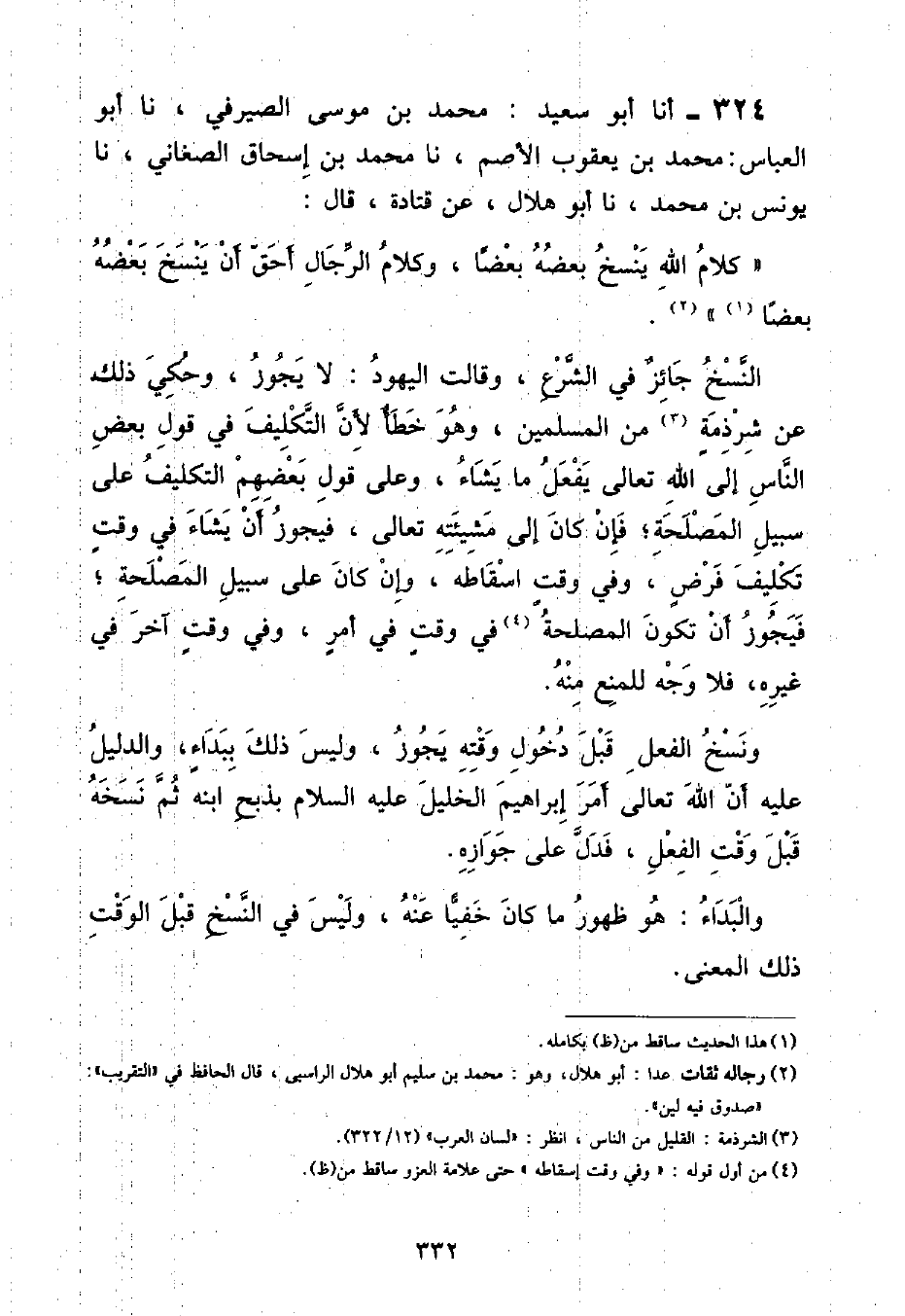 أنا أَبُو سَعِيدٍ , مُحَمَّدُ بْنُ مُوسَى الصَّيْرَفِيُّ , نا أَبُو الْعَبَّاسِ , مُحَمَّدُ بْنُ يَعْقُوبَ الْأَصَمُّ , نا مُحَمَّدُ بْنُ إِسْحَاقَ الصَّغَانِيُّ , نا يُونُسُ بْنُ مُحَمَّدٍ , نا أَبُو هِلَالٍ , عَنْ قَتَادَةَ , قَالَ: «كَلَامُ اللَّهِ يَنْسَخُ بَعْضُهُ بَعْضًا , وَكَلَامُ الرِّجَالِ أَحَقُّ أَنْ يَنْسَخَ بَعْضُهُ بَعْضًا» النَّسْخُ جَائِزٌ فِي الشَّرْعِ , وَقَالَتِ الْيَهُودُ: لَا يَجُوزُ , وَحُكِيَ ذَلِكَ عَنْ شِرْذِمَةٍ مِنَ الْمُسْلِمِينَ , وَهُوَ خَطَأٌ لِأَنَّ التَّكْلِيفَ فِي قَوْلِ بَعْضِ النَّاسِ إِلَى اللَّهِ تَعَالَى يَفْعَلُ مَا يَشَاءُ , وَعَلَى قَوْلُ بَعْضِهِمُ التَّكْلِيفُ عَلَى سَبِيلِ الْمَصْلَحَةِ , فَإِنْ كَانَ إِلَى مَشِيئَتِهِ تَعَالَى , فَيَجُوزُ أَنْ يَشَاءَ فِي وَقْتِ تَكْلِيفِ فَرْضٍ , وَفِي وَقْتِ إِسْقَاطِهِ , وَإِنْ كَانَ عَلَى سَبِيلِ الْمَصْلَحَةِ , فَيَجُوزُ أَنْ تَكُونَ الْمَصْلَحَةُ فِي وَقْتٍ فِي أَمْرٍ , وَفِي وَقْتٍ آخَرَ فِي غَيْرِهِ , فَلَا وَجْهَ لِلْمَنْعِ مِنْهُ وَنَسْخُ الْفِعْلِ قَبْلَ دُخُولِ وَقْتِهِ يَجُوزُ , وَلَيْسَ ذَلِكَ بِبَدَاءٍ , وَالدَّلِيلُ عَلَيْهِ أَنَّ اللَّهَ تَعَالَى أَمَرَ إِبْرَاهِيمَ الْخَلِيلَ عَلَيْهِ السَّلَامُ بِذِبْحِ ابْنِهِ ثُمَّ نَسَخَهُ قَبْلَ وَقْتِ الْفِعْلِ , فَدَلَّ عَلَى جَوَازِهِ وَالْبَدَاءُ: هُوَ ظُهُورُ مَا كَانَ خَفِيًّا عَنْهُ , وَلَيْسَ فِي النَّسْخِ قَبْلَ الْوَقْتِ ذَلِكَ الْمَعْنَى وَيَجُوزُ نَسْخُ السُّنَّةِ بِالسُّنَّةِ , كَمَا يَجُوزُ نَسْخُ الْكِتَابِ بِالْكِتَابِ , الْآحَادِ بِالْآحَادِ , وَالتَّوَاتُرَ بِالتَّوَاتُرِ فَأَمَّا نَسْخُ التَّوَاتُرَ بِالْآحَادِ فَلَا يَجُوزُ , لِأَنَّ التَّوَاتُرَ يُوجِبُ الْعِلْمَ , فَلَا يَجُوزُ نَسْخُهُ بِمَا يُوجِبُ الظَّنَّ وَيَجُوزُ نَسْخُ الْقَوْلِ بِالْقَوْلِ , وَنَسْخُ الْفِعْلِ بِالْقَوْلِ , وَنَسْخُ الْفِعْلِ بِالْفِعْلِ , وَنَسْخُ الْقَوْلِ بِالْفِعْلِ , لِأَنَّ الْفِعْلَ كَالْقَوْلِ فِي الْبَيَانِ , فَكَمَا جَازَ النَّسْخُ بِالْقَوْلِ جَازَ بِالْفِعْلِ وَيَجُوزُ النَّسْخُ بِدَلِيلِ الْخِطَابِ , لِأَنَّهُ فِي مَعْنَى النُّطْقُ , وَلَا يَجُوزُ النَّسْخُ بِالْإِجْمَاعِ , لِأَنَّ الْإِجْمَاعَ حَادِثٌ بَعْدَ مَوْتِ النَّبِيِّ صَلَّى اللهُ عَلَيْهِ وَسَلَّمَ , فَلَا يَجُوزُ أَنْ يَنْسَخَ مَا تَقَرَّرَ فِي شَرْعِهِ , وَلَكِنْ يُسْتَدَلُّ بِالْإِجْمَاعِ عَلَى النَّسْخِ , فَإِذَا رَأَيْنَاهُمْ قَدْ أَجْمَعُوا عَلَى خِلَافِ مَا وَرَدَ بِهِ الشَّرْعُ دَلَّنَا ذَلِكَ عَلَى أَنَّهُ مَنْسُوخٌ وَلَا يَجُوزُ النَّسْخُ بِالْقِيَاسِ: لِأَنَّ الْقِيَاسَ إِنَّمَا يَصِحُّ , إِذَا لَمْ يُعَارِضْهُ نَصٌّ , فَإِذَا كَانَ هُنَاكَ نَصٌّ مُخَالِفٌ لِلْقِيَاسِ لَمْ يَكُنْ لِلْقِيَاسِ حُكْمٌ , فَلَا يَجُوزُ النَّسْخُ بِهِ وَلَا يَجُوزُ النَّسْخُ بِأَدِلَّةِ الْعَقْلِ: لِأَنَّ دَلِيلَ الْعَقْلِ ضِرْبَانِ: ضِرْبٌ لَا يَجُوزُ أَنْ يُرَدَّ الشَّرْعُ بِخِلَافِهِ , فَلَا يُتَصَوَّرُ نَسْخُ الشَّرْعِ بِهِ وَضَرْبٌ يَجُوزُ أَنْ يُرَدَّ الشَّرْعُ بِخِلَافِهِ وَالْبَقَاءِ عَلَى حُكْمِ الْأَصْلِ , وَذَلِكَ إِنَّمَا يَجِبُ الْعَمَلُ بِهِ عِنْدَ عَدَمِ الشَّرْعِ , فَإِذَا وُجِدَ الشَّرْعُ , بَطُلَتْ دَلَالَتُهُ , فَلَا يَجُوزُ النَّسْخُ بِهِ