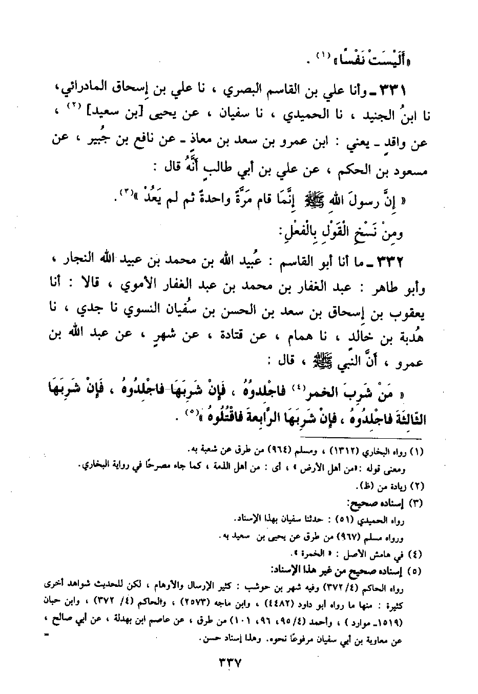 وَمِنْ نَسْخِ الْقَوْلِ بِالْفِعْلِ مَا أنا أَبُو الْقَاسِمِ عُبَيْدُ اللَّهِ بْنُ مُحَمَّدِ بْنِ عُبَيْدِ اللَّهِ النَّجَّارُ , وَأَبُو طَاهِرٍ عَبْدُ الْغَفَّارِ بْنِ مُحَمَّدِ بْنِ عَبْدِ الْغَفَّارِ الْأُمَوِيُّ قَالَا: أنا يَعْقُوبُ بْنُ إِسْحَاقَ بْنِ سَعْدِ بْنِ الْحَسَنِ بْنِ سُفْيَانَ النَّسَوِيُّ , نا جَدِّي , نا هُدْبَةُ بْنُ خَالِدٍ , نا هَمَّامٌ , عَنْ قَتَادَةَ , عَنْ شَهْرٍ , عَنْ عَبْدِ اللَّهِ بْنِ عَمْرٍو , أَنَّ النَّبِيَّ صَلَّى اللهُ عَلَيْهِ وَسَلَّمَ قَالَ: «مَنْ شَرِبَ الْخَمْرَ فَاجْلِدُوهُ , فَإِنْ شَرِبَهَا فَاجْلِدُوهُ , فَإِنْ شَرِبَهَا الثَّالِثَةَ فَاجْلِدُوهُ , فَإِنْ شَرِبَهَا الرَّابِعَةَ فَاقْتُلُوهُ»