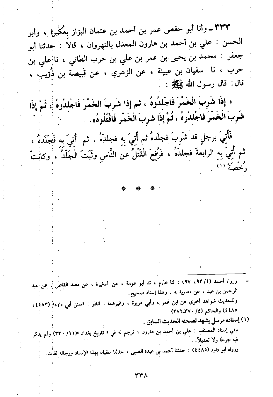 وَأَنَا أَبُو حَفْصٍ , عُمَرُ بْنُ أَحْمَدَ بْنِ عُثْمَانَ الْبَزَّازُ بِعُكْبُرَا , وَأَبُو الْحَسَنِ عَلِيُّ بْنُ أَحْمَدَ بْنِ هَارُونَ الْمُعَدِّلُ بِالنَّهْرَوَانِ قَالَا: حَدَّثَنَا أَبُو جَعْفَرٍ , مُحَمَّدُ بْنُ يَحْيَى بْنِ عُمَرَ بْنِ عَلِيِّ بْنِ حَرْبٍ الطَّائِيُّ , نا عَلِيُّ بْنُ حَرْبٍ , نا سُفْيَانُ بْنُ عُيَيْنَةَ , عَنِ الزُّهْرِيِّ , عَنْ قَبِيصَةَ بْنِ ذُؤَيْبٍ , قَالَ: قَالَ رَسُولُ اللَّهِ صَلَّى اللهُ عَلَيْهِ وَسَلَّمَ: «إِذَا شَرِبَ الْخَمْرَ فَاجْلِدُوهُ , ثُمَّ إِذَا شَرِبَ الْخَمْرَ فَاجْلِدُوهُ , ثُمَّ إِذَا شَرِبَ الْخَمْرَ فَاجْلِدُوهُ , ثُمَّ إِذَا شَرِبَ الْخَمْرَ فَاقْتُلُوهُ» فَأُتِيَ بِرَجُلٍ قَدْ شَرِبَ فَجَلَدَهُ ثُمَّ أُتِيَ بِهِ فَجَلَدَهُ , ثُمَّ أُتِيَ بِهِ فَجَلَدَهُ , ثُمَّ أُتِيَ بِهِ الرَّابِعَةَ فَجَلَدَهُ , فَرَفَعَ الْقَتْلَ عَنِ النَّاسِ وَثَبَّتَ الْجِلْدَ , وَكَانَتْ رُخْصَةً