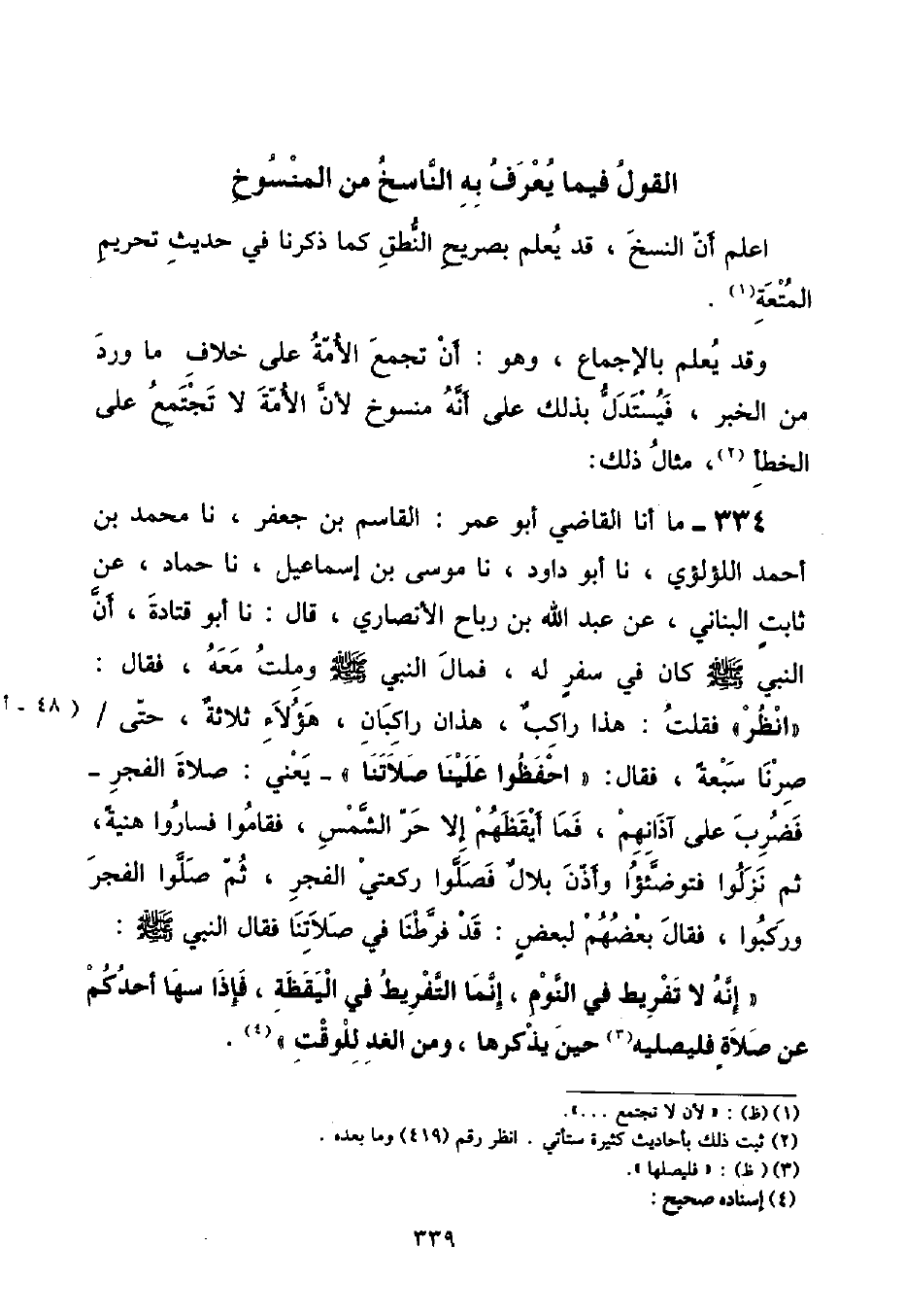 مَا أنا الْقَاضِي أَبُو عُمَرَ الْقَاسِمُ بْنُ جَعْفَرٍ , نا مُحَمَّدُ بْنُ أَحْمَدَ اللُّؤْلُؤِيُّ , نا أَبُو دَاوُدَ , نا مُوسَى بْنُ إِسْمَاعِيلَ , نا حَمَّادُ , عَنْ ثَابِتٍ الْبُنَانِيِّ , عَنْ عَبْدِ اللَّهِ بْنِ رَبَاحٍ الْأَنْصَارِيِّ , قَالَ: نا أَبُو قَتَادَةَ , أَنَّ النَّبِيَّ صَلَّى اللهُ عَلَيْهِ وَسَلَّمَ كَانَ فِي سَفَرٍ لَهُ , فَمَالَ النَّبِيُّ صَلَّى اللهُ عَلَيْهِ وَسَلَّمَ وَمِلْتُ مَعَهُ , فَقَالَ: «انْظُرْ» فَقُلْتُ: هَذَا رَاكِبٌ , هَذَانِ رَاكِبَانِ , هَؤُلَاءِ ثَلَاثَةٌ , حَتَّى صِرْنَا سَبْعَةً , فَقَالَ: «احْفَظُوا عَلَيْنَا صَلَاتِنَا» - يَعْنِي: صَلَاةَ الْفَجْرِ - فَضَرَبَ عَلَى آذَانِهِمْ , فَمَا أَيْقَظَهُمْ إِلَّا حُرُّ الشَّمْسِ , فَقَامُوا فَسَارُوا هُنَيَّةً , ثُمَّ نَزَلُوا فَتَوَضَّئُوا وَأَذَّنَ بِلَالٌ فَصَلَّوْا رَكْعَتَيِ الْفَجْرِ , ثُمَّ صَلَّوَا الْفَجْرَ وَرَكِبُوا , فَقَالَ: بَعْضُهُمْ لِبَعْضٍ: قَدْ فَرَّطْنَا فِي صَلَاتِنَا فَقَالَ النَّبِيُّ صَلَّى اللهُ عَلَيْهِ وَسَلَّمَ: «إِنَّهُ لَا تَفْرِيطَ فِي النَّوْمِ , إِنَّمَا التَّفْرِيطُ فِي الْيَقَظَةِ , فَإِذَا سَهَا أَحَدُكُمْ عَنْ صَلَاةٍ فَلْيُصَلِّهَا حِينَ يَذْكُرُهَا , وَمِنَ الْغَدِ لِلْوَقْتِ» ⦗٣٤٠⦘ وَالْأَمْرُ بِإِعَادَةِ الصَّلَاةِ الْمَنْسِيَّةِ بَعْدَ قَضَائِهَا حَالَ الذِّكْرِ مِنْ غَدِ ذَلِكَ الْوَقْتِ مَنْسُوخٌ لِإِجْمَاعِ الْمُسْلِمِينَ أَنَّ ذَلِكَ غَيْرُ وَاجِبٍ وَلَا مُسْتَحَبٍّ وَمِثْلُهُ