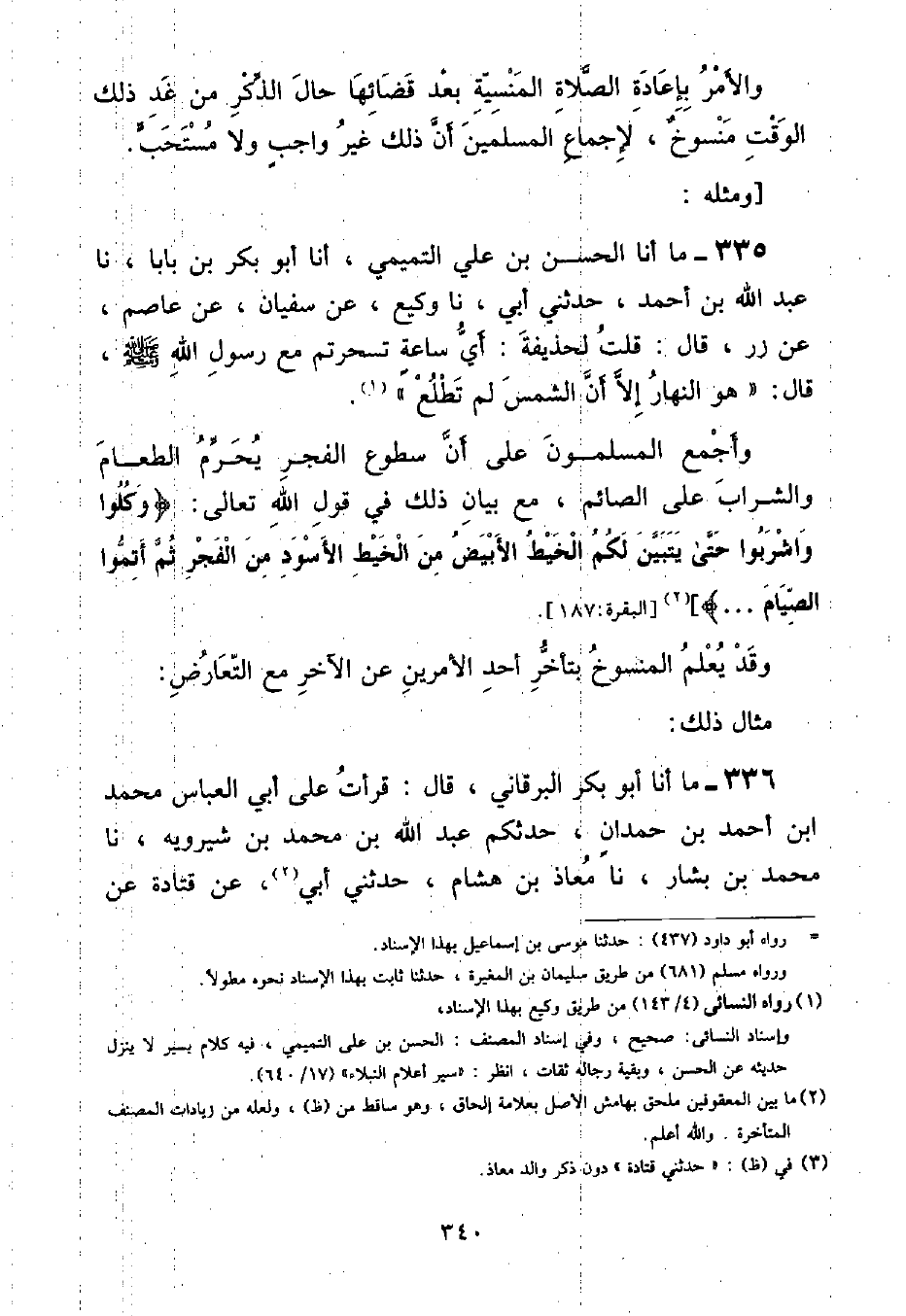 مَا أنا الْحَسَنُ بْنُ عَلِيٍّ التَّمِيمِيُّ , أنا أَبُو بَكْرِ بْنُ بَابَا , نا عَبْدُ اللَّهِ بْنُ أَحْمَدَ , حَدَّثَنِي أَبِي , نا وَكِيعٌ , عَنْ سُفْيَانَ , عَنْ عَاصِمٍ , عَنْ زِرٍّ , قَالَ: قُلْتُ لِحُذَيْفَةَ: أَيُّ سَاعَةٍ تَسَحَّرْتُمْ مَعَ رَسُولِ اللَّهِ صَلَّى اللهُ عَلَيْهِ وَسَلَّمَ قَالَ: «هُوَ النَّهَارُ إِلَّا أَنَّ الشَّمْسَ لَمْ تَطْلُعْ» وَأَجْمَعَ الْمُسْلِمُونَ عَلَى أَنَّ سُطُوعَ الْفَجْرِ يُحَرِّمُ الطَّعَامَ وَالشَّرَابَ عَلَى الصَّائِمِ , مَعَ بَيَانِ ذَلِكَ فِي قَوْلِ اللَّهِ تَعَالَى: {وَكُلُوا وَاشْرَبُوا حَتَّى يَتَبَيَّنَ لَكُمُ الْخَيْطُ الْأَبْيَضُ مِنَ الْخَيْطِ الْأَسْوَدِ مِنَ الْفَجْرِ ثُمَّ أَتِمُّوا الصِّيَامَ} [البقرة: ١٨٧] وَقَدْ يُعْلَمُ الْمَنْسُوخُ بِتَأَخُّرِ أَحَدِ الْأَمْرَيْنِ عَنِ الْآخَرِ مَعَ التَّعَارُضِ: مِثَالُ ذَلِكَ: