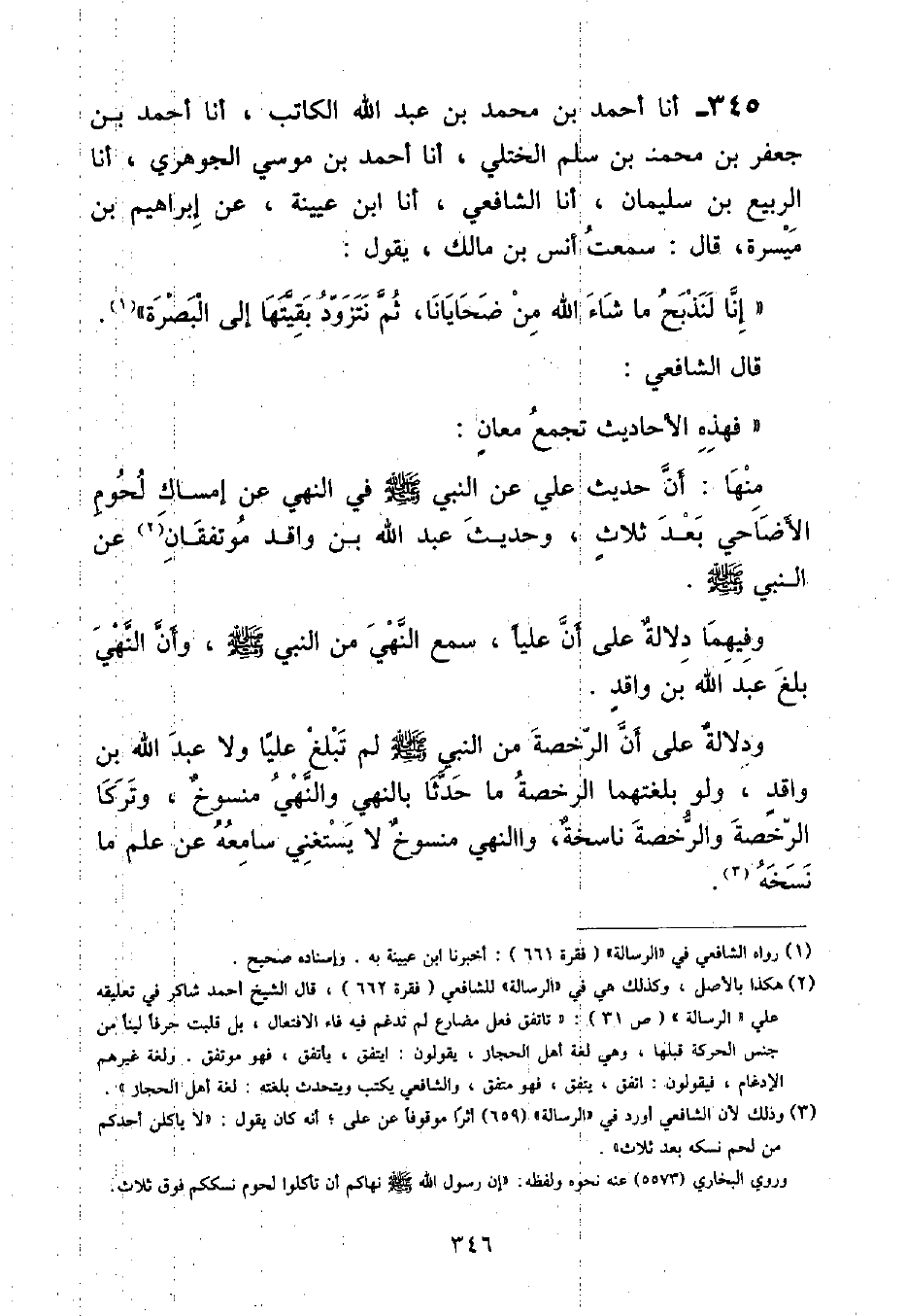 أنا أَحْمَدُ بْنُ مُحَمَّدِ بْنِ عَبْدِ اللَّهِ الْكَاتِبُ , أنا أَحْمَدُ بْنُ جَعْفَرِ بْنِ مُحَمَّدِ بْنِ سَلْمٍ الْخُتَّلِيُّ , أنا أَحْمَدُ بْنُ مُوسَى الْجَوْهَرِيُّ , أنا الرَّبِيعُ بْنُ سُلَيْمَانَ , أنا الشَّافِعِيُّ , أنا ابْنُ عُيَيْنَةَ , عَنْ إِبْرَاهِيمَ بْنِ مَيْسَرَةَ , قَالَ: سَمِعْتُ أَنَسَ بْنَ مَالِكٍ , يَقُولُ: «إِنَّا لَنَذْبَحُ مَا شَاءَ اللَّهُ مِنْ ضَحَايَانَا , ثُمَّ نَتَزَوَّدُ بَقِيَّتَهَا إِلَى الْبَصْرَةِ» قَالَ الشَّافِعِيُّ: " فَهَذِهِ الْأَحَادِيثُ تَجْمَعُ مُعَانٍ: مِنْهَا: أَنَّ حَدِيثَ عَلِيٍّ عَنِ النَّبِيِّ صَلَّى اللهُ عَلَيْهِ وَسَلَّمَ فِي النَّهْيِ عَنْ إِمْسَاكِ لُحُومِ الْأَضَاحِي بَعْدَ ثَلَاثٍ , وَحَدِيثَ عَبْدِ اللَّهِ بْنِ وَاقِدٍ مُتَّفِقَانِ عَنِ النَّبِيِّ صَلَّى اللهُ عَلَيْهِ وَسَلَّمَ وَفِيهِمَا دَلَالَةٌ عَلَى أَنَّ عَلِيًّا سَمِعَ النَّهْيَ مِنَ النَّبِيَّ صَلَّى اللهُ عَلَيْهِ وَسَلَّمَ , وَأَنَّ النَّهْيَ بَلَغَ عَبْدَ اللَّهِ بْنَ وَاقِدٍ وَدِلَالَةٌ عَلَى أَنَّ الرُّخْصَةَ مِنَ النَّبِيِّ صَلَّى اللهُ عَلَيْهِ وَسَلَّمَ لَمْ تَبْلُغْ عَلِيًّا وَلَا عَبْدَ اللَّهِ بْنَ وَاقِدٍ , وَلَوْ بَلَغَتْهُمَا الرُّخْصَةُ مَا حَدَّثَا بِالنَّهْيِ وَالنَّهْيُ مَنْسُوخٌ , وَتَرَكَا الرُّخْصَةَ وَالرُّخْصَةُ نَاسِخَةٌ , وَالنَّهْيُ مَنْسُوخٌ لَا يَسْتَغْنِي سَامِعُهُ عَنْ عِلْمِ مَا نَسَخَهُ ⦗٣٤٧⦘ وَقَوْلُ أَنَسِ بْنِ مَالِكٍ: كُنَّا نَهْبِطُ بِلُحُومِ الضَّحَايَا الْبَصْرَةِ يَحْتَمِلُ أَنْ يَكُونَ أَنَسٌ سَمِعَ الرُّخْصَةَ وَلَمْ يَسْمَعِ النَّهْيَ قَبْلَهَا , فَتَزَوَّدَ بِالرُّخْصَةِ وَلَمْ يَسْمَعْ نَهْيًا , أَوْ سَمِعَ الرُّخْصَةَ وَالنَّهْيَ , فَكَانَ النَّهْيُ مَنْسُوخًا , فَلَمْ يَذْكُرْهُ , فَقَالَ: كُلُّ وَاحِدٍ مِنَ الْمُخْتَلِفَيْنِ بِمَا عَلِمَ وَهَكَذَا يَجِبُ عَلَى كُلِّ مَنْ سَمِعَ شَيْئًا مِنْ رَسُولِ اللَّهِ صَلَّى اللهُ عَلَيْهِ وَسَلَّمَ , أَوْ ثَبَتَ لَهُ عَنْهُ أَنْ يَقُولَ مِنْهُ بِمَا سَمِعَ حَتَّى يَعْلَمَ غَيْرَهُ قَالَ الشَّافِعِيُّ: فَلَمَّا حُدِّثْتُ عَائِشَةَ عَنِ النَّبِيِّ صَلَّى اللهُ عَلَيْهِ وَسَلَّمَ بِالنَّهْيِ عَنْ إِمْسَاكِ لُحُومِ الضَّحَايَا بَعْدَ ثَلَاثٍ , ثُمَّ الرُّخْصَةِ فِيهَا بَعْدَ النَّهْيِ , وَأَنَّ رَسُولَ اللَّهِ صَلَّى اللهُ عَلَيْهِ وَسَلَّمَ أَخْبَرَ أَنَّهُ إِنَّمَا نَهَى عَنْ إِمْسَاكِ لُحُومِ الضَّحَايَا بَعْدَ ثَلَاثٍ لِلدَّافَّةِ , كَانَ الْحَدِيثَ التَّامَّ الْمَحْفُوظَ أَوَّلُهُ وَآخِرُهُ , وَسَبَبُ التَّحْرِيمِ وَالْإِحْلَالِ فِيهِ حَدِيثُ عَائِشَةَ وَكَانَ عَلَى مَنْ عَلِمَهُ أَنْ يَصِيرَ إِلَيْهِ وَحَدِيثُ عَائِشَةَ مِنْ أَبْيَنِ مَا يُوجَدُ فِي النَّاسِخِ وَالْمَنْسُوخِ مِنَ السُّنَنِ , وَهَذَا يَدُلُّ عَلَى أَنَّ بَعْضَ الْحَدِيثِ يُخْتَصَرُ فَيُحْفَظُ بَعْضُهُ دُونَ بَعْضٍ , فَيُحْفَظُ مِنْهُ شَيْءٌ كَانَ أَوَّلًا , وَلَا يُحْفَظُ آخِرًا , وَيُحْفَظُ آخِرًا وَلَا يُحْفَظُ أَوَّلًا , فَيُؤَدِّي كُلُّ مَا حُفِظَ , وَالرُّخْصَةُ بَعْدَهَا فِي الْإِمْسَاكِ وَالْأَكْلِ وَالصَّدَقَةِ مِنْ لُحُومِ الضَّحَايَا إِنَّمَا هِيَ لِوَاحِدٍ مِنْ مَعْنَيَيْنِ , لِاخْتِلَافِ الْحَالَيْنِ: فَإِذَا دَفَّتِ الدَّافَّةُ ثَبَتَ النَّهْيُ عَنْ إِمْسَاكِ لُحُومِ الضَّحَايَا بَعْدَ ثَلَاثٍ , وَإِذَا لَمْ تَدِفَّ دَافَّةٌ فَالرُّخْصَةُ ثَابِتَةٌ بِالْأَكْلِ وَالتَّزَوُّدِ , وَالْإِدِّخَارِ وَالصَّدَقَةِ ⦗٣٤٨⦘ وَيُحْتَمَلُ أَنْ يَكُونَ النَّهْيُ عَنْ إِمْسَاكِ لُحُومِ الضَّحَايَا بَعْدَ ثَلَاثٍ مَنْسُوخًا بِكُلِّ حَالٍ , فَيُمْسِكُ الْإِنْسَانُ مِنْ ضَحِيَّتِهِ مَا شَاءَ وَيَتَصَ