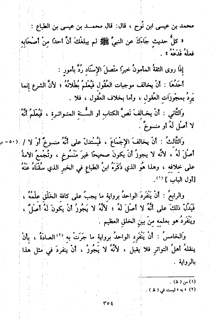 مُحَمَّدِ بْنِ عِيسَى بْنِ نُوحٍ , قَالَ: قَالَ مُحَمَّدُ بْنُ عِيسَى بْنِ الطَّبَّاعِ: «كُلُّ حَدِيثٍ جَاءَكَ عَنِ النَّبِيِّ صَلَّى اللهُ عَلَيْهِ وَسَلَّمَ لَمْ يَبْلُغْكَ أَنَّ أَحَدًا مِنْ أَصْحَابِهِ فَعَلَهُ فَدَعْهُ» إِذَا رَوَى الثِّقَةُ الْمَأْمُونُ خَبَرًا مُتَّصِلَ الْإِسْنَادِ رُدَّ بِأُمُورٍ: أَحَدُهَا: أَنْ يُخَالِفَ مُوجِبَاتِ الْعُقُولِ فَيُعْلَمُ بُطْلَانُهُ , لِأَنَّ الشَّرْعَ إِنَّمَا يُرَدُّ بِمُجَوِّزَاتِ الْعُقُولِ , وَأَمَّا بِخِلَافِ الْعُقُولِ , فَلَا وَالثَّانِي: أَنْ يُخَالِفَ نَصَّ الْكِتَابِ أَوِ السُّنَّةِ الْمُتَوَاتِرَةِ , فَيَعْلَمُ أَنَّهُ لَا أَصْلَ لَهُ أَوْ مَنْسُوخٌ وَالثَّالِثُ: أَنْ يُخَالِفَ الْإِجْمَاعَ , فَيُسْتَدَلُّ عَلَى أَنَّهُ مَنْسُوخٌ أَوْ لَا أَصْلَ لَهُ , لِأَنَّهُ لَا يَجُوزُ أَنْ يَكُونَ صَحِيحًا غَيْرَ مَنْسُوخٍ , وَتُجْمِعُ الْأُمَّةُ عَلَى خِلَافِهِ , وَهَذَا هُوَ الَّذِي ذَكَرَهُ ابْنُ الطَّبَّاعِ فِي الْخَبَرِ الَّذِي سُقْنَاهُ عَنْهُ أَوَّلَ البَابِ وَالرَّابِعُ: أَنْ يَنْفَرِدَ الْوَاحِدُ بِرَاوِيَةِ مَا يَجِبُ عَلَى كَافَّةِ الْخَلْقِ عِلْمُهُ , فَيَدُلُّ ذَلِكَ عَلَى أَنَّهُ لَا أَصْلَ لَهُ , لِأَنَّهُ لَا يَجُوزُ أَنْ يَكُونَ لَهُ أَصْلٌ , وَيَنْفَرِدُ هُوَ بِعِلْمِهِ مِنْ بَيْنِ الْخَلْقِ الْعَظِيمِ وَالْخَامِسُ: أَنْ يَنْفَرِدَ الْوَاحِدُ بِرَاوِيَةِ مَا جَرَتْ بِهِ الْعَادَةُ , بِأَنْ يَنْقُلَهُ أَهْلُ التَّوَاتُرِ فَلَا يُقْبَلُ , لِأَنَّهُ لَا يَجُوزُ , أَنْ يَنْفَرِدَ فِي مِثْلِ هَذَا بِالرِّوَايَةِ