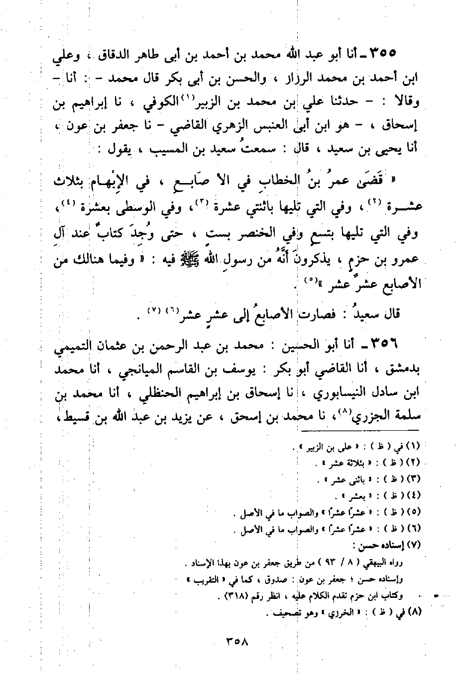 أنا أَبُو الْحُسَيْنِ , مُحَمَّدُ بْنُ عَبْدِ الرَّحْمَنِ بْنِ عُثْمَانَ التَّمِيمِيُّ بِدِمَشْقَ , أنا الْقَاضِي أَبُو بَكْرٍ , يُوسُفُ بْنُ الْقَاسِمِ الْمَيَانِجِيُّ , أنا مُحَمَّدُ ابْنُ سَادِلٍ النَّيْسَابُورِيُّ , نا إِسْحَاقُ بْنُ إِبْرَاهِيمَ الْحَنْظَلِيُّ , أنا مُحَمَّدُ بْنُ سَلَمَةَ الْجَزَرِيُّ , نا مُحَمَّدُ بْنُ إِسْحَاقَ , عَنْ يَزِيدَ بْنِ عَبْدِ اللَّهِ بْنِ قُسَيْطٍ , ⦗٣٥٩⦘ عَنْ سَعِيدِ بْنِ الْمُسَيِّبِ , قَالَ: كَانَ عُمَرُ بْنُ الْخَطَّابِ يَجْعَلُ فِي الْإِبْهَامِ وَالَّتِي تَلِيهَا نِصْفَ دِيَةِ الْكَفِّ , وَيَجْعَلُ فِي الْإِبْهَامِ خَمْسَ عَشْرَةَ , وَفِي الَّتِي تَلِيهَا عَشْرًا , وَفِي الْوسْطَى عَشْرًا , وَفِي الَّتِي تَلِيهَا تِسْعًا , وَفِي الْآخِرَةِ سِتًّا , حَتَّى كَانَ عُثْمَانُ بْنُ عَفَّانَ , فَوَجَدَ كِتَابًا كَتَبَهُ رَسُولُ اللَّهِ صَلَّى اللهُ عَلَيْهِ وَسَلَّمَ لِعَمْرِو بْنِ حَزْمٍ فِيهِ: «وَفِي الْأَصَابِعِ عَشْرٌ عَشْرٌ» فَصَيَّرَهَا عُثْمَانُ عَشْرًا عَشْرًا