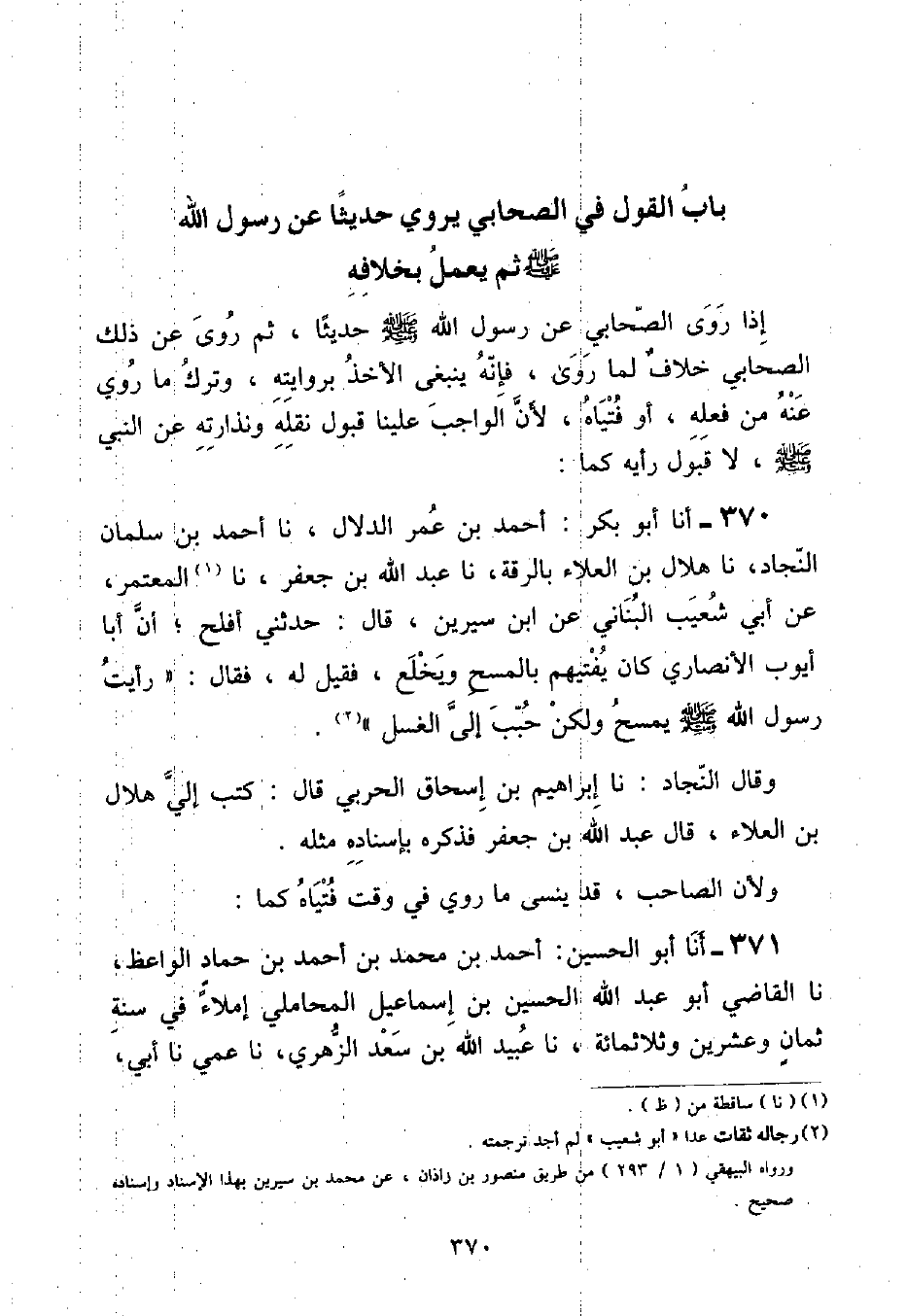 أنا أَبُو بَكْرٍ أَحْمَدُ بْنُ عُمَرَ الدَّلَّالُ , نا أَحْمَدُ بْنُ سَلْمَانَ النِّجَادُ , نا هِلَالُ بْنُ الْعَلَاءِ , بِالرَّقَّةِ , نا عَبْدُ اللَّهِ بْنُ جَعْفَرٍ , نا الْمُعْتَمِرُ , عَنْ أَبِي شُعَيْبٍ الْبُنَانِيِّ , عَنِ ابْنِ سِيرِينَ , قَالَ: حَدَّثَنِي أَفْلَحُ , أَنَّ أَبَا أَيُّوبَ الْأَنْصَارِيَّ , كَانَ يُفْتِيهِمْ بِالْمَسْحِ وَيَخْلَعُ , فَقِيلَ لَهُ , فَقَالَ: «رَأَيْتُ رَسُولَ اللَّهِ صَلَّى اللهُ عَلَيْهِ وَسَلَّمَ يَمْسَحُ وَلَكِنْ حُبِّبَ إِلَيَّ الْغَسْلُ» وَقَالَ النِّجَادُ: نا إِبْرَاهِيمُ بْنُ إِسْحَاقَ الْحَرْبِيُّ قَالَ: كَتَبَ إِلَيَّ هِلَالُ بْنُ الْعَلَاءِ: قَالَ عَبْدُ اللَّهِ بْنُ جَعْفَرٍ فَذَكَرَهُ بِإِسْنَادِهِ مِثْلَهُ , وَلِأَنَّ الصَّاحِبَ قَدْ يَنْسَى مَا رُوِيَ فِي وَقْتِ فُتْيَاهُ كَمَا: