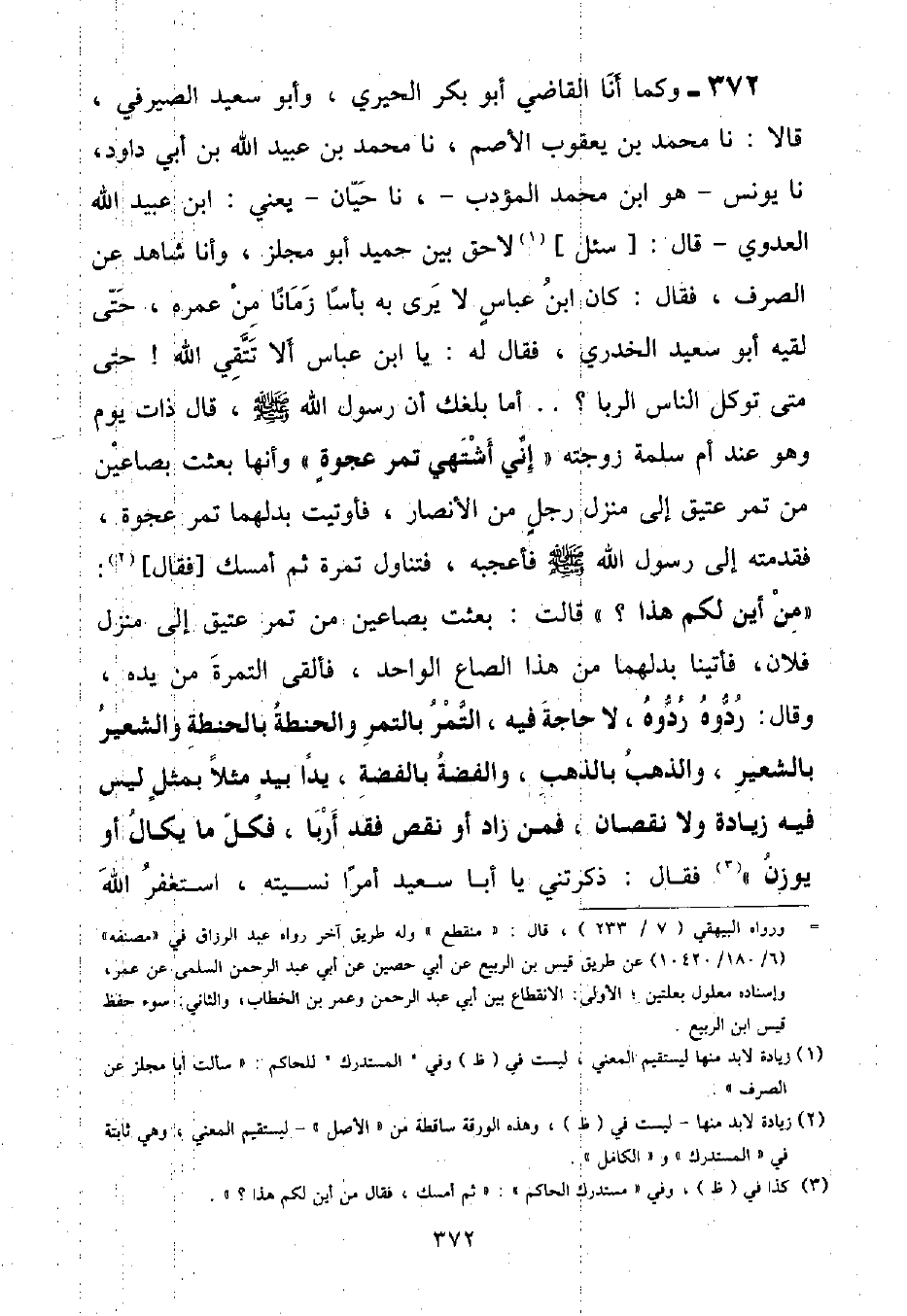 وَكَمَا أنا الْقَاضِي أَبُو بَكْرٍ الْحِيرِيُّ , وَأَبُو سَعِيدٍ الصَّيْرَفِيُّ قَالَا: نا مُحَمَّدُ بْنُ يَعْقُوبَ الْأَصَمُّ , نا مُحَمَّدُ بْنُ عُبَيْدِ اللَّهِ بْنِ أَبِي دَاوُدَ , نا يُونُسُ: هُوَ ابْنُ مُحَمَّدٍ الْمُؤَدِّبُ , نا حَيَّانُ يَعْنِي ابْنَ عُبَيْدِ اللَّهِ الْعَدَوِيَّ , قَالَ: سُئِلَ لَاحْقُ بْنُ حُمَيْدٍ أَبُو مِجْلَزٍ , وَأَنَا شَاهِدٌ , عَنِ الصَّرْفِ , فَقَالَ: كَانَ ابْنُ عَبَّاسٍ لَا يَرَى بِهِ بَأْسًا زَمَانًا مِنْ عُمْرِهِ , حَتَّى لَقِيَهُ أَبُو سَعِيدٍ الْخُدْرِيُّ , فَقَالَ لَهُ: يَا ابْنَ عَبَّاسٍ أَلَا تَتَّقِي اللَّهَ حَتَّى مَتَى تَوَكِّلُ النَّاسَ الرِّبَا؟ أَمَا بَلَغَكَ أَنَّ رَسُولَ اللَّهِ صَلَّى اللهُ عَلَيْهِ وَسَلَّمَ قَالَ ذَاتَ يَوْمٍ وَهُوَ عِنْدَ أُمِّ سَلَمَةَ زَوْجَتِهِ: «إِنِّي أَشْتَهِي تَمْرَ عَجْوَةٍ» وَإِنَّهَا بَعَثَتْ بِصَاعَيْنِ مِنْ تَمْرٍ عَتِيقٍ إِلَى مَنْزِلِ رَجُلٍ مِنَ الْأَنْصَارِ , فَأُوتِيَتْ بَدَلَهُمَا تَمْرَ عَجْوَةٍ , فَقَدَّمْتُهُ إِلَى رَسُولِ اللَّهِ صَلَّى اللهُ عَلَيْهِ وَسَلَّمَ فَأَعْجَبَهُ , فَتَنَاوَلَ تَمْرَةً ثُمَّ أَمْسَكَ فَقَالَ: «مِنْ أَيْنَ لَكُمْ هَذَا؟» قَالَتْ: بَعَثْتُ بِصَاعَيْنِ مِنْ تَمْرٍ عَتِيقٍ إِلَى مَنْزِلِ فُلَانٍ , فَأَتَيْنَا بَدَلَهُمَا مِنْ هَذَا الصَّاعِ الْوَاحِدِ , فَأَلْقَى التَّمْرَةَ مِنْ يَدِهِ , وَقَالَ: «رُدُّوهُ رُدُّوهُ , لَا حَاجَةَ فِيهِ , التَّمْرُ بِالتَّمْرِ وَالْحِنْطَةُ بِالْحِنْطَةِ , وَالشَّعِيرُ بِالشَّعِيرِ , وَالذَّهَبُ بِالذَّهَبِ , وَالْفِضَّةُ بِالْفِضَّةِ , يَدًا بِيَدٍ مِثْلًا بِمِثْلٍ لَيْسَ فِيهِ زِيَادَةٌ وَلَا نُقْصَانٌ , فَمَنْ زَادَ أَوْ نَقَصَ فَقَدْ أَرْبَا , فَكُلُّ مَا يُكَالُ أَوْ يُوزَنُ» فَقَالَ: ذَكَّرْتَنِي يَا أَبَا سَعِيدٍ أَمْرًا نَسِيتُهُ , اسْتَغْفِرُ اللَّهَ ⦗٣٧٣⦘ وَأَتُوبُ إِلَيْهِ , وَكَانَ يَنْهَى بَعْدَ ذَلِكَ - يَعْنِي عَنْهُ - أَشَدَّ النَّهْيِ وَلِأَنَّ الصَّحَابِيَّ قَدْ ذَكَرَ مَا رُوِيَ إِلَّا أَنَّهُ يَتَأَوَّلُ فِيهِ تَأْوِيلًا يَصْرِفُهُ عَنْ ظَاهِرِهِ , كَمَا تَأَوَّلَتْ أُمُّ الْمُؤْمِنِينَ عَائِشَةُ فِي إِتْمَامِ الصَّلَاةِ فِي السَّفَرِ , وَهَى الَّتِي رَوَتْ: فُرِضَتِ الصَّلَاةُ رَكْعَتَيْنِ , فَزِيدَ فِي صَلَاةِ الْحَضَرِ , وَأَقَرَّتْ صَلَاةَ السَّفَرِ , وَلِأَنَّهُ لَا يَحِلُّ أَنْ يُظَنَّ بِالصَّاحِبِ أَنْ يَكُونَ عِنْدَهُ نَسْخٌ لَمَّا رَوَى أَوْ تَخْصِيصٌ فَيَسْكُتُ عَنْهُ , وَيُبَلِّغُ إِلَيْنَا الْمَنْسُوخَ وَالْمَخْصُوصَ دُونَ الْبَيَانِ , لِأَنَّ اللَّهَ تَعَالَى يَقُولُ: {إِنَّ الَّذِينَ يَكْتُمُونَ مَا أَنْزَلْنَا مِنَ الْبَيِّنَاتِ وَالْهُدَى مِنْ بَعْدَ مَا بَيَّنَّاهُ لِلنَّاسِ فِي الْكِتَابِ أُولَئِكَ يَلْعَنُهُمُ اللَّهُ وَيَلْعَنُهُمُ اللَّاعِنُونَ} [البقرة: ١٥٩] وَقَدْ نَزَّهَ اللَّهُ صَحَابَةَ نَبِيِّهِ صَلَّى اللهُ عَلَيْهِ وَسَلَّمَ عَنْ هَذَا