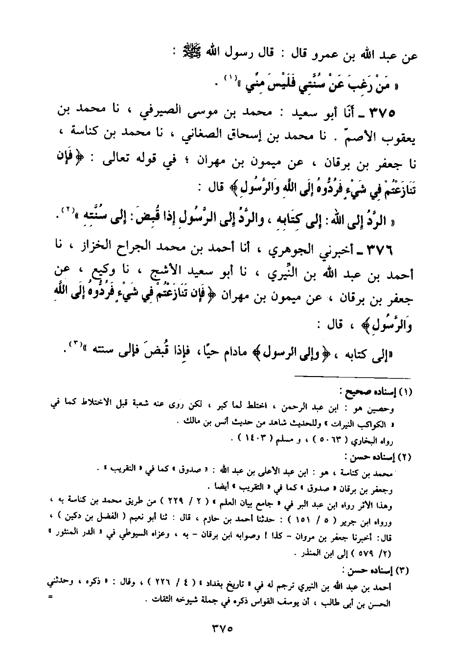 أنا أَبُو سَعِيدٍ مُحَمَّدُ بْنُ مُوسَى الصَّيْرَفِيُّ , نا مُحَمَّدُ بْنُ يَعْقُوبَ الْأَصَمُّ , نا مُحَمَّدُ بْنُ إِسْحَاقَ الصَّغَانِيُّ , نا مُحَمَّدُ بْنُ كُنَاسَةَ , نا جَعْفَرُ بْنُ بُرْقَانَ , عَنْ مَيْمُونِ بْنِ مِهْرَانَ , فِي قَوْلِهِ تَعَالَى: {فَإِنْ تَنَازَعْتُمْ فِي شَيْءٍ فَرُدُّوهُ إِلَى اللَّهِ وَالرَّسُولِ} [النساء: ٥٩] قَالَ: " الرَّدُّ إِلَى اللَّهِ: إِلَى كِتَابِهِ , وَالرَّدُّ إِلَى الرَّسُولِ إِذَا قُبِضَ: إِلَى سُنَّتِهِ "