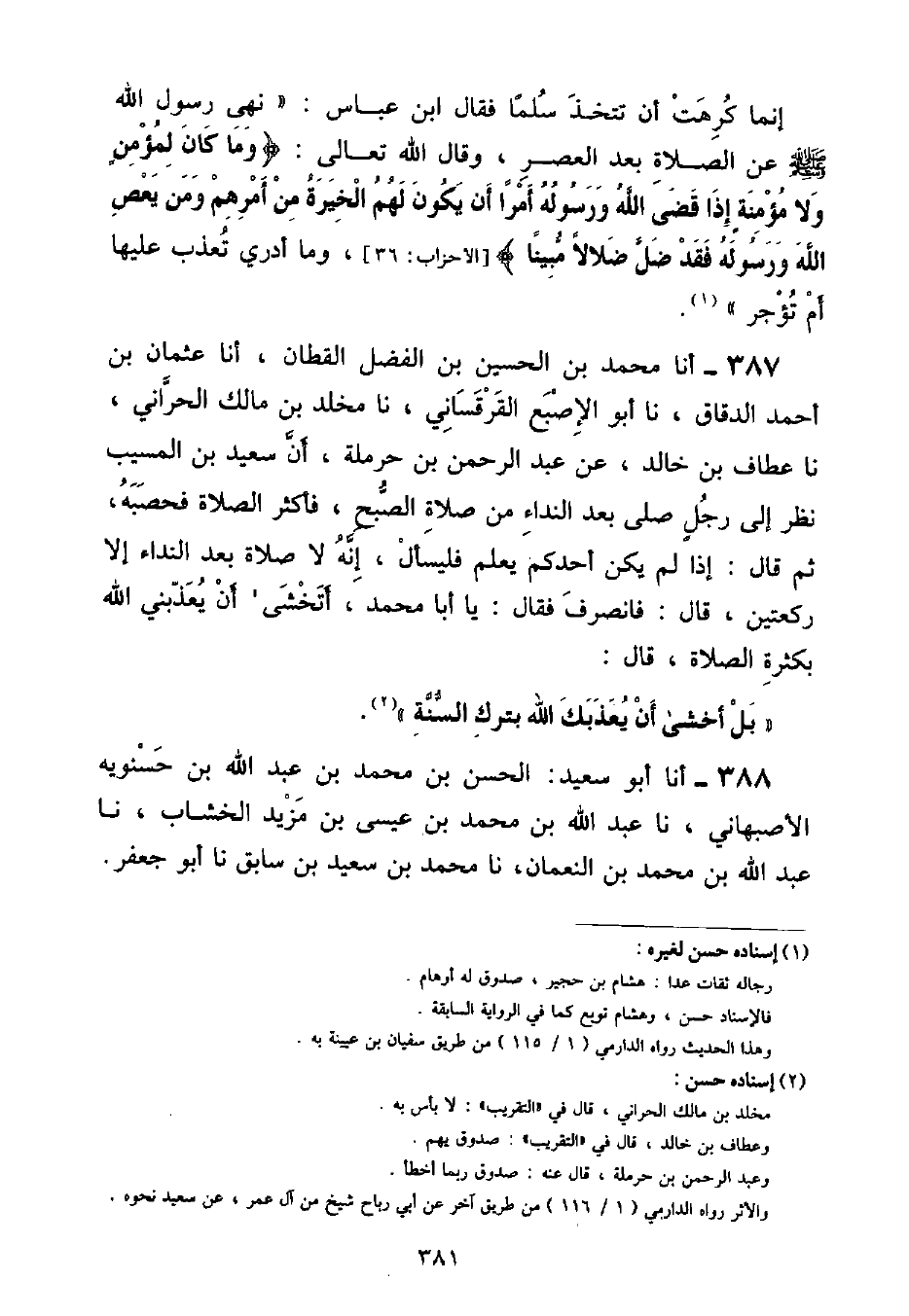 أنا مُحَمَّدُ بْنُ الْحُسَيْنِ بْنِ الْفَضْلِ الْقَطَّانُ , أنا عُثْمَانُ بْنُ أَحْمَدَ الدَّقَّاقُ , نا أَبُو الْإِصْبَعِ الْقَرْقَسَانِيُّ , نا مَخْلَدُ بْنُ مَالِكٍ الْحَرَّانِيُّ , نا عَطَّافُ بْنُ خَالِدٍ , عَنْ عَبْدِ الرَّحْمَنِ بْنِ حَرْمَلَةَ , أَنَّ سَعِيدَ بْنَ الْمُسَيِّبِ , نَظَرَ إِلَى رَجُلٍ صَلَّى بَعْدَ النِّدَاءِ مِنْ صَلَاةِ الصُّبْحِ , فَأَكْثَرَ الصَّلَاةَ فَحَصَبَهُ , ثُمَّ قَالَ: «إِذَا لَمْ يَكُنْ أَحَدُكُمْ يَعْلَمُ فَلْيَسْأَلْ , إِنَّهُ لَا صَلَاةَ بَعْدَ النِّدَاءِ إِلَّا رَكْعَتَيْنِ» قَالَ: فَانْصَرَفَ فَقَالَ: يَا أَبَا مُحَمَّدٍ , أَتَخْشَى أَنْ يُعَذِّبُنِيَ اللَّهُ بِكَثْرَةِ الصَّلَاةِ؟ قَالَ: «بَلْ أَخْشَى أَنْ يُعَذِّبَكَ اللَّهُ بِتَرْكِ السُّنَّةِ»