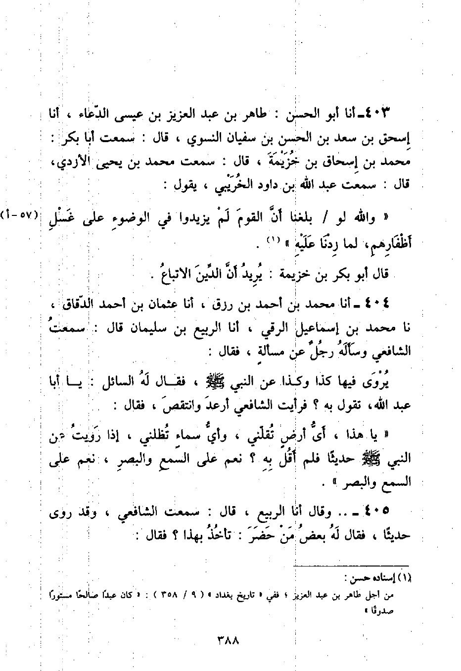 أنا أَبُو الْحَسَنِ , عَلِيُّ بْنُ مُحَمَّدِ بْنِ عُبَيْدِ اللَّهِ الْفَارِسِيُّ بنَيْسَابُورَ , نا أَبُو أَحْمَدَ , مُحَمَّدُ بْنُ مُحَمَّدِ بْنِ أَحْمَدَ الْحَافِظُ , أنا أَبُو الْعَبَّاسِ , أَحْمَدُ بْنُ عَبْدِ اللَّهِ بْنِ سَابُورَ الدَّقِيقِيُّ بِبَغْدَادَ , نا إِسْحَاقُ يَعْنِي ابْنَ أَبِي إِسْرَائِيلَ قَالَ: سَمِعْتُ سُفْيَانَ بْنَ عُيَيْنَةَ , وَذُكِرَ , عِنْدَهُ حَمَّادُ بْنُ زَيْدٍ - فَجَعَلَ يُعَظِّمُ مِنْ أْمَرِهِ ثُمَّ قَالَ: «يَرْحَمُهُ اللَّهُ , إِنْ كَانَ لَمُتَّبِعًا لِسُنَّةِ نَبِيِّهِ صَلَّى اللهُ عَلَيْهِ وَسَلَّمَ» قَالَ سُفْيَانُ: «مِلَاكُ الْأَمْرِ الِاتِّبَاعُ»