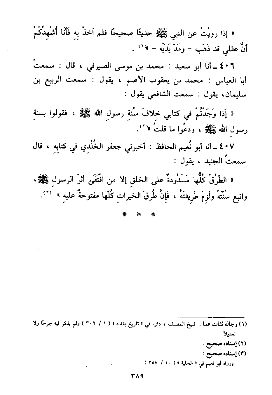 أنا أَبُو نُعَيْمٍ الْحَافِظُ: أَخْبَرَنِي جَعْفَرٌ الْخُلْدِيُّ , فِي كِتَابِهِ قَالَ: سَمِعْتُ الْجُنَيْدَ , يَقُولُ: «الطُّرُقُ كُلَّهَا مَسْدُودَةٌ عَلَى الْخَلْقِ إِلَّا مَنِ اقْتَفَى أَثَرَ الرَّسُولِ صَلَّى اللهُ عَلَيْهِ وَسَلَّمَ , وَاتَّبَعَ سُنَّتَهُ وَلَزِمَ طَرِيقَتَهُ , فَإِنَّ طُرُقَ الْخَيْرَاتِ كُلَّهَا مَفْتُوحَةٌ عَلَيْهِ»