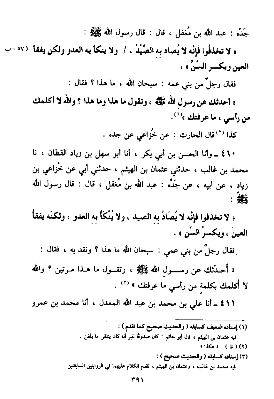 وَأَنَا الْحَسَنُ بْنُ أَبِي بَكْرٍ , أنا أَبُو سَهْلِ بْنُ زِيَادٍ الْقَطَّانُ , نا مُحَمَّدُ بْنُ غَالِبٍ , حَدَّثَنِي عُثْمَانُ بْنُ الْهَيْثَمِ , حَدَّثَنِي أَبِي , عَنْ خُزَاعِيِّ بْنِ زِيَادٍ , عَنْ أَبِيهِ , عَنْ جَدِّهِ عَبْدِ اللَّهِ بْنِ مُغَفَّلٍ , قَالَ: قَالَ رَسُولُ اللَّهِ صَلَّى اللهُ عَلَيْهِ وَسَلَّمَ: «لَا تَخْذِفُوا فَإِنَّهُ لَا يُصَادُ بِهِ الصَّيْدُ , وَلَا يُنْكَأُ بِهِ الْعَدُوُّ , وَلَكِنَّهُ يَفْقَأُ الْعَيْنَ وَيَكْسِرُ السِّنَّ» فَقَالَ رَجُلٌ مِنْ بَنِي عَمِّي: سُبْحَانَ اللَّهِ مَا هَذَا؟ وَنَقَدَ بِهِ , فَقَالَ: أُحَدِّثُكَ عَنْ رَسُولِ اللَّهِ صَلَّى اللهُ عَلَيْهِ وَسَلَّمَ , وَتَقُولُ مَا هَذَا مَرَّتَيْنِ؟ وَاللَّهِ لَا أُكَلِّمُكَ بِكَلِمَةٍ مِنْ رَأْسِي مَا عَرَفْتُكَ