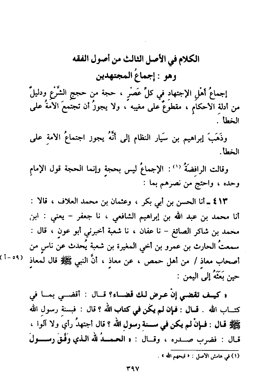 الْكَلَامُ فِي الْأَصْلِ الثَّالِثِ مِنْ أُصُولِ الْفِقْهِ وَهُوَ: إِجْمَاعُ الْمُجْتَهِدِينَ إِجْمَاعُ أَهْلِ الِاجْتِهَادِ فِي كُلِّ عَصْرٍ حُجَّةٌ مِنْ حِجَجِ الشَّرْعِ وَدَلِيلٌ مِنْ أَدِلَّةِ الْأَحْكَامِ , مَقْطُوعٌ عَلَى مَغِيبِهِ , وَلَا يَجُوزُ أَنْ تَجْتَمِعَ الْأُمَّةُ عَلَى الْخَطَأِ وَذَهَبَ إِبْرَاهِيمُ بْنُ سَيَّارٍ النَّظَّامُ إِلَى أَنَّهُ يَجُوزُ اجْتِمَاعُ الْأُمَّةِ عَلَى الْخَطَأِ وَقَالَتِ الرَّافِضَةُ: الْإِجْمَاعُ لَيْسَ بِحُجَّةٍ , وَإِنَّمَا الْحُجَّةُ قَوْلُ الْإِمَامِ وَحْدَهُ ,