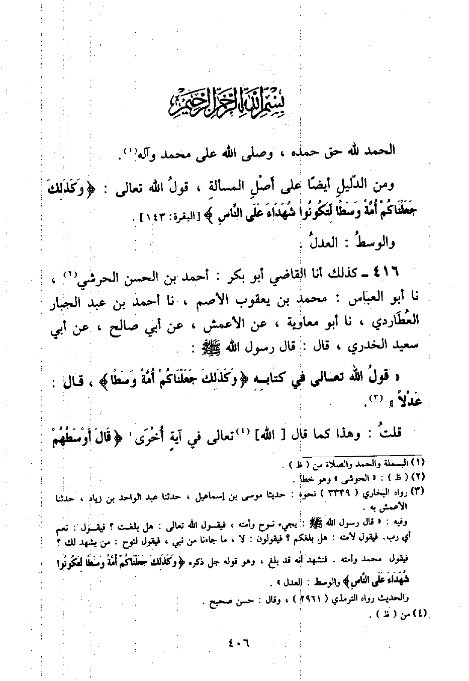 كَذَلِكَ أنا الْقَاضِي أَبُو بَكْرٍ , أَحْمَدُ بْنُ الْحَسَنِ الْحَرَشِيُّ , نا أَبُو الْعَبَّاسِ , مُحَمَّدُ بْنُ يَعْقُوبَ الْأَصَمُّ , نا أَحْمَدُ بْنُ عَبْدِ الْجَبَّارِ الْعُطَارِدِيُّ , نا أَبُو مُعَاوِيَةَ , عَنِ الْأَعْمَشِ , عَنْ أَبِي صَالِحٍ , عَنْ أَبِي سَعِيدٍ الْخُدْرِيِّ , قَالَ: قَالَ رَسُولُ اللَّهِ صَلَّى اللهُ عَلَيْهِ وَسَلَّمَ: " قَوْلُ اللَّهِ تَعَالَى فِي كِتَابِهِ {وَكَذَلِكَ جَعَلْنَاكُمْ أُمَّةً وَسَطًا} [البقرة: ١٤٣] قَالَ: عَدْلًا " قُلْتُ: وَهَذَا كَمَا قَالَ اللَّهُ تَعَالَى فِي آيَةٍ أُخْرَى {قَالَ أَوْسَطُهُمْ ⦗٤٠٧⦘ أَلَمْ أَقُلْ لَكُمْ لَوْلَا تُسَبِّحُونَ} [القلم: ٢٨]