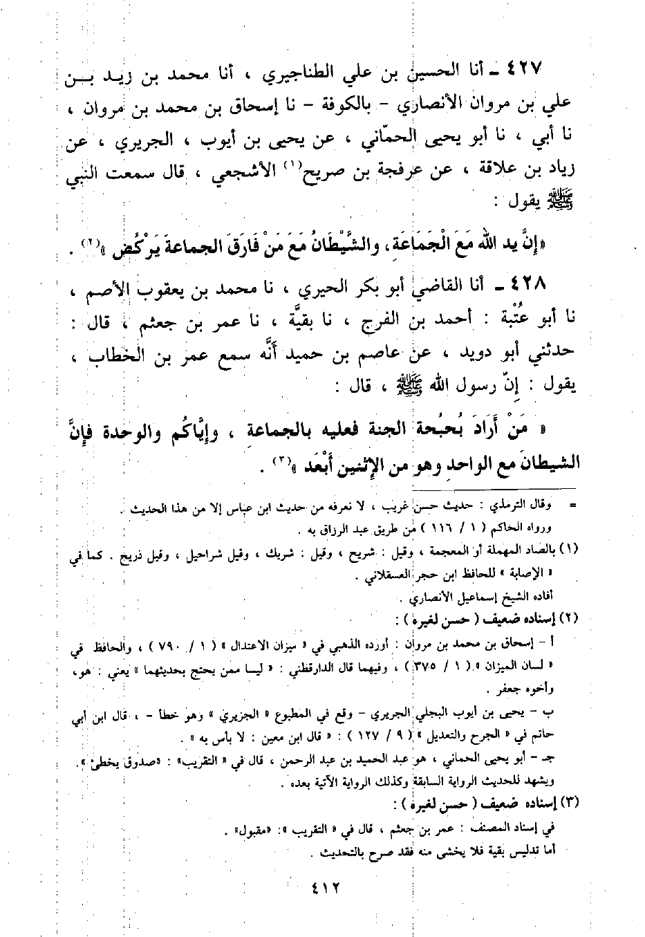 أنا الْحُسَيْنُ بْنُ عَلِيٍّ الطَّنَاجِيرِيُّ , أنا مُحَمَّدُ بْنُ زَيْدِ بْنِ عَلِيِّ بْنِ مَرْوَانَ الْأَنْصَارِيُّ , - بِالْكُوفَةِ - نا إِسْحَاقُ بْنُ مُحَمَّدِ بْنِ مَرْوَانَ , نا أَبِي , نا أَبُو يَحْيَى الْحِمَّانِيُّ , عَنْ يَحْيَى بْنِ أَيُّوبَ الْجَرِيرِيِّ , عَنْ زِيَادِ بْنِ عِلَاقَةَ , عَنْ عَرْفَجَةَ بْنِ ضَرِيحٍ الْأَشْجَعِيِّ , قَالَ: سَمِعْتُ النَّبِيَّ صَلَّى اللهُ عَلَيْهِ وَسَلَّمَ يَقُولُ: «إِنَّ يَدَ اللَّهِ مَعَ الْجَمَاعَةِ , وَالشَّيْطَانُ مَعَ مَنْ فَارَقَ الْجَمَاعَةَ يَرْكُضُ»