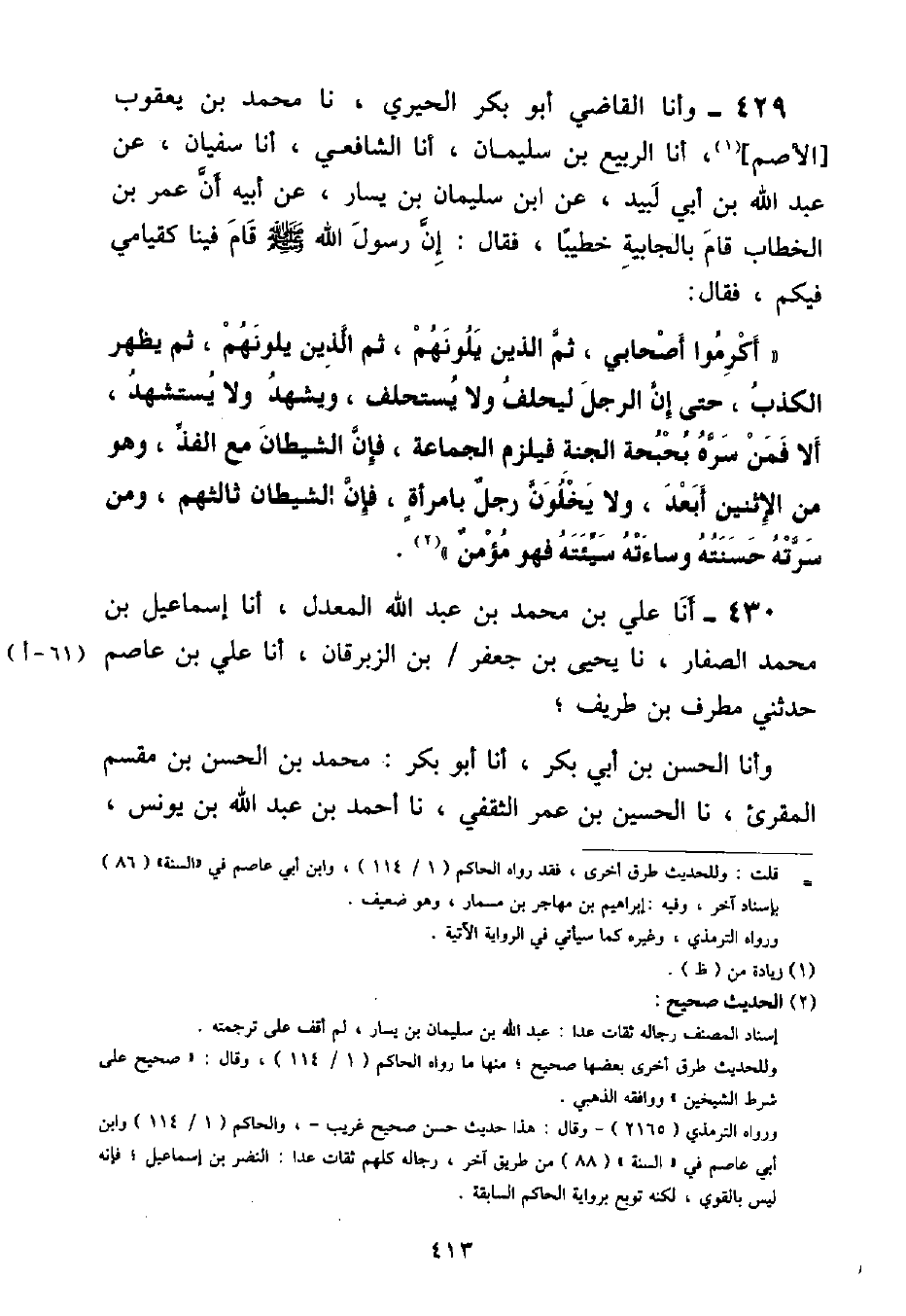 وَأَنَا الْقَاضِي أَبُو بَكْرٍ الْحِيرِيُّ , نا مُحَمَّدُ بْنُ يَعْقُوبَ الْأَصَمُّ , أنا الرَّبِيعُ بْنُ سُلَيْمَانَ , أنا الشَّافِعِيُّ , أنا سُفْيَانُ , عَنْ عَبْدِ اللَّهِ بْنِ أَبِي لَبِيدٍ , عَنِ ابْنِ سُلَيْمَانَ بْنِ يَسَارٍ , عَنْ أَبِيهِ , أَنَّ عُمَرَ بْنَ الْخَطَّابِ , قَامَ بِالْجَابِيَةِ خَطِيبًا , فَقَالَ: إِنَّ رَسُولَ اللَّهِ صَلَّى اللهُ عَلَيْهِ وَسَلَّمَ قَامَ فِينَا كَقِيَامِي فِيكُمْ , فَقَالَ: «أَكْرِمُوا أَصْحَابِي , ثُمَّ الَّذِينَ يَلُونَهُمْ , ثُمَّ الَّذِينَ يَلُونَهُمْ , ثُمَّ يَظْهَرُ الْكَذِبُ , حَتَّى إِنَّ الرَّجُلَ لِيَحْلِفُ وَلَا يُسْتَحْلَفُ , وَيَشْهَدُ وَلَا يُسْتَشْهَدُ , أَلَا فَمَنْ سَرَّهُ بَحْبَحَةُ الْجَنَّةِ فَيَلْزَمُ الْجَمَاعَةَ , فَإِنَّ الشَّيْطَانَ مَعَ الْفَذِّ , وَهُوَ مِنَ الِاثْنَيْنِ أَبْعَدُ , وَلَا يَخْلُوَنَّ رَجُلٌ بِامْرَأَةٍ , فَإِنَّ الشَّيْطَانَ ثَالِثُهُمْ , وَمَنْ سَرَّتْهُ حَسَنَتُهُ وَسَاءَتْهُ سَيِّئَتُهُ فَهُوَ مُؤْمِنٌ»