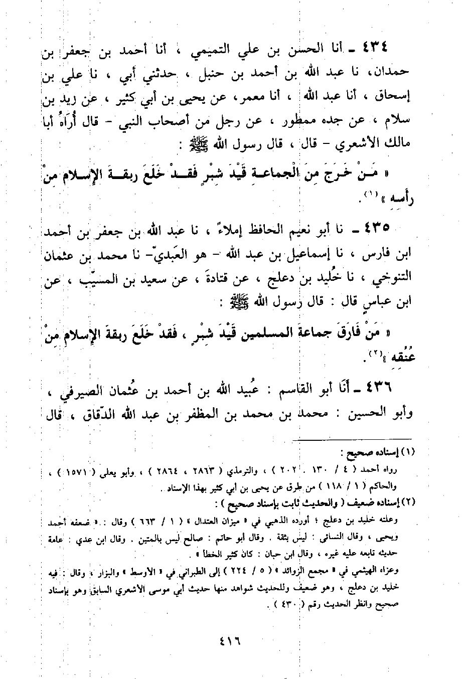 أنا الْحَسَنُ بْنُ عَلِيٍّ التَّمِيمِيُّ , أنا أَحْمَدُ بْنُ جَعْفَرِ بْنِ حَمْدَانَ , نا عَبْدُ اللَّهِ بْنُ أَحْمَدَ بْنِ حَنْبَلٍ , حَدَّثَنِي أَبِي , نا عَلِيُّ بْنُ إِسْحَاقَ , أنا عَبْدُ اللَّهِ , أنا مَعْمَرٌ , عَنْ يَحْيَى بْنِ أَبِي كَثِيرٍ , عَنْ زَيْدِ بْنِ سَلَّامٍ , عَنْ جَدِّهِ مَمْطُورٍ , عَنْ رَجُلٍ , مِنْ أَصْحَابِ النَّبِيِّ - قَالَ أُرَاهُ أَبَا مَالِكٍ الْأَشْعَرِيَّ - قَالَ قَالَ رَسُولُ اللَّهِ صَلَّى اللهُ عَلَيْهِ وَسَلَّمَ: «مَنْ خَرَجَ مِنَ الْجَمَاعَةِ قِيدَ شِبْرٍ فَقَدْ خَلَعَ رِبْقَةَ الْإِسْلَامِ مِنْ رَأْسِهِ»