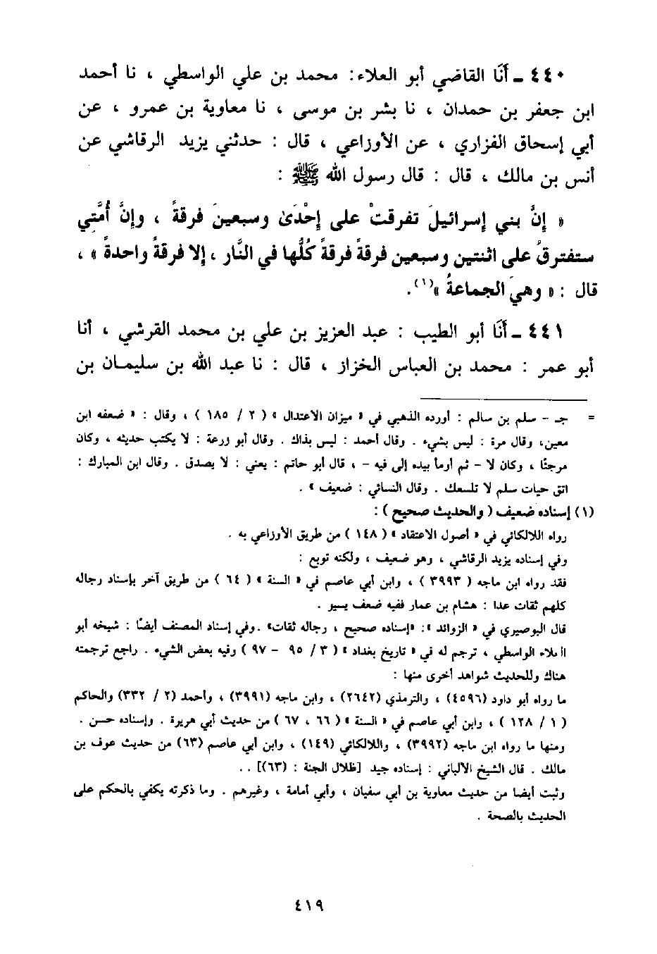 أنا الْقَاضِي أَبُو الْعَلَاءِ , مُحَمَّدُ بْنُ عَلِيٍّ الْوَاسِطِيُّ , نا أَحْمَدُ بْنُ جَعْفَرِ بْنِ حَمْدَانَ , نا بِشْرُ بْنُ مُوسَى , نا مُعَاوِيَةُ بْنُ عَمْرٍو , عَنْ أَبِي إِسْحَاقَ الْفَزَارِيِّ , عَنِ الْأَوْزَاعِيِّ , قَالَ: حَدَّثَنِي يَزِيدُ الرَّقَاشِيُّ , عَنْ أَنَسِ بْنِ مَالِكٍ , قَالَ: قَالَ رَسُولُ اللَّهِ صَلَّى اللهُ عَلَيْهِ وَسَلَّمَ: «إِنَّ بَنِي إِسْرَائِيلَ تَفَرَّقَتْ عَلَى إِحْدَى وَسَبْعِينَ فِرْقَةً , وَإِنَّ أُمَّتِي سَتَفْتَرِقُ عَلَى اثْنَتَيْنِ وَسَبْعِينَ فِرْقَةً كُلُّهَا فِي النَّارِ , إِلَّا فِرْقَةٌ وَاحِدَةٌ» قَالَ: «وَهِيَ الْجَمَاعَةُ»