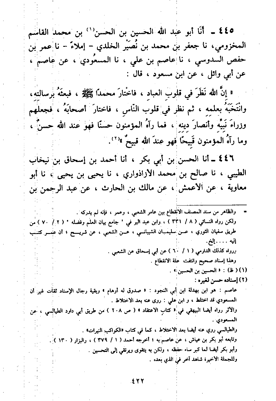 أنا أَبُو عَبْدِ اللَّهِ الْحُسَيْنُ بْنُ الْحَسَنِ بْنِ مُحَمَّدٍ الْقَاسِمُ الْمَخْزُومِيُّ , نا جَعْفَرُ بْنُ مُحَمَّدِ بْنِ نُصَيْرٍ الْخُلْدِيُّ , - إِمْلَاءً - نا عُمَرُ بْنُ حَفْصٍ السَّدُوسِيُّ , نا عَاصِمُ بْنُ عَلِيٍّ , نا الْمَسْعُودِيُّ , عَنْ عَاصِمٍ , عَنْ أَبِي وَائِلٍ , عَنِ ابْنِ مَسْعُودٍ , قَالَ: «إِنَّ اللَّهَ نَظَرَ فِي قُلُوبِ الْعِبَادِ , فَاخْتَارَ مُحَمَّدًا صَلَّى اللهُ عَلَيْهِ وَسَلَّمَ , فَبَعَثَهُ بِرِسَالَتِهِ , وَانْتَخَبَهُ بِعِلْمِهِ , ثُمَّ نَظَرَ فِي قُلُوبِ النَّاسِ , فَاخْتَارَ أَصْحَابَهُ , فَجَعَلَهُمْ وزَرَاءَ نَبِيِّهِ وَأَنْصَارَ دِينِهِ , فَمَا رَآهُ الْمُؤْمِنُونَ حَسَنًا فَهُوَ عِنْدَ اللَّهِ حَسَنٌ , وَمَا رَآهُ الْمُؤْمِنُونَ قَبِيحًا فَهُوَ عِنْدَ اللَّهِ قَبِيحٌ»