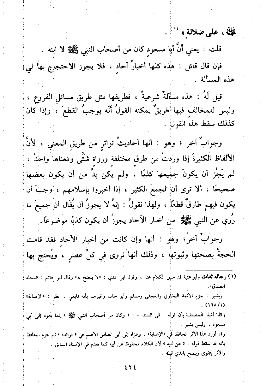 عَلَى ضَلَالَةٍ» قُلْتُ: يَعْنِي أَنَّ أَبَا مَسْعُودٍ كَانَ مِنْ أَصْحَابِ النَّبِيِّ صَلَّى اللهُ عَلَيْهِ وَسَلَّمَ لَا ابْنُهُ فَإِنْ قَالَ قَائِلٌ: هَذِهِ كُلَّهَا أَخْبَارُ آحادٍ , فَلَا يَجُوزُ الِاحْتِجَاجُ بِهَا فِي هَذِهِ الْمَسْأَلَةِ قِيلَ لَهُ: هَذِهِ مَسْأَلَةٌ شَرْعِيَّةٌ , فَطَرِيقُهَا مِثْلُ طَرِيقِ مَسَائِلَ الْفُرُوعِ , وَلَيْسَ لِلْمُخَالِفِ فِيهَا طَرِيقٌ يُمْكِنْهُ الْقَوْلُ أَنَّهُ يُوجِبُ الْقَطْعَ , وَإِذَا كَانَ كَذَلِكَ سَقَطَ هَذَا الْقَوْلُ وَجَوَابٌ آخَرُ , وَهُوَ: أَنَّهَا أَحَادِيثُ تَوَاتُرٍ مِنْ طَرِيقِ الْمَعْنَى , لِأَنَّ الْأَلْفَاظَ الْكَثِيرَةَ إِذَا وَرَدَتْ مِنْ طُرُقٍ مُخْتَلِفَةٍ وَرَوَاهُ شَتَّى ومَعْنَاهَا وَاحِدٌ , لَمْ يَجُزْ أَنْ يَكُونَ جَمِيعُهَا كَذِبًا , وَلَمْ يَكُنْ بُدٌّ مِنْ أَنْ يَكُونَ بَعْضُهَا صَحِيحًا , أَلَا تَرَى أَنَّ الْجَمْعَ الْكَثِيرَ , إِذَا أَخْبِرُوا بِإِسْلَامِهِمْ , وَجَبَ أَنْ يَكُونَ فِيهِمْ طَارِقٌ قَطْعًا , وَلِهَذَا نَقُولُ: إِنَّهُ لَا يَجُوزُ أَنْ يُقَالَ أَنَّ جَمِيعَ مَا رُوِيَ عَنِ النَّبِيِّ صَلَّى اللهُ عَلَيْهِ وَسَلَّمَ مِنْ أَخْبَارِ الْآحَادِ يَجُوزُ أَنْ يَكُونَ كَذِبًا مَوْضُوعًا وَجَوَابٌ آخَرُ , وَهُوَ: أَنَّهَا وَإِنْ كَانَتْ مِنْ أَخْبَارِ الْآحَادِ فَقَدْ قَامَتِ الْحُجَّةُ بِصِحَّتِهَا وَثُبُوتِهَا , وَذَلِكَ أَنَّهَا تُرْوَى فِي كُلِّ عَصْرٍ , وَيُحْتَجُّ بِهَا