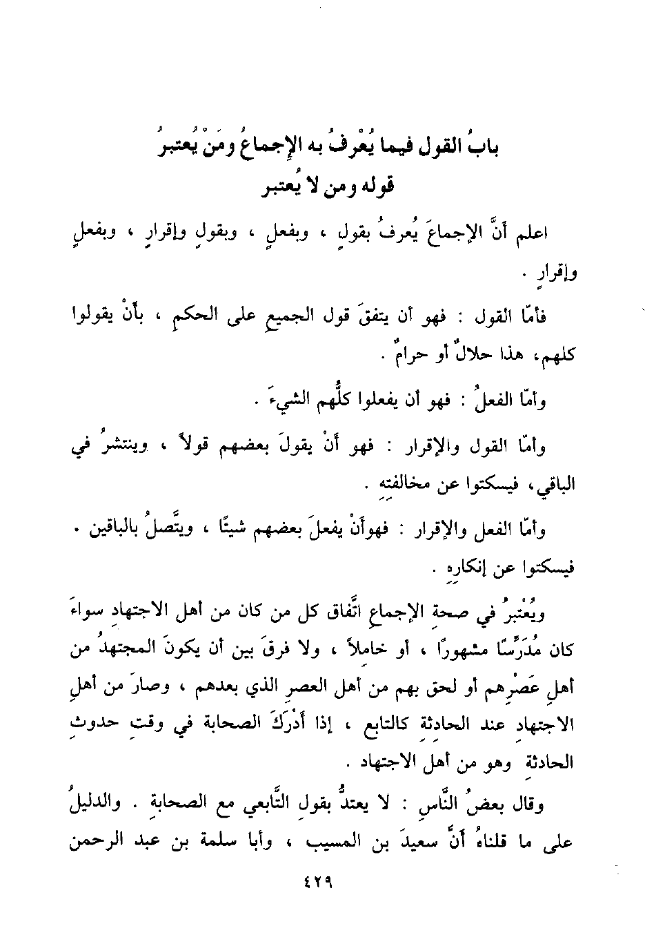بَابُ الْقَوْلِ فِيمَا يُعْرَفُ بِهِ الْإِجْمَاعُ وَمَنْ يُعْتَبَرُ قَوْلُهُ وَمَنْ لَا يُعْتَبَرُ اعْلَمْ أَنَّ الْإِجْمَاعَ يُعْرَفُ بِقَوْلٍ , وَبِفِعْلٍ , وَبُقُولٍ وَإِقْرَارٍ , وَبِفِعْلٍ وَإِقْرَارٍ فَأَمَّا الْقَوْلُ: فَهُوَ أَنْ يَتَّفِقَ قَوْلُ الْجَمِيعِ عَلَى الْحُكْمِ , بِأَنْ يَقُولُوا كُلُّهُمْ , هَذَا حَلَالٌ أَوْ حَرَامٌ وَأَمَّا الْفِعْلُ: فَهُوَ أَنْ يَفْعَلُوا كُلُّهُمُ الشَّيْءَ وَأَمَّا الْقَوْلُ وَالْإِقْرَارُ: فَهُوَ أَنْ يَقُولَ بَعْضُهُمْ قَوْلًا , وَيَنْتَشِرُ فِي الْبَاقِي , فَيَسْكُتُوا عَنْ مُخَالَفَتِهِ وَأَمَّا الْفِعْلُ وَالْإِقْرَارُ: فَهُوَ أَنْ يَفْعَلَ بَعْضُهُمْ شَيْئًا , وَيَتَّصِلُ بِالْبَاقِينَ فَيَسْكُتُوا عَنْ إِنْكَارِهِ وَيُعْتَبَرُ فِي صِحَّةِ الْإِجْمَاعِ اتِّفَاقُ كُلِّ مَنْ كَانَ مِنْ أَهْلِ الِاجْتِهَادِ سَوَاءً كَانَ مُدَرِّسًا مَشْهُورًا , أَوْ خَامِلًا , وَلَا فَرْقَ بَيْنَ أَنْ يَكُونَ الْمُجْتَهِدُ مِنْ أَهْلِ عَصْرِهِمْ أَوْ لَحِقَ بِهِمْ مِنْ أَهْلِ الْعَصْرِ الَّذِي بَعْدَهُمْ , وَصَارَ مِنْ أَهْلِ الِاجْتِهَادِ عِنْدَ الْحَادِثَةِ كَالتَّابِعِ , إِذَا أَدْرَكَ الصَّحَابَةَ فِي وَقْتِ حُدُوثِ الْحَادِثَةِ وَهُوَ مِنْ أَهْلِ الِاجْتِهَادِ وَقَالَ بَعْضُ النَّاسِ: لَا يُعْتَدُّ بِقَوْلِ التَّابِعِيِّ مَعَ الصَّحَابَةِ وَالدَّلِيلُ عَلَى مَا قُلْنَاهُ أَنَّ سَعِيدَ بْنَ الْمُسَيِّبِ , وأَبَا سَلَمَةَ بْنَ عَبْدِ الرَّحْمَنِ