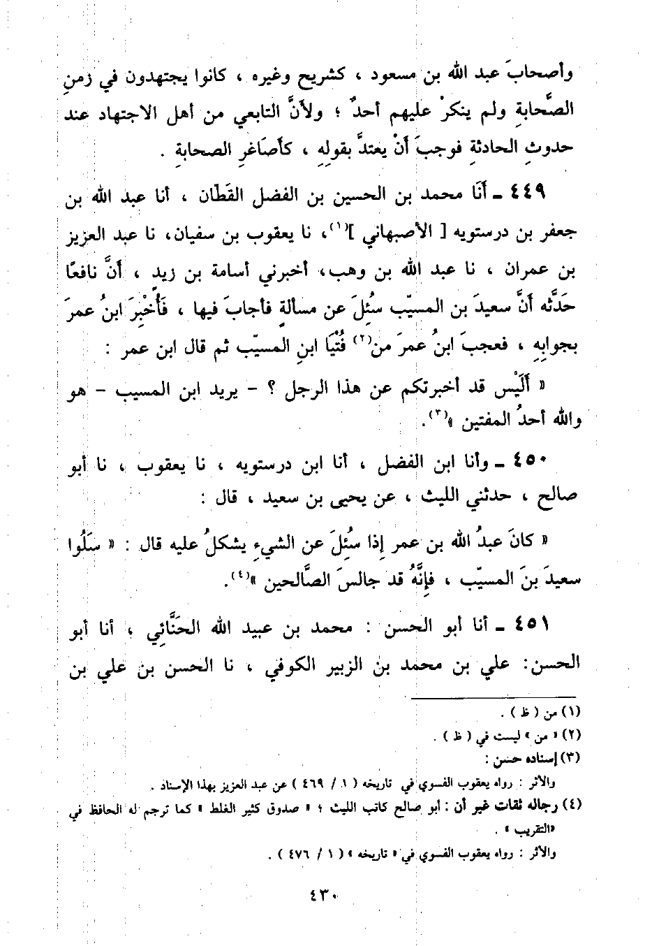 أنا مُحَمَّدُ بْنُ الْحُسَيْنِ بْنِ الْفَضْلِ الْقَطَّانُ , أنا عَبْدُ اللَّهِ بْنُ جَعْفَرِ بْنِ دَرَسْتُوَيْهِ الْأَصْبَهَانِيُّ , نا يَعْقُوبُ بْنُ سُفْيَانَ , نا عَبْدُ الْعَزِيزِ بْنُ عِمْرَانَ , نا عَبْدُ اللَّهِ بْنُ وَهْبٍ , أَخْبَرَنِي أُسَامَةُ بْنُ زَيْدٍ , أَنَّ نَافِعًا , حَدَّثَهُ أَنَّ سَعِيدَ بْنَ الْمُسَيِّبِ سُئِلَ عَنْ مَسْأَلَةٍ , فَأَجَابَ فِيهَا , فَأُخْبِرَ ابْنُ عُمَرَ , بِجَوَابِهِ , فَعَجِبَ ابْنُ عُمَرَ مِنْ فُتْيَا ابْنِ الْمُسَيِّبِ ثُمَّ قَالَ ابْنُ عُمَرَ: «أَلَيْسَ قَدْ أَخْبَرْتُكُمْ عَنْ هَذَا الرَّجُلِ؟» - يُرِيدُ ابْنَ الْمُسَيِّبِ - «هُوَ وَاللَّهِ أَحَدُ الْمُفْتِينَ»