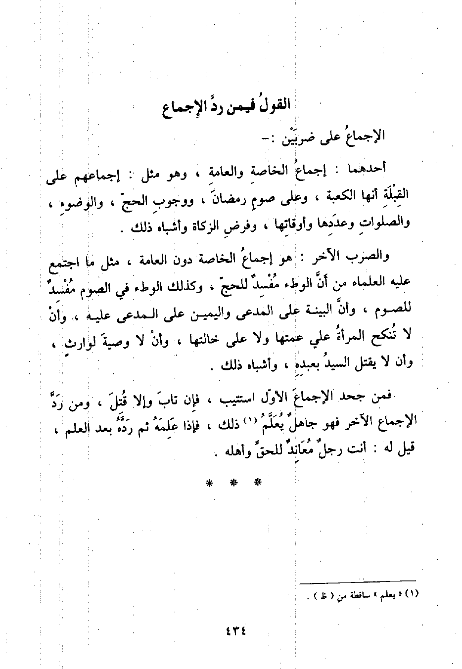 الْقَوْلُ فِيمَنْ رَدَّ الْإِجْمَاعَ الْإِجْمَاعُ عَلَى ضَرْبَيْنِ: - أَحَدُهُمَا: إِجْمَاعُ الْخَاصَّةِ وَالْعَامَّةِ , وَهُوَ مِثْلُ: إِجْمَاعِهِمْ عَلَى الْقِبْلَةِ أَنَّهَا الْكَعْبَةُ , وَعَلَى صَوْمِ رَمَضَانَ , وَوُجُوبِ الْحَجِّ , وَالْوُضُوءِ , وَالصَّلَوَاتِ وَعَدَدِهَا وَأَوْقَاتِهَا , وَفَرْضِ الزَّكَاةِ وَأَشْبَاهِ ذَلِكَ وَالضَّرْبُ الْآخَرُ: هُوَ إِجْمَاعُ الْخَاصَّةِ دُونَ الْعَامَّةِ , مِثْلُ مَا اجْتَمَعَ عَلَيْهِ الْعُلَمَاءُ مِنْ أَنَّ الْوَطْءَ مُفْسِدٌ لِلْحَجِّ , وَكَذَلِكَ الْوَطْءُ فِي الصَّوْمِ مُفْسِدٌ لِلصَّوْمٍ , وَأَنَّ الْبَيِّنَةَ عَلَى الْمُدَّعِي وَالْيَمِينَ عَلَى الْمُدَّعَى عَلَيْهِ , وَأَنْ لَا تُنْكَحُ الْمَرْأَةُ عَلَى عَمَّتِهَا وَلَا عَلَى خَالَتِهَا , وَأَنْ لَا وَصِيَّةَ لِوَارِثٍ , وَأَنْ لَا يُقْتَلَ السَّيِّدُ بِعَبْدِهِ , وَأَشْبَاهِ ذَلِكَ فَمَنْ جَحَدَ الْإِجْمَاعَ الْأَوَّلَ اسْتُتِيبَ , فَإِنْ تَابَ وَإِلَّا قُتِلَ , وَمَنْ رَدَّ الْإِجْمَاعَ الْآخَرَ فَهُوَ جَاهِلٌ يَعْلَمُ ذَلِكَ , فَإِذَا عَلِمَهُ ثُمَّ رَدَّهُ بَعْدَ الْعِلْمِ , قِيلَ لَهُ: أَنْتَ رَجُلٌ مُعَانِدٌ لِلْحَقِّ وَأَهْلِهِ