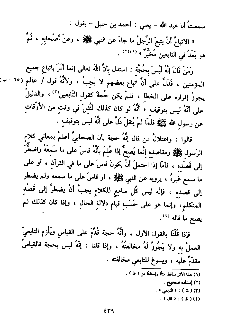 : سَمِعْتُ أَبَا عَبْدِ اللَّهِ يَعْنِي أَحْمَدَ بْنَ حَنْبَلٍ يَقُولُ: «الِاتِّبَاعُ أَنْ يَتَّبِعَ الرَّجُلُ , مَا جَاءَ عَنِ النَّبِيِّ صَلَّى اللهُ عَلَيْهِ وَسَلَّمَ , وَعَنْ أَصْحَابِهِ , ثُمَّ هُوَ بَعْدُ فِي التَّابِعِينَ مُخَيَّرٌ» وَمَنْ قَالَ إِنَّهُ لَيْسَ بِحُجَّةٍ اسْتَدَّلَ بِأَنَّ اللَّهَ تَعَالَى إِنَّمَا أَمَرَ بِاتِّبَاعِ جَمِيعِ الْمُؤْمِنِينَ , فَدَلَّ عَلَى أَنَّ اتِّبَاعَ بَعْضِهِمْ لَا يَجِبُ , وَلِأَنَّهُ قَوْلُ عَالِمٍ يَجُوزُ إِقْرَارُهُ عَلَى الْخَطَأِ , فَلَمْ يَكُنْ حُجَّةً كَقَوْلِ التَّابِعِينَ , وَالدَّلِيلُ عَلَى أَنَّهُ لَيْسَ بِتَوْقِيفٍ , أَنَّهُ لَوْ كَانَ كَذَلِكَ لَنُقِلَ فِي وَقْتٍ مِنَ الْأَوْقَاتِ عَنْ رَسُولِ اللَّهِ صَلَّى اللهُ عَلَيْهِ وَسَلَّمَ فَلَمَّا لَمْ يُنْقَلْ دَلَّ عَلَى أَنَّهُ لَيْسَ بِتَوْقِيفٍ قَالُوا: وَاعْتِلَالُ مَنْ قَالَ إِنَّهُ حُجَّةٌ بِأَنَّ الصَّحَابِيَّ أَعْلَمُ بِمَعَانِي كَلَامِ الرَّسُولِ صَلَّى اللهُ عَلَيْهِ وَسَلَّمَ وَمَقَاصِدِهِ إِنَّمَا يَصِحُّ إِذَا عَلِمَ بِأَنَّهُ قَاسَ عَلَى مَا سَمِعَهُ وَاضْطُرَّ إِلَى قَصْدِهِ , فَأَمَّا إِذَا احْتَمَلَ أَنْ يَكُونَ قَاسَ عَلَى مَا فِي الْقُرْآنِ , أَوْ عَلَى مَا سَمِعَ غَيْرَهُ يَرْوِيهِ عَنِ النَّبِيِّ صَلَّى اللهُ عَلَيْهِ وَسَلَّمَ , أَوْ قَاسَ عَلَى مَا سَمِعَهُ وَلَمْ يُضْطَرَّ إِلَى قَصْدِهِ , فَإِنَّهُ لَيْسَ كُلُّ سَامِعٍ لِلْكَلَامِ يَجِبُ أَنْ يُضْطَرَّ إِلَى قَصْدِ الْمُتَكَلِّمِ , وَإِنَّمَا هُوَ عَلَى حَسَبِ قِيَامِ دَلَالَةِ الْحَالِ , وَإِذَا كَانَ كَذَلِكَ لَمْ يَصِحَّ مَا قَالَهُ فَإِذَا قُلْنَا بِالْقَوْلِ الْأَوَّلِ , وَأَنَّهُ حُجَّةٌ قُدِّمَ عَلَى الْقِيَاسِ وَيَلْزَمُ التَّابِعِيَّ الْعَمَلُ بِهِ وَلَا يَجُوزُ لَهُ مُخَالَفَتُهُ , وَإِذَا قُلْنَا: إِنَّهُ لَيْسَ بِحُجَّةٍ فَالْقِيَاسُ مُقَدَّمٌ عَلَيْهِ , وَيُسَوِّغُ لِلتَّابِعِيِّ مُخَالَفَتُهُ