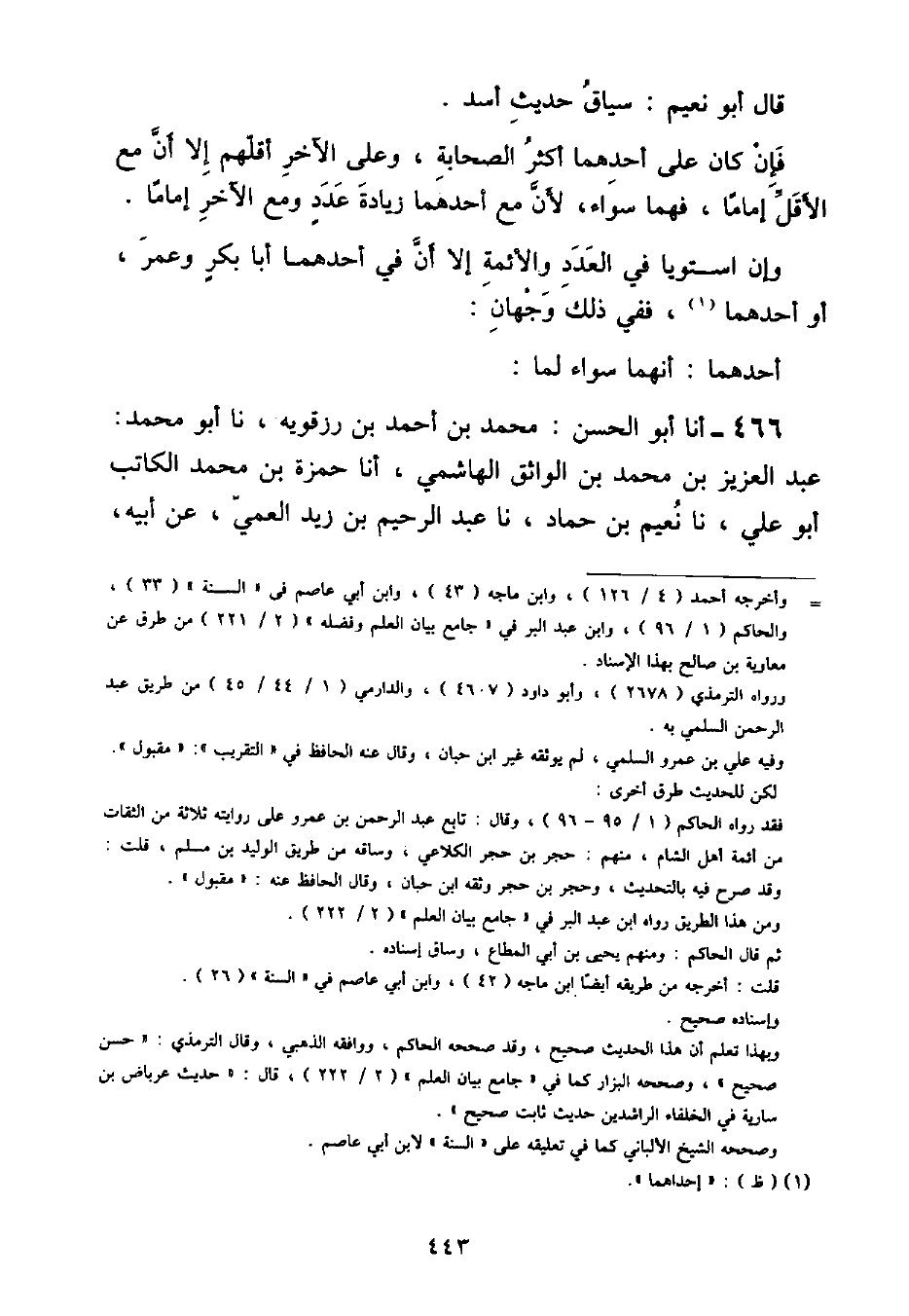 أنا أَبُو الْحَسَنِ , مُحَمَّدُ بْنُ أَحْمَدَ بْنِ رِزْقَوَيْهِ , نا أَبُو مُحَمَّدٍ عَبْدُ الْعَزِيزِ بْنُ مُحَمَّدِ بْنِ الْوَاثِقِ الْهَاشِمِيُّ , أنا حَمْزَةُ بْنُ مُحَمَّدٍ الْكَاتِبُ أَبُو عَلِيٍّ , نا نُعَيْمُ بْنُ حَمَّادٍ , نا عَبْدُ الرَّحِيمِ بْنُ زَيْدٍ الْعَمِّيُّ , عَنْ أَبِيهِ , ⦗٤٤٤⦘ عَنْ سَعِيدِ بْنِ الْمُسَيِّبِ , عَنْ عُمَرَ بْنِ الْخَطَّابِ , قَالَ: قَالَ رَسُولُ اللَّهِ صَلَّى اللهُ عَلَيْهِ وَسَلَّمَ: سَأَلْتُ رَبِّي تَعَالَى فِيمَا اخْتَلَفَ فِيهِ أَصْحَابِي مِنْ بَعْدِي , فَأَوْحَى اللَّهُ إِلَيَّ: «يَا مُحَمَّدُ إِنَّ أَصْحَابَكَ عِنْدِي بِمَنْزِلَةِ النُّجُومِ فِي السَّمَاءِ بَعْضُهَا أَضْوَأُ مِنْ بَعْضٍ , فَمَنْ أَخَذَ بِشَيْءٍ مِمَّا هُمْ عَلَيْهِ مِنَ اخْتِلَافِهِمْ فَهُوَ عِنْدِي عَلَى هُدًى» وَالْوَجْهُ الثَّانِي: أَنَّ الْفَرِيقَ الَّذِي فِيهِ أَبُو بَكْرٍ وَعُمَرُ , أَوْ أَحَدُهُمَا أَوْلَى لِمَا