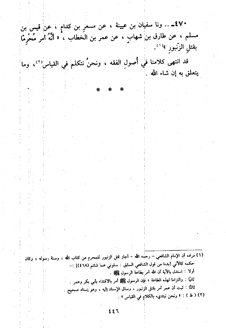 وَنَا سُفْيَانُ بْنُ عُيَيْنَةَ , عَنْ مِسْعَرِ بْنِ كِدَامٍ , عَنْ قَيْسِ بْنِ مُسْلِمٍ , عَنْ طَارِقِ بْنِ شِهَابٍ , عَنْ عُمَرَ بْنِ الْخَطَّابِ , «أَنَّهُ أَمَرَ مُحْرِمًا بِقَتْلِ الزُّنْبُورِ» قَدِ انْتَهَى كَلَامُنَا فِي أُصُولِ الْفِقْهِ , وَنَحْنُ نَتَكَلَّمُ فِي الْقِيَاسِ , وَمَا يَتَعَلَّقُ بِهِ إِنْ شَاءَ اللَّهُ