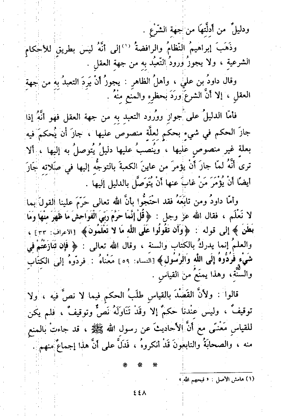 وَدَلِيلٌ مِنْ أَدِلَّتِهَا مِنْ جِهَةِ الشَّرْعِ وَذَهَبَ إِبْرَاهِيمُ النَّظَّامُ وَالرَّافِضَةُ إِلَى أَنَّهُ لَيْسَ بِطَرِيقٍ لِلْأَحْكَامِ الشَّرْعِيَّةِ , وَلَا يَجُوزُ وُرُودُ التَّعَبُّدِ بِهِ مِنْ جِهَةِ الْعَقْلِ وَقَالَ دَاوُدُ بْنُ عَلِيٍّ , وَأَهْلُ الظَّاهِرِ: يَجُوزُ أَنْ يُرَدَّ التَّعَبُّدُ بِهِ مِنْ جِهَةَ الْعَقْلِ , إِلَّا أَنَّ الشَّرْعَ وَرَدَ بِحَظْرِهِ وَالْمَنْعِ مِنْهُ فَأَمَّا الدَّلِيلُ عَلَى جَوَازِ وَوُرُودِ التَّعَبُّدِ بِهِ مِنْ جِهَةِ الْعَقْلِ فَهُوَ أَنَّهُ إِذَا جَازَ الْحُكْمُ فِي شَيْءٍ بِحُكْمٍ لِعِلَّةٍ مَنْصُوصٍ عَلَيْهَا , جَازَ أَنْ يُحْكَمَ فِيهِ بِعِلَّةٍ غَيْرِ مَنْصُوصٍ عَلَيْهَا , وَيُنْصَبُ عَلَيْهَا دَلِيلٌ يُتَوَصَّلُ بِهِ إِلَيْهَا , أَلَا تَرَى أَنَّهُ لَمَّا جَازَ أَنْ يُؤْمَرَ مَنْ عَايَنَ الْكَعْبَةَ بِالتَّوَجُّهِ إِلَيْهَا فِي صَلَاتِهِ جَازَ أَيْضًا أَنْ يُؤْمَرَ مَنْ غَابَ عَنْهَا أَنْ يَتَوَصَّلَ بِالدَّلِيلِ إِلَيْهَا وَأَمَّا دَاوُدُ وَمَنْ تَابَعَهُ فَقَدِ احْتَجُّوا بِأَنَّ اللَّهَ تَعَالَى حَرَّمَ عَلَيْنَا الْقَوْلَ بِمَا لَا نَعْلَمُ , فَقَالَ اللَّهُ عَزَّ وَجَلَّ: {قُلْ إِنَّمَا حَرَّمَ رَبِّيَ الْفَوَاحِشَ مَا ظَهَرَ مِنْهَا وَمَا بَطَنَ} [الأعراف: ٣٣] إِلَى قَوْلِهِ: {وَأَنْ تَقُولُوا عَلَى اللَّهِ مَا لَا تَعْلَمُونَ} [البقرة: ١٦٩] وَالْعِلْمُ إِنَّمَا يُدْرَكُ بِالْكِتَابِ وَالسُّنَّةِ , وَقَالَ اللَّهُ تَعَالَى: {فَإِنْ تَنَازَعْتُمْ فِي شَيْءٍ فَرُدُّوهُ إِلَى اللَّهِ وَالرَّسُولِ} [النساء: ٥٩] مَعْنَاهُ: فَرُدُّوهُ إِلَى الْكِتَابِ وَالسُّنَّةِ , وَهَذَا يَمْنَعُ مِنَ الْقِيَاسِ قَالُوا: وَلِأَنَّ الْقَصْدَ بِالْقِيَاسِ طَلَبُ الْحُكْمِ فِيمَا لَا نَصَّ فِيهِ , وَلَا تَوْقِيفَ , وَلَيْسَ عِنْدَنَا حُكْمٌ إِلَّا وَقَدْ تَنَاوَلَهُ نَصٌّ وَتَوْقِيفٌ , فَلَمْ يَكُنْ لِلْقِيَاسِ مَعْنًى مَعَ أَنَّ الْأَحَادِيثَ عَنْ رَسُولِ اللَّهِ صَلَّى اللهُ عَلَيْهِ وَسَلَّمَ قَدْ جَاءَتْ بِالْمَنْعِ مِنْهُ , وَالصَّحَابَةُ وَالتَّابِعُونَ قَدْ أَنْكَرُوهُ , فَدَلَّ عَلَى أَنَّ هَذَا إِجْمَاعٌ مِنْهُمْ