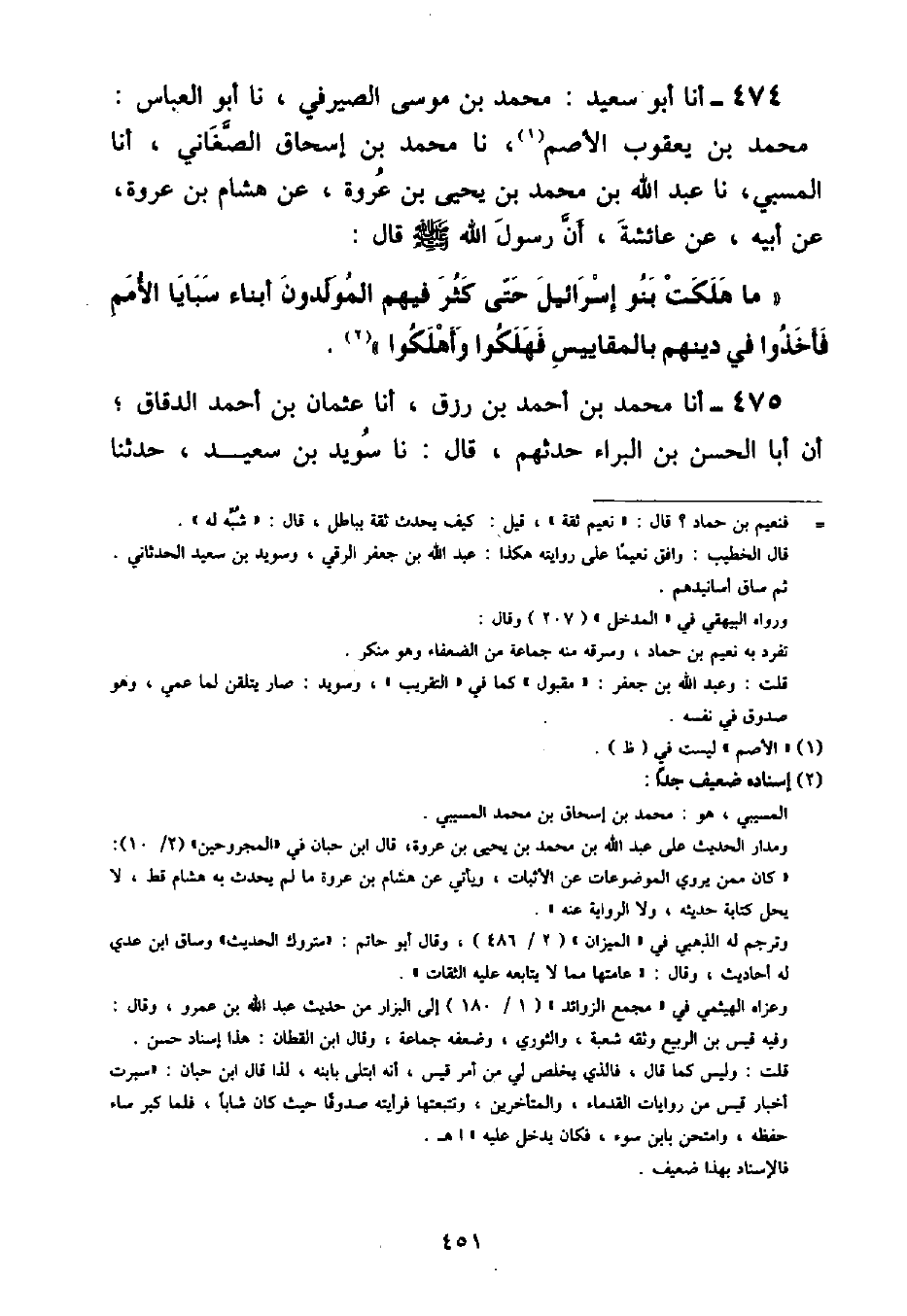 أنا أَبُو سَعِيدٍ مُحَمَّدُ بْنُ مُوسَى الصَّيْرَفِيُّ نا أَبُو الْعَبَّاسِ مُحَمَّدُ بْنُ يَعْقُوبَ الْأَصَمُّ نا مُحَمَّدُ بْنُ إِسْحَاقَ الصَّغَانِيُّ , أنا الْمَسْبِيُّ , نا عَبْدُ اللَّهِ بْنُ مُحَمَّدِ بْنِ يَحْيَى بْنِ عُرْوَةَ , عَنْ هِشَامِ بْنِ عُرْوَةَ , عَنْ أَبِيهِ , عَنْ عَائِشَةَ , أَنَّ رَسُولَ اللَّهِ صَلَّى اللهُ عَلَيْهِ وَسَلَّمَ قَالَ: «مَا هَلَكَتْ بَنُو إِسْرَائِيلَ حَتَّى كَثُرَ فِيهِمُ الْمُوَلَّدُونَ أَبْنَاءُ سَبَايَا الْأُمَمِ فَأَخَذُوا فِي دِينِهِمْ بِالْمَقَايِيسِ فَهَلَكُوا وَأَهْلَكُوا»